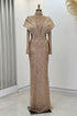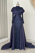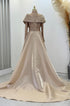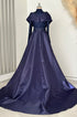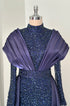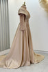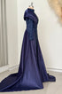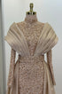Unser Abendkleidmodell Lima, das aus einem speziell entworfenen Stoff mit durchgehender Stickerei, plissierten Drapierungen an den Schultern und einer abnehmbaren langen Satinschleppe gefertigt ist, hat einen verdeckten Reißverschluss am Rücken und ist gefüttert.