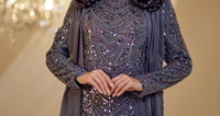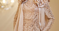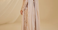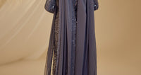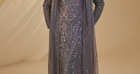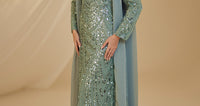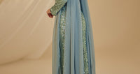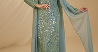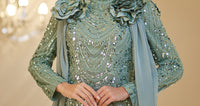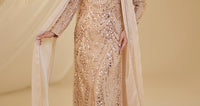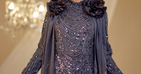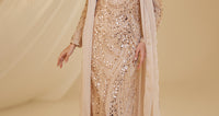 Unser perlenbesetztes Abendkleidmodell Mihrimah mit Blumenapplikationen an der Schulter und Cape hat einen verdeckten Reißverschluss am Rücken und ist gefüttert.