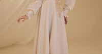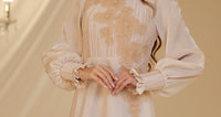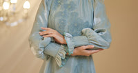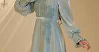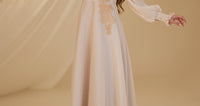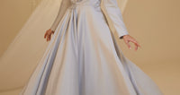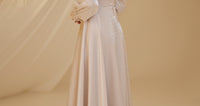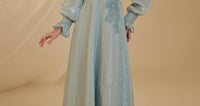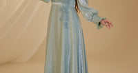 Unser Modell aus Satin-Nil-Abendkleid, das Ballonärmel, florale Stickereien im Oberteil und Details an den Handgelenken aufweist, hat einen verdeckten Reißverschluss am Rücken und ist gefüttert.