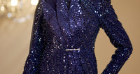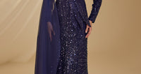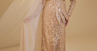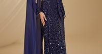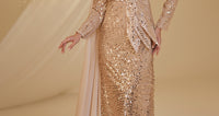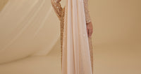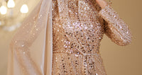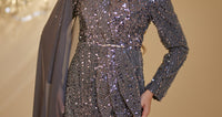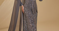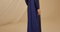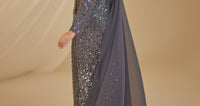 Unser Adel Hijab-Abendkleid-Modell, das über ein Tüllcape-Detail an der Schulter und ein Blattmuster auf der Vorderseite verfügt, ist vollständig aus perlenbesetztem Stoff gefertigt, hat einen verdeckten Reißverschluss am Rücken und ist gefüttert.