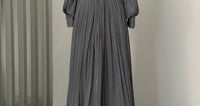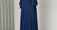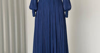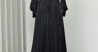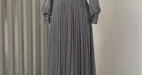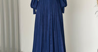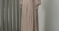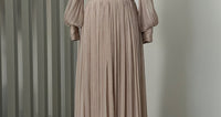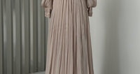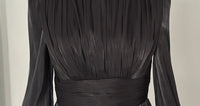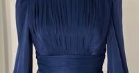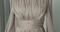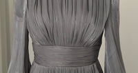 Our Hellas evening dress model, which is made of American chiffon fabric, has a belt detail at the waist and a balloon sleeve design, has a hidden zipper at the back and is lined.