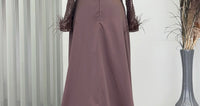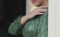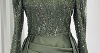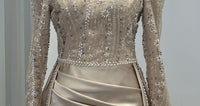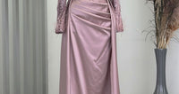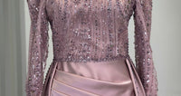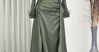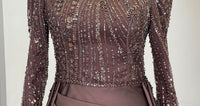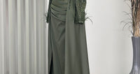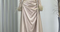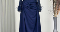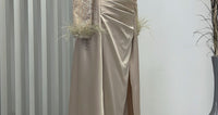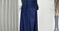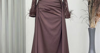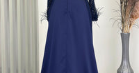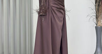 Our sherry evening dress model, with feather details on the sleeves and a fully embroidered cape and tail, is lined and has a hidden zipper at the back.
