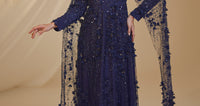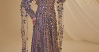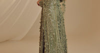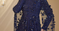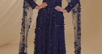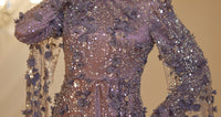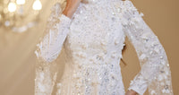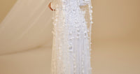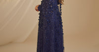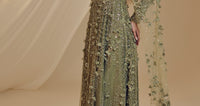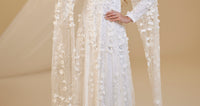 Les épaules avec détail de cape de notre modèle Afife sont entièrement ornées de détails de roses en 3D, avec une fermeture éclair cachée à l'arrière et une doublure.