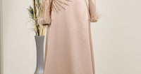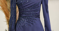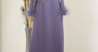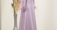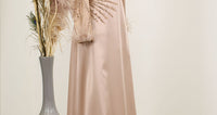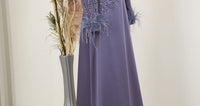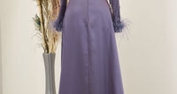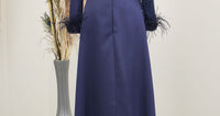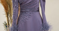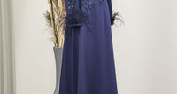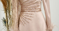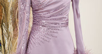 Les extrémités des manches sont détaillées de plumes, le devant est drapé et brodé, notre modèle de Robe Bianca possède une fermeture éclair cachée à l'arrière et est doublé.