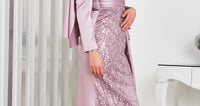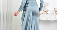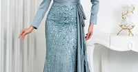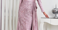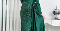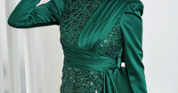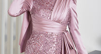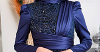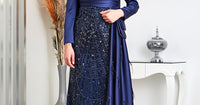 La partie avant est entièrement ornée de paillettes et de pierres, notre modèle de Robe Dicle a des détails de plumes sur la jupe cape, est doublé et possède une fermeture éclair cachée à l'arrière.