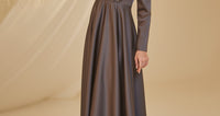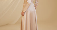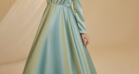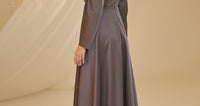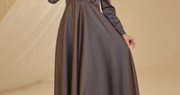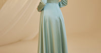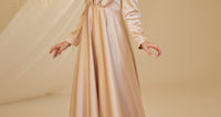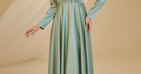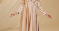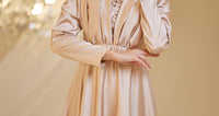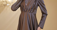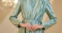 Notre modèle de Robe Elif en satin avec drapé devant et détails en perles a une jupe évasée, une fermeture éclair dissimulée à l'arrière et une doublure.