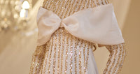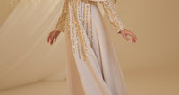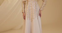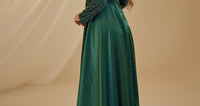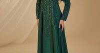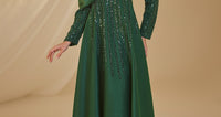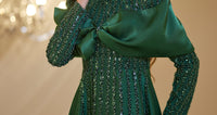 Le col montant et la partie supérieure sont ornés de perles, avec un détail de nœud sur l'épaule, notre modèle de Robe Fahriye est en tissu taffetas, doté d'une fermeture éclair cachée à l'arrière et est doublé.