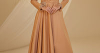 Notre modèle de Robe en satin turquoise avec broderie aux épaules, à la taille et aux poignets possède une fermeture éclair cachée à l'arrière et est doublé.