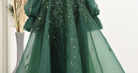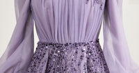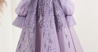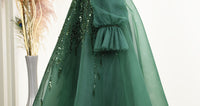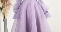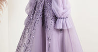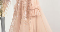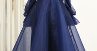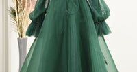 Notre modèle de Robe Modeste Patrice mi-longue bouffante avec applications sur le devant et les jupes se noue à l'arrière avec un cordon et est doublé.
