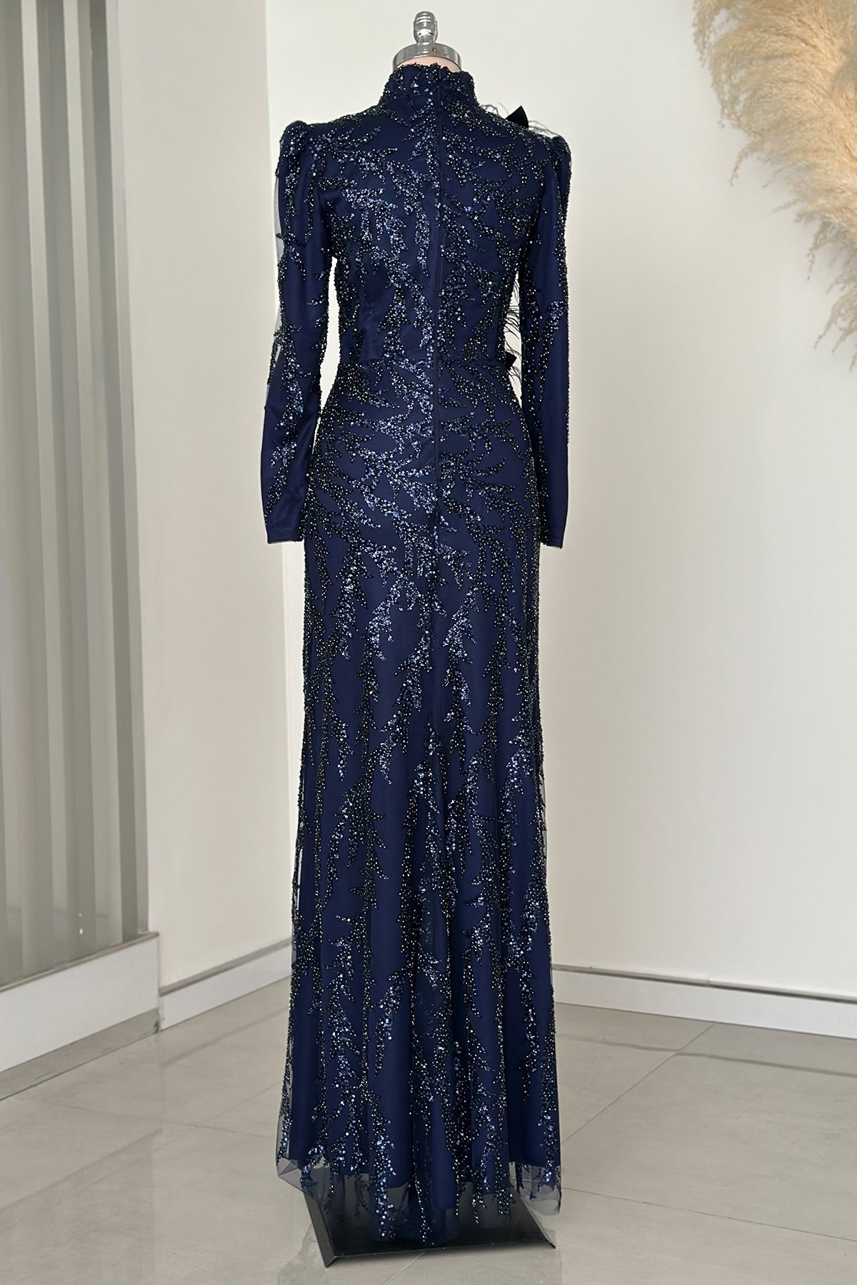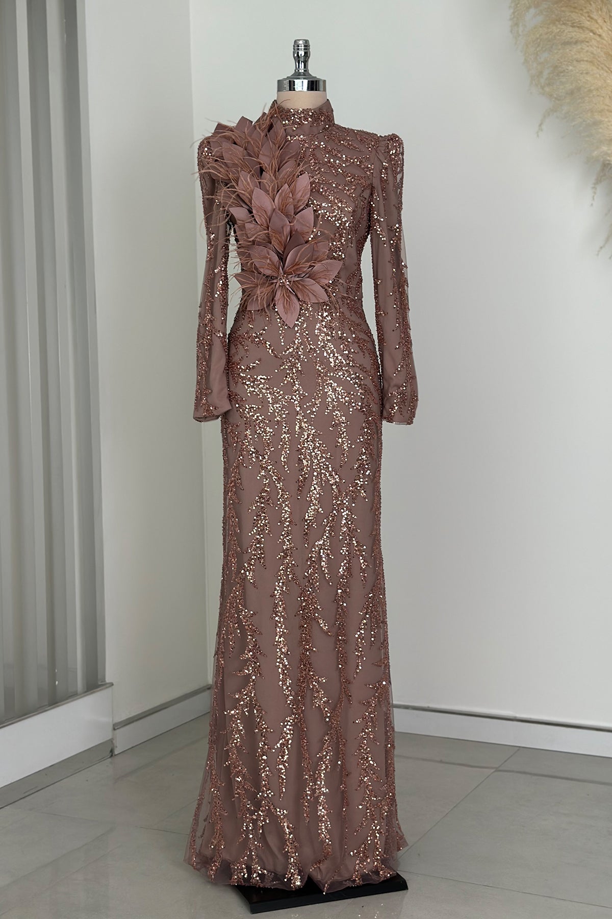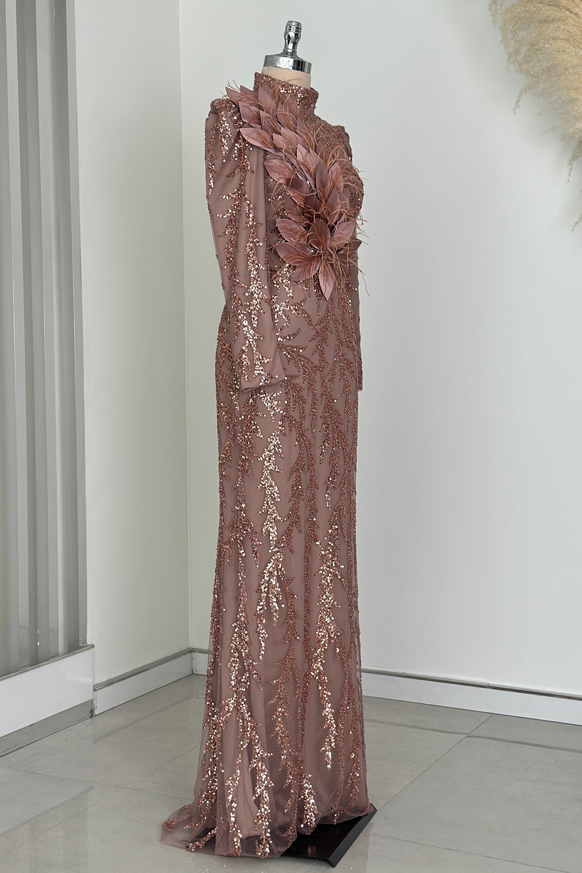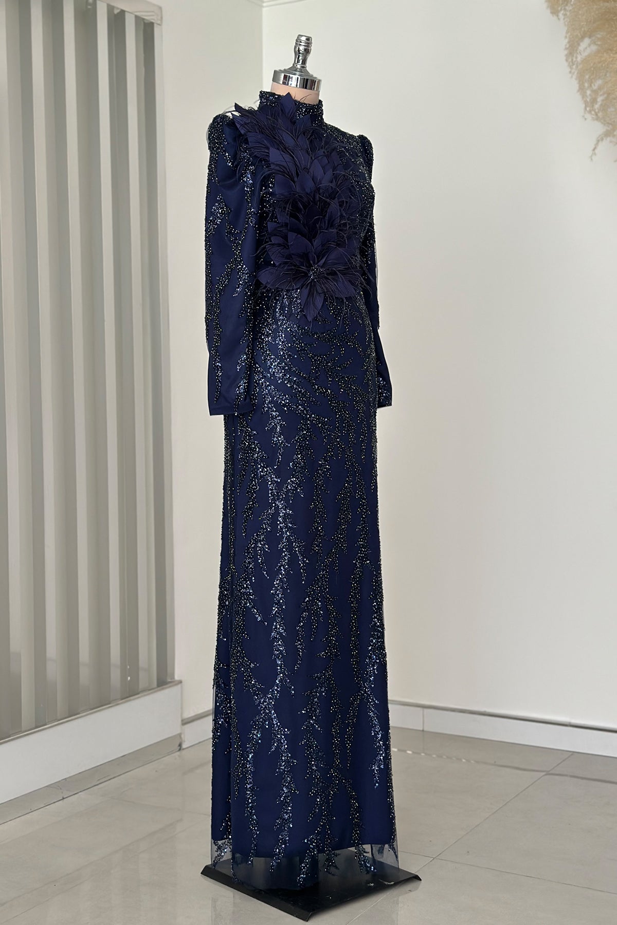 Boydan tül boncuk işlemeli tasarım ve omuz detayında büyük yaprak detayı olan amara abiye modelimiz arkadan gizli fermuarlı olup astarlıdır.