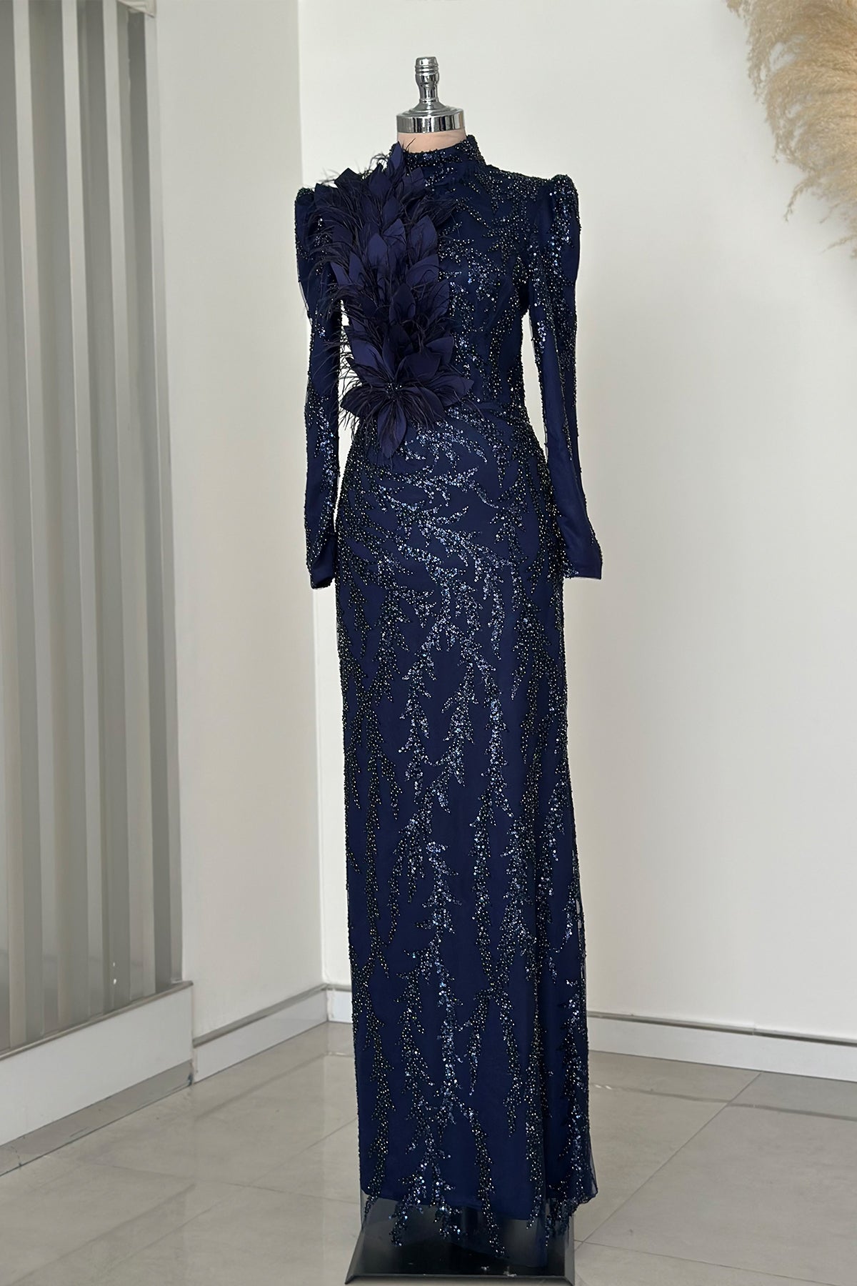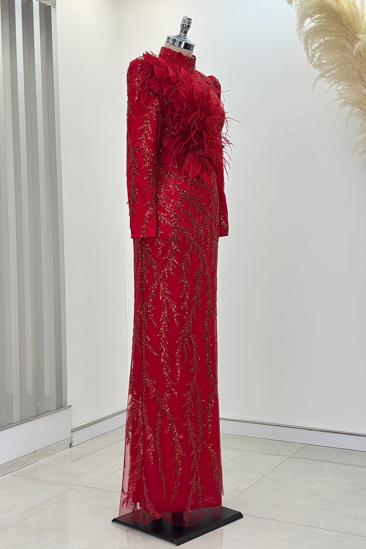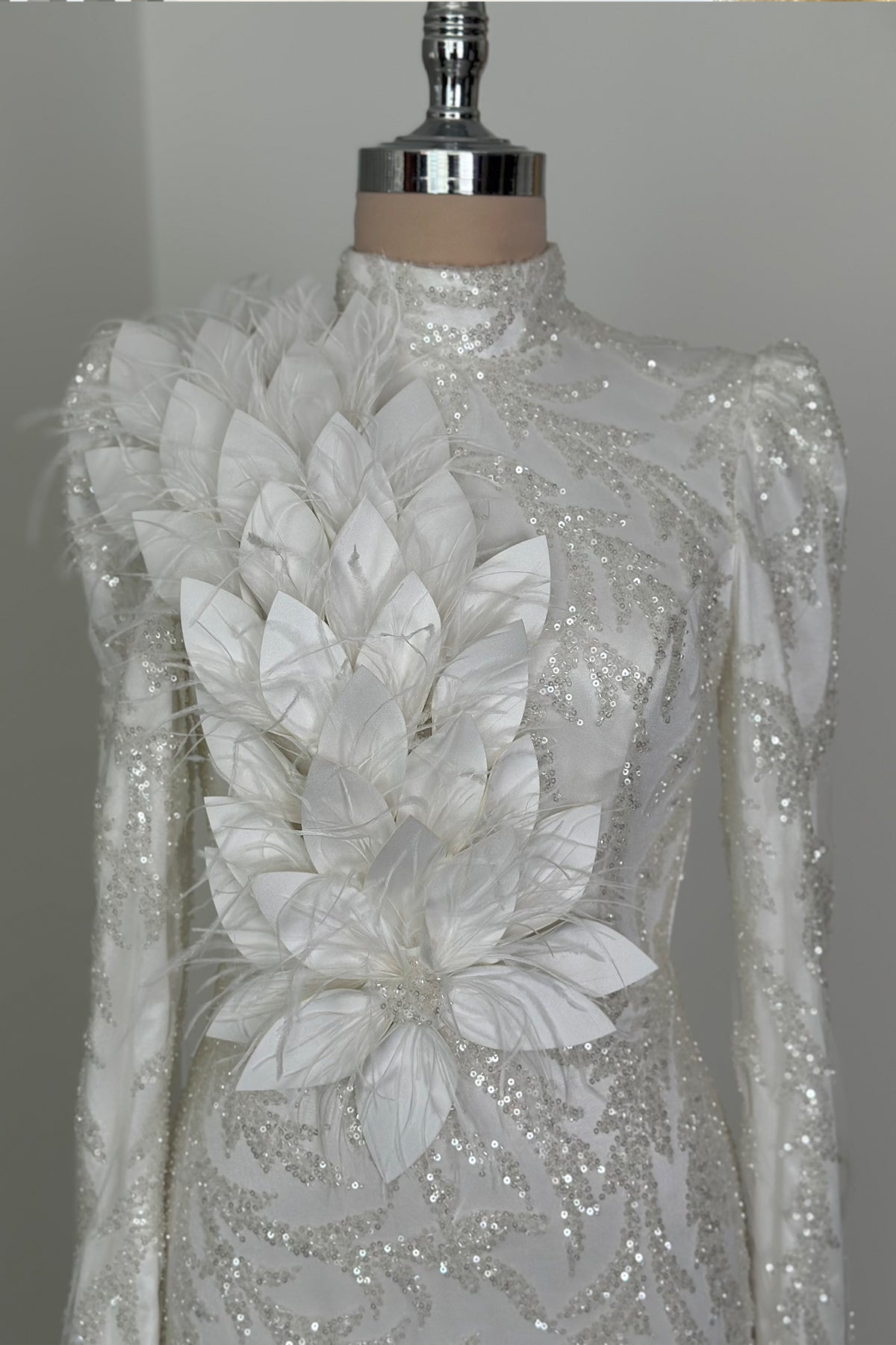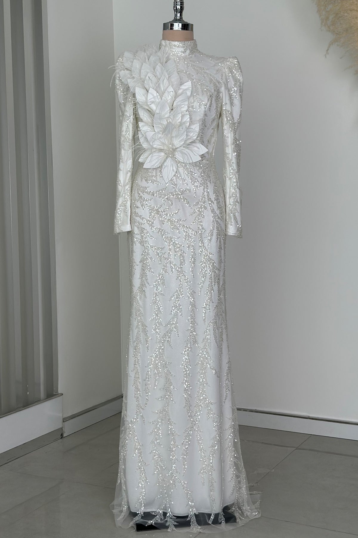 Boydan tül boncuk işlemeli tasarım ve omuz detayında büyük yaprak detayı olan amara abiye modelimiz arkadan gizli fermuarlı olup astarlıdır.