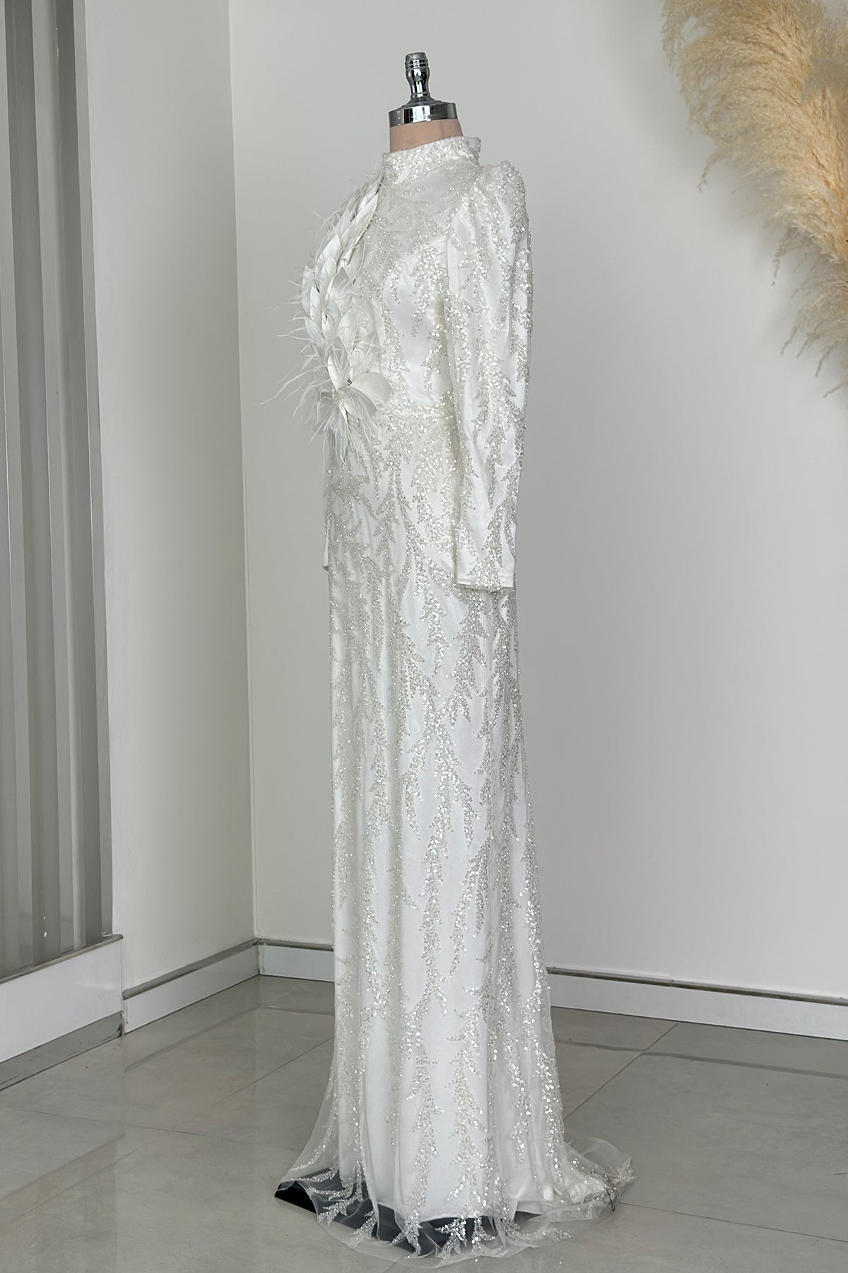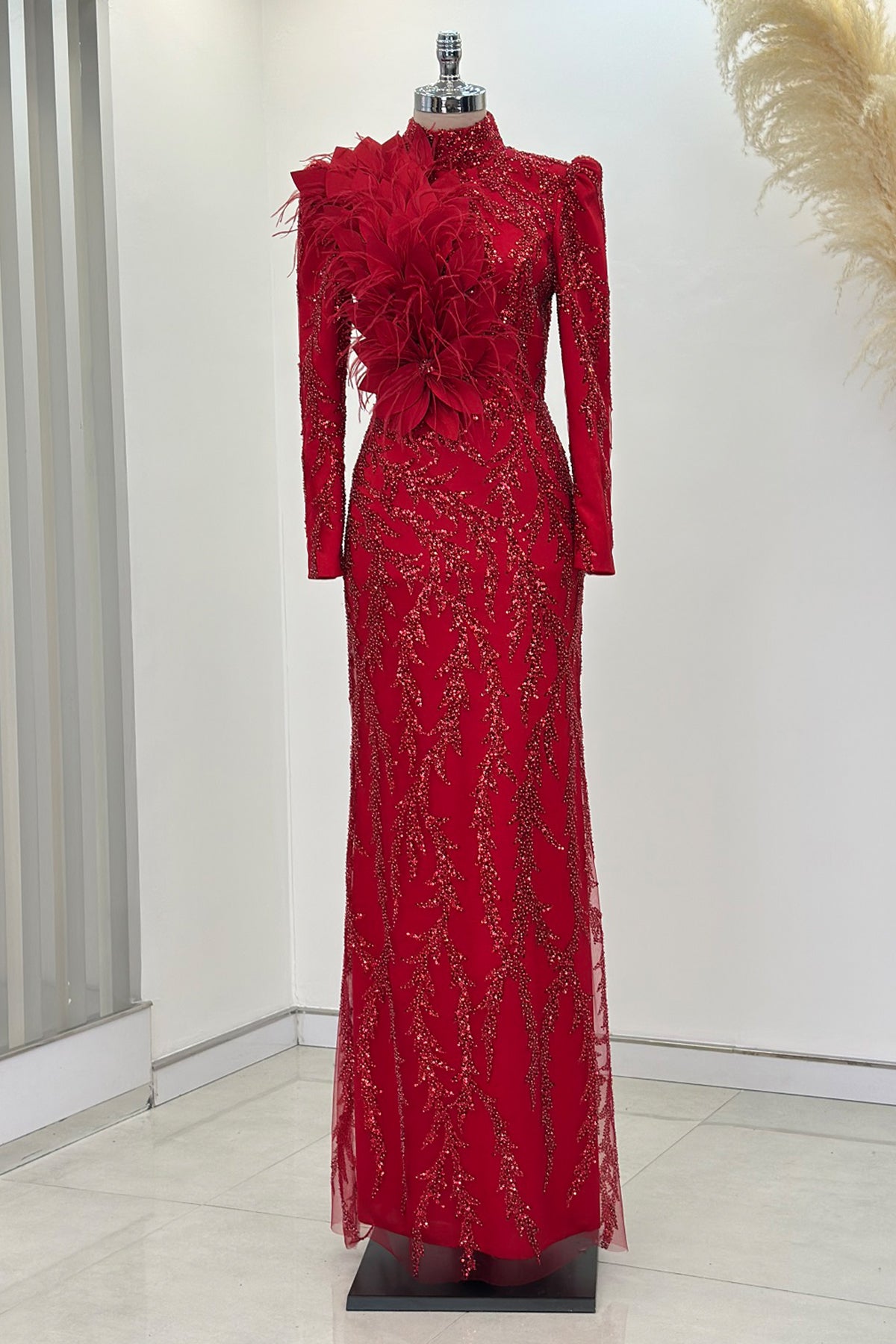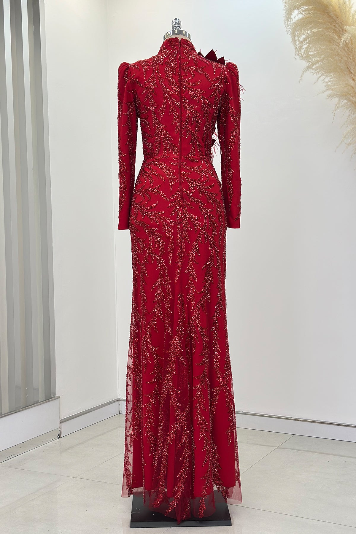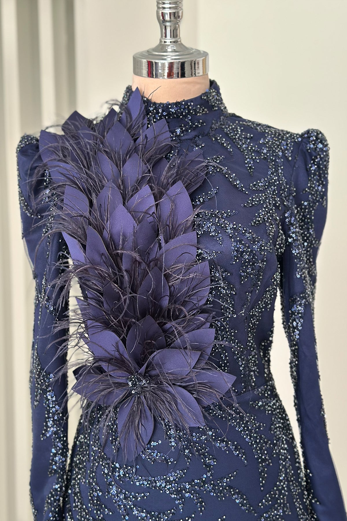 Boydan tül boncuk işlemeli tasarım ve omuz detayında büyük yaprak detayı olan amara abiye modelimiz arkadan gizli fermuarlı olup astarlıdır.