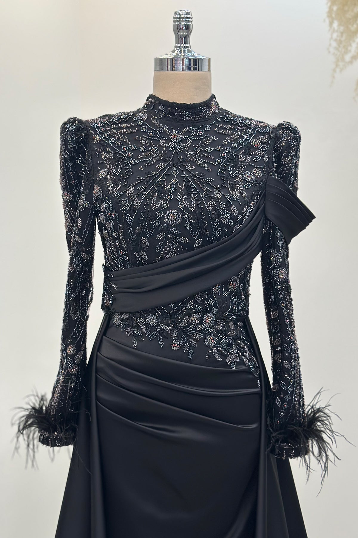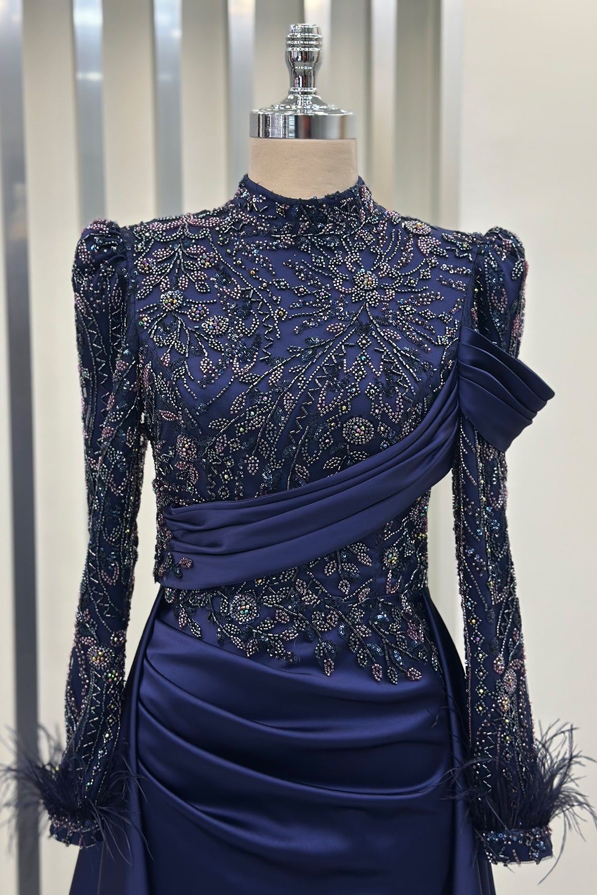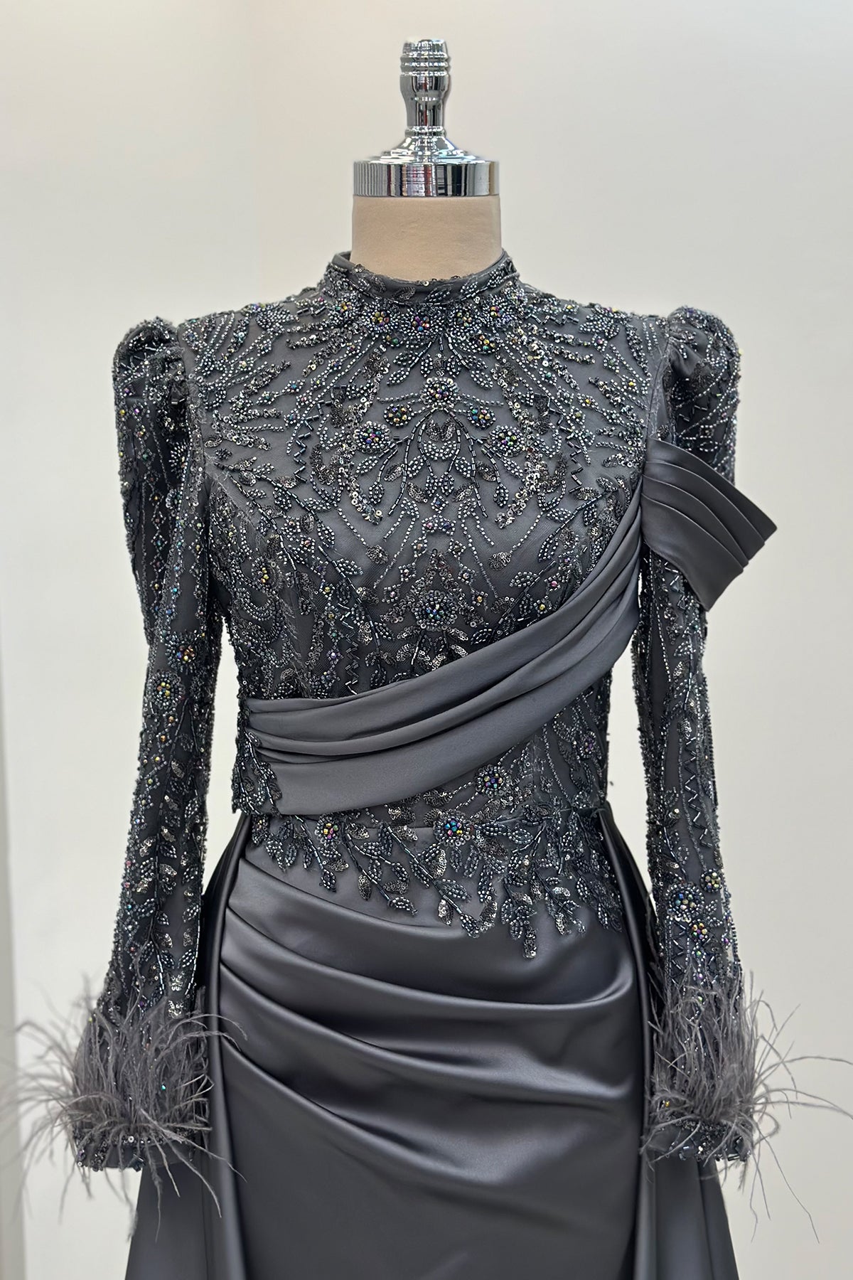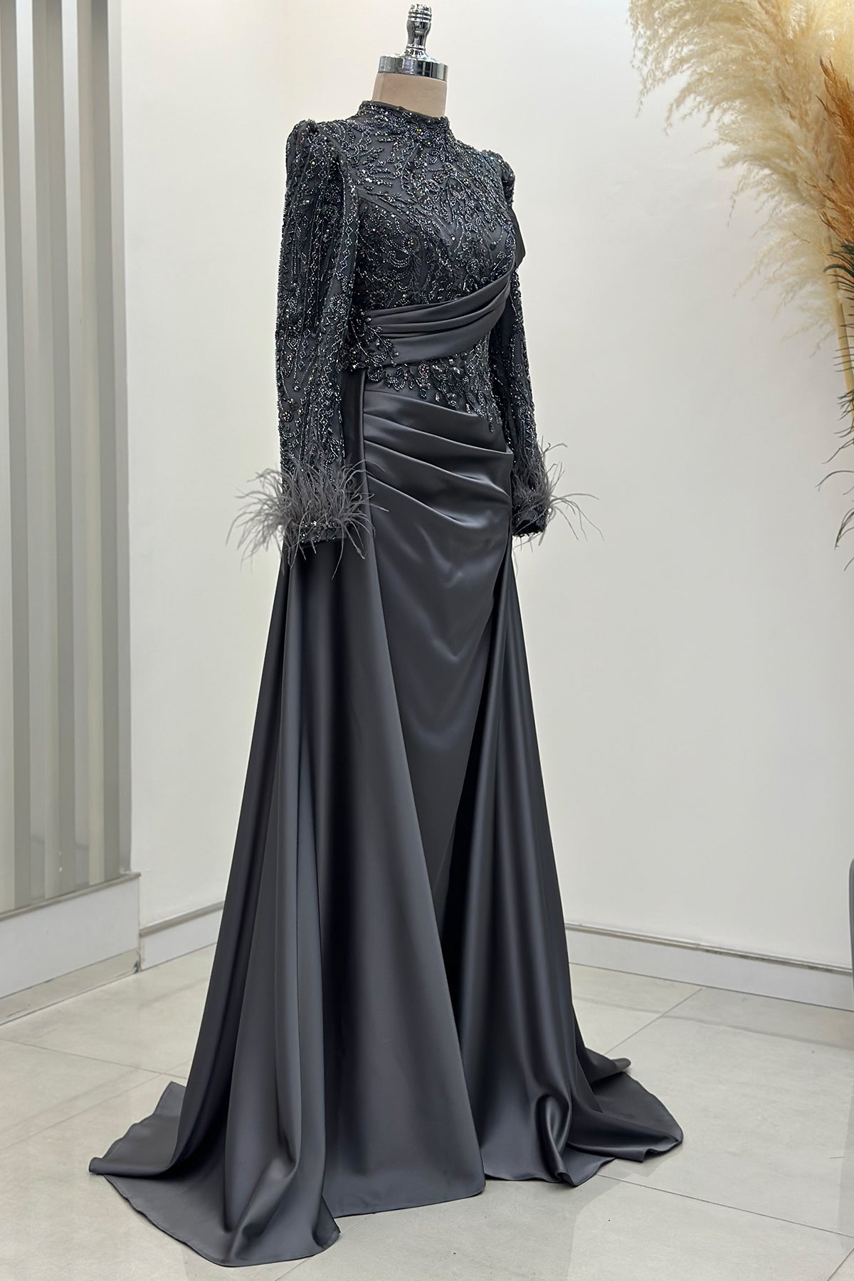 Bel kısmındaki çapraz drapaj tasarımı ve dantel işlemeli, boncuk detaylı, yüksek yakalı tasarımı ile anabel abiye modelimiz arkadan gizli fermuarlı olup astarlıdır.