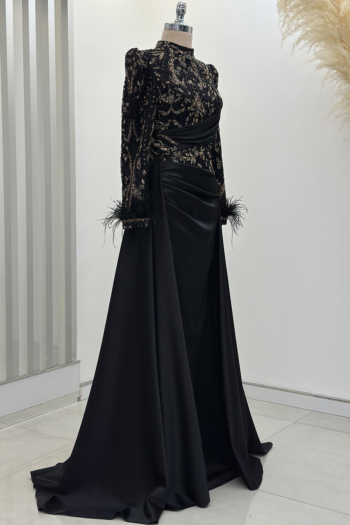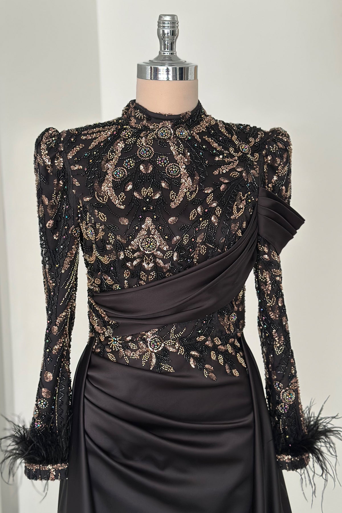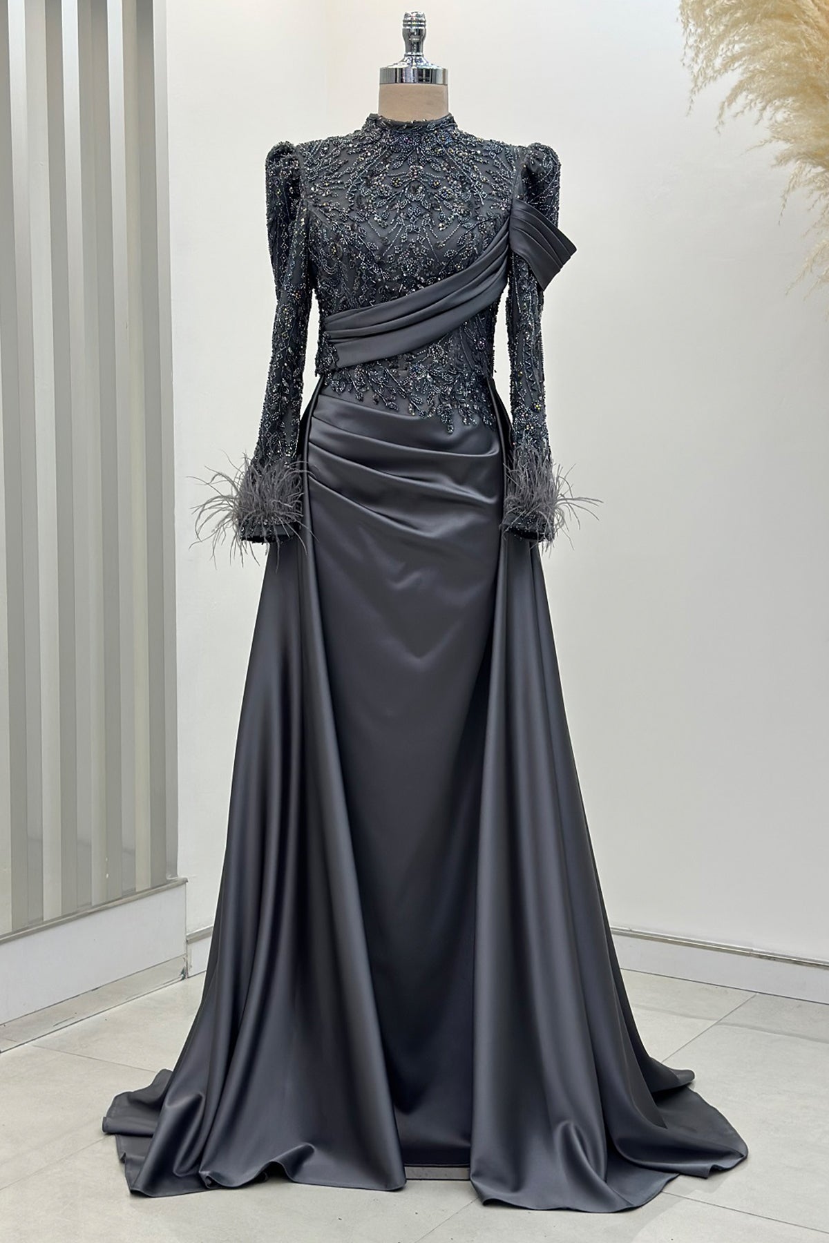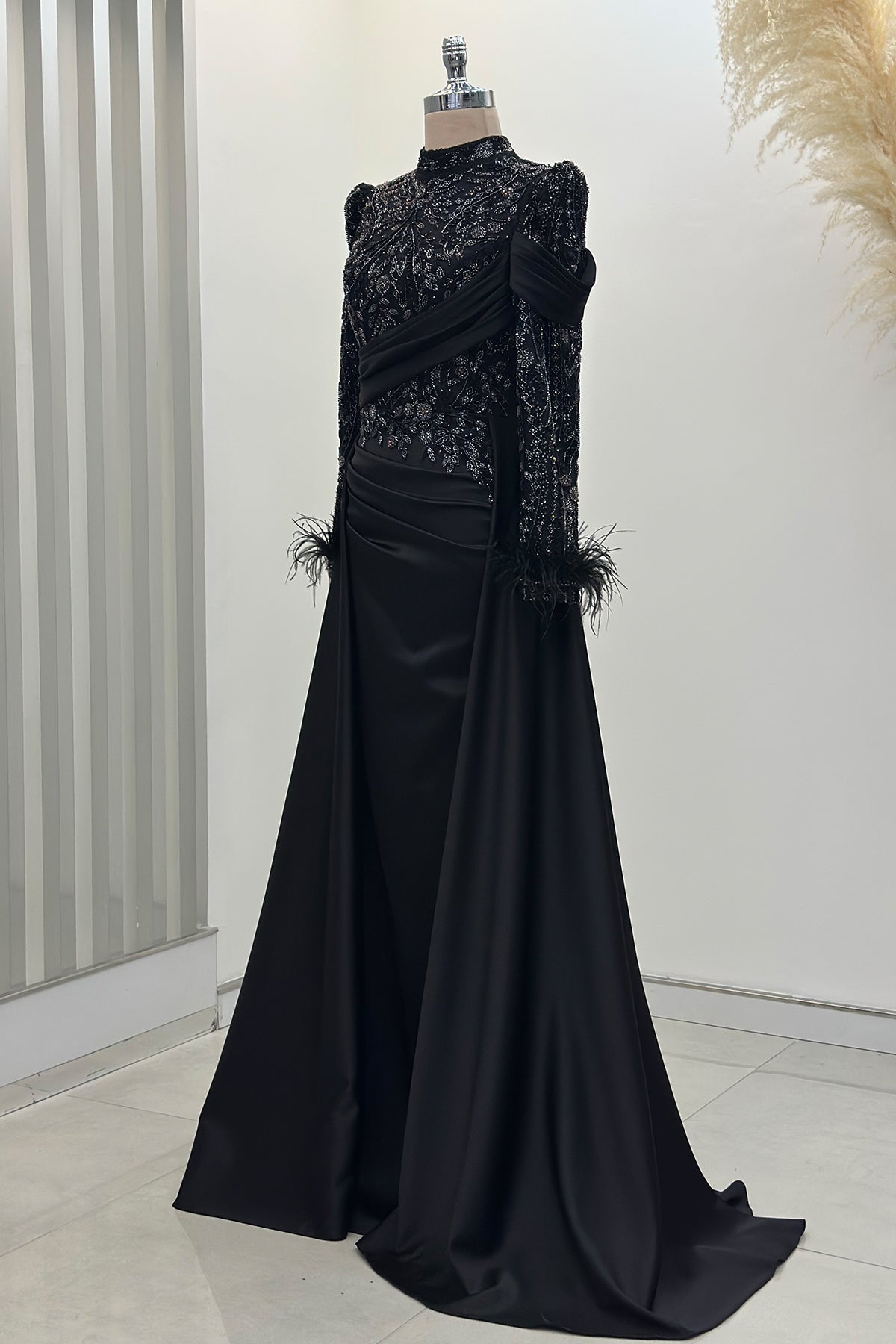 Bel kısmındaki çapraz drapaj tasarımı ve dantel işlemeli, boncuk detaylı, yüksek yakalı tasarımı ile anabel abiye modelimiz arkadan gizli fermuarlı olup astarlıdır.