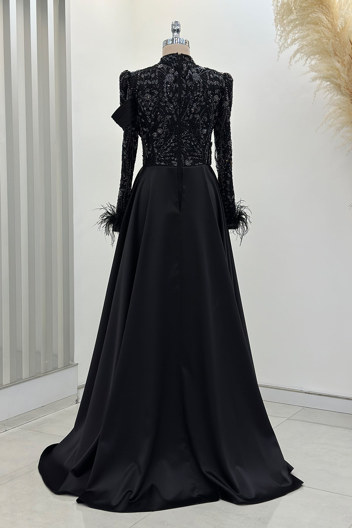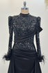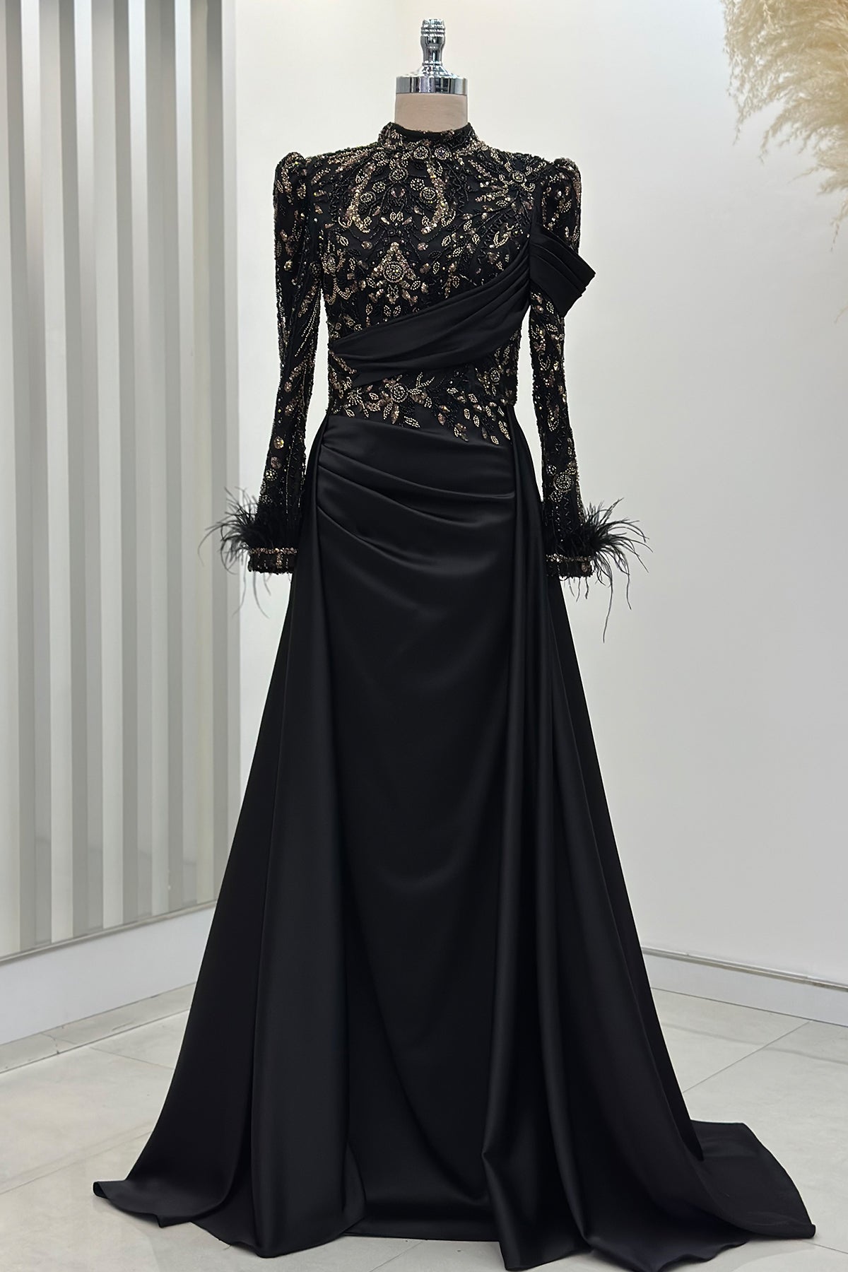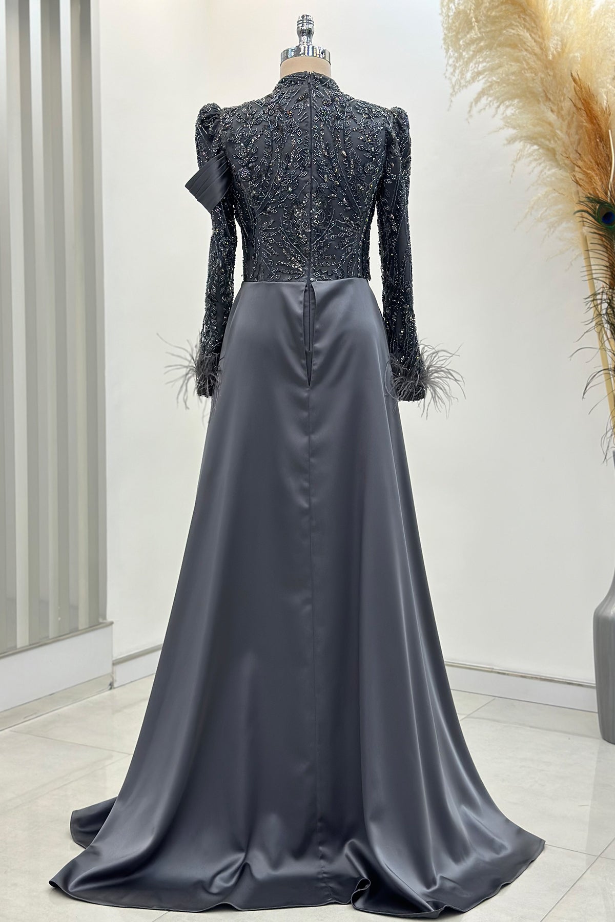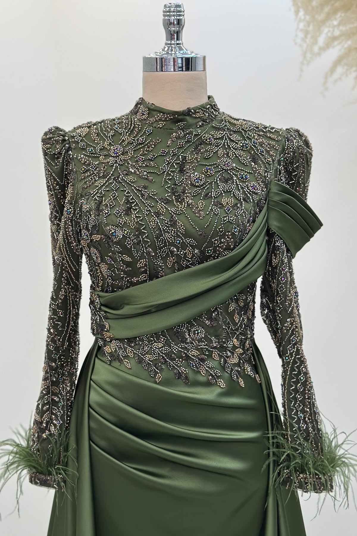 Bel kısmındaki çapraz drapaj tasarımı ve dantel işlemeli, boncuk detaylı, yüksek yakalı tasarımı ile anabel abiye modelimiz arkadan gizli fermuarlı olup astarlıdır.