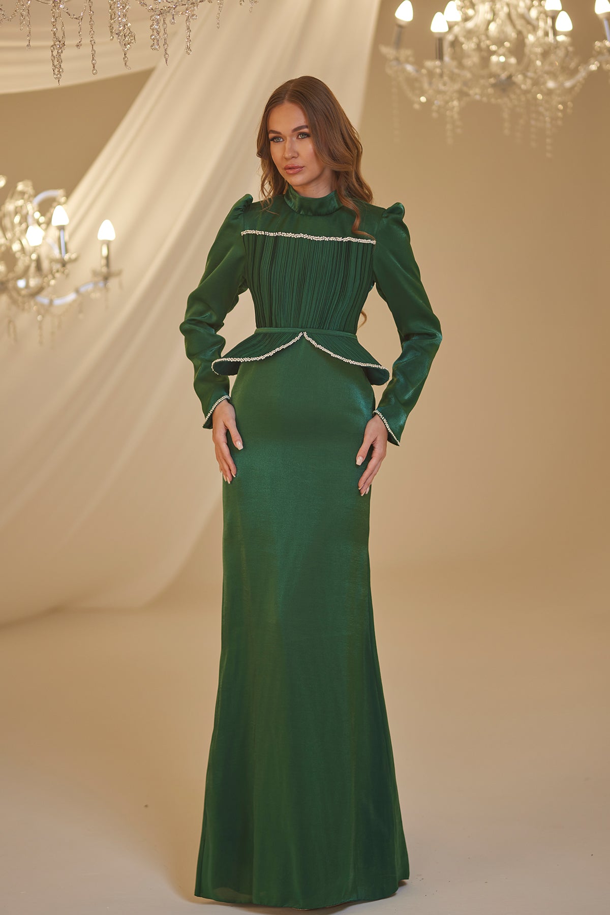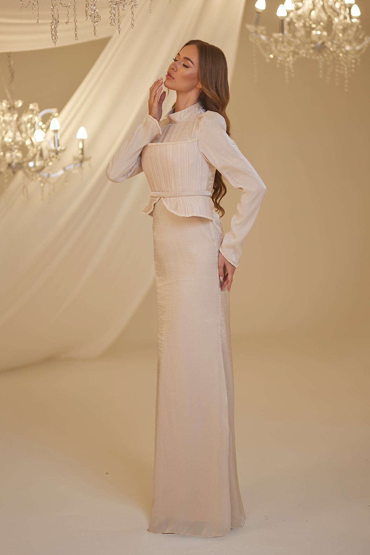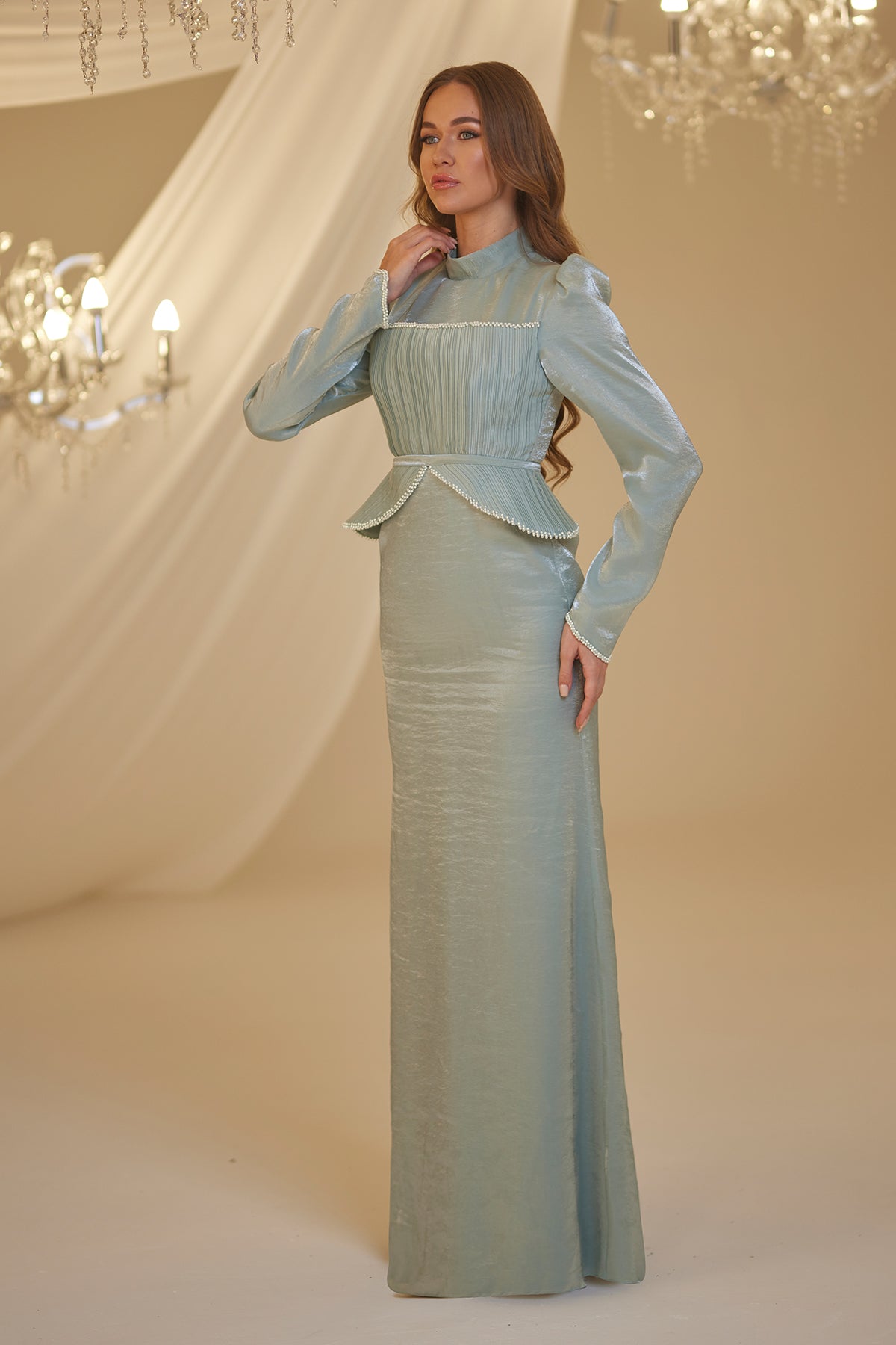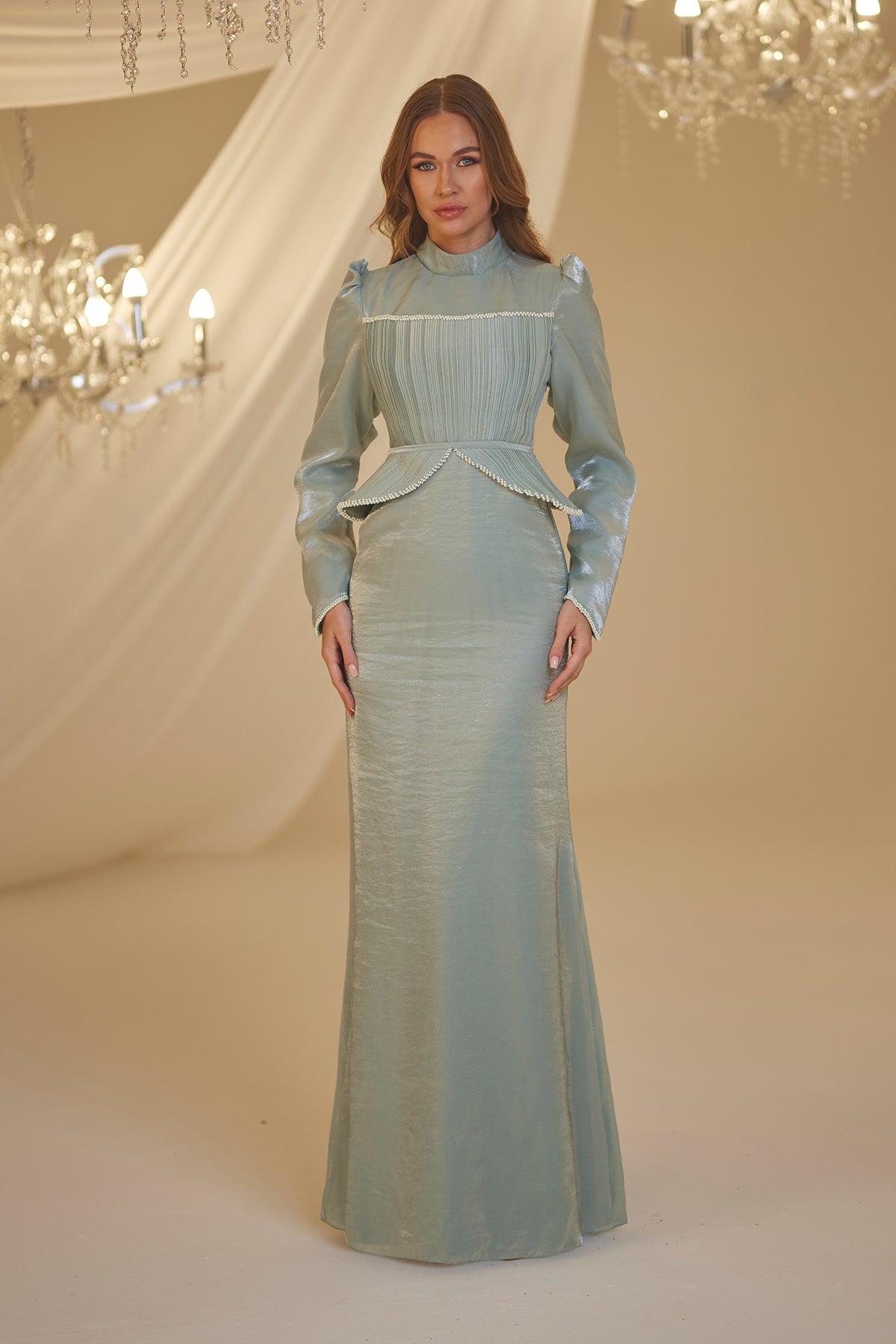 Düz kalem etek tarzında ve belinde peplum detayı olup incilerle süslenmiş tafta kumaş olan efsun abiye modelimiz arkadan gizli fermuarlı olup astarlıdır.