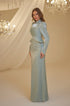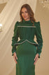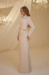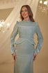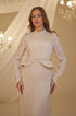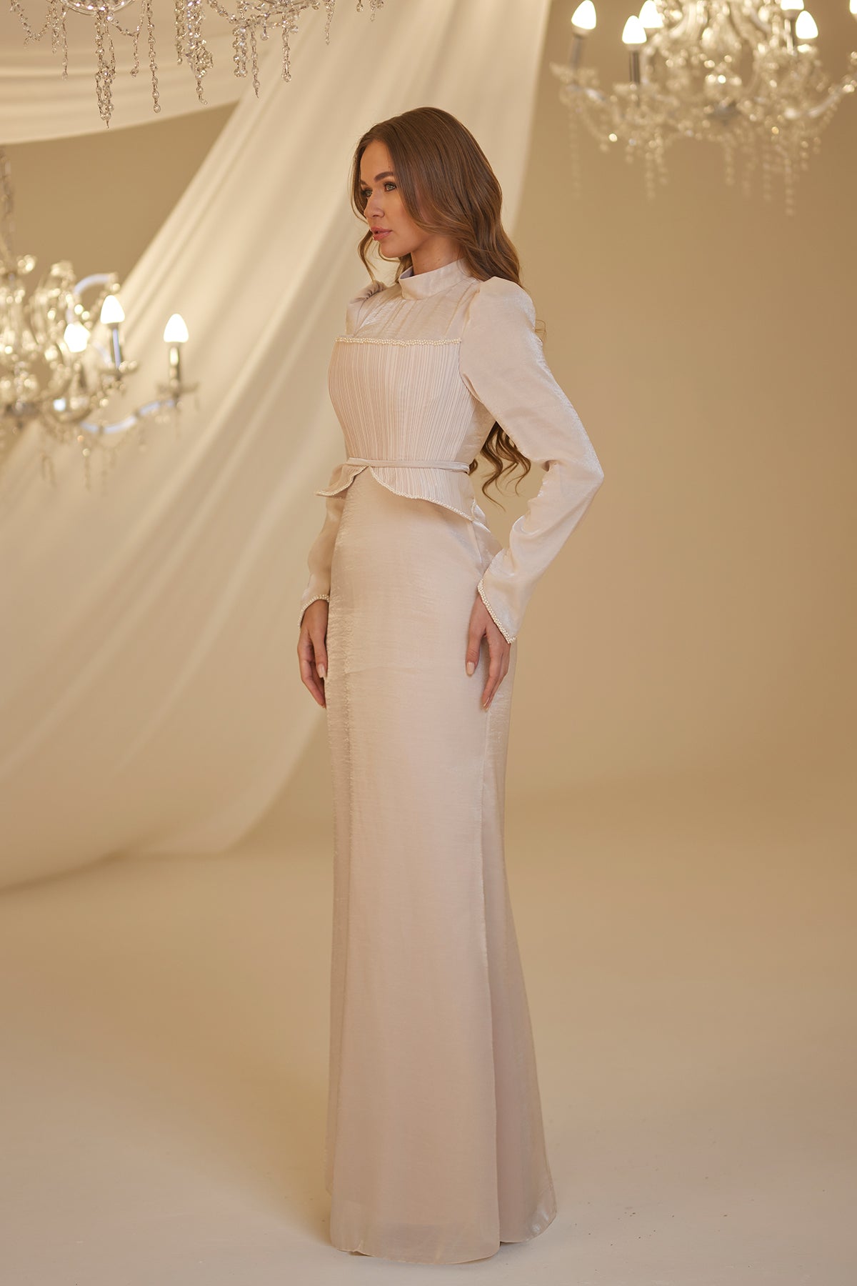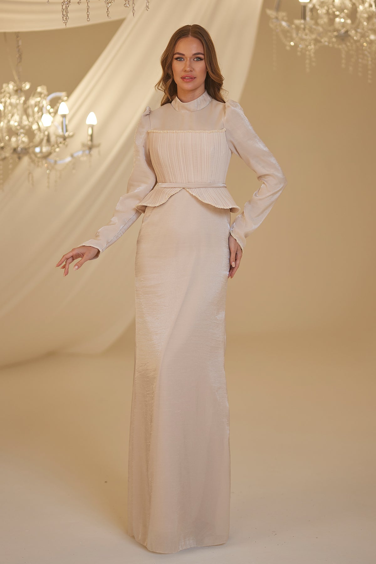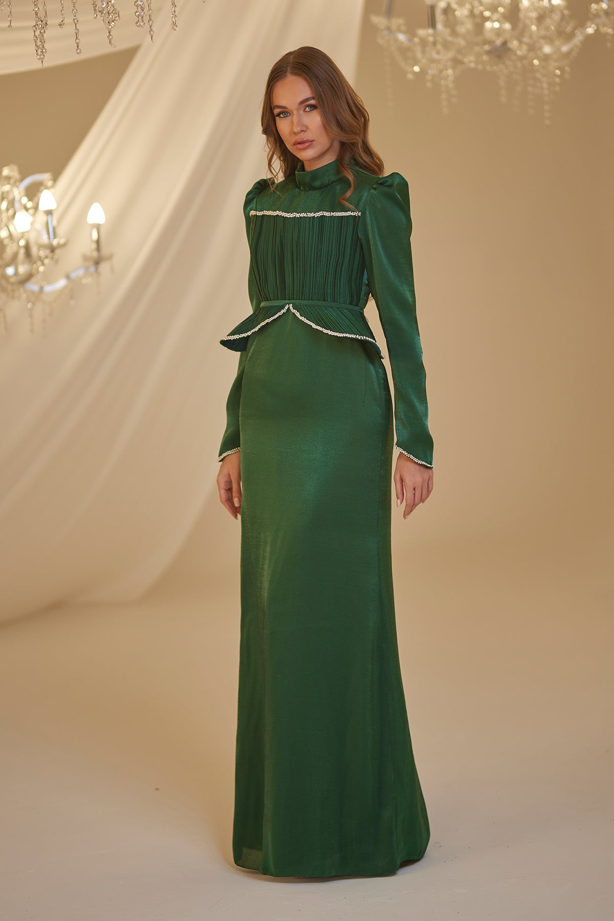 Düz kalem etek tarzında ve belinde peplum detayı olup incilerle süslenmiş tafta kumaş olan efsun abiye modelimiz arkadan gizli fermuarlı olup astarlıdır.