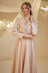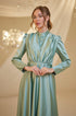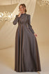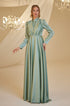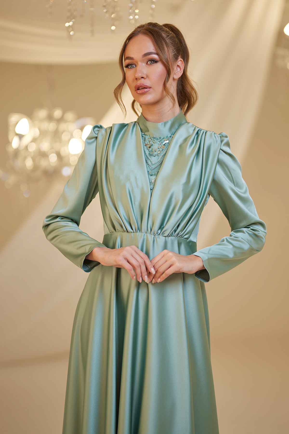 Önü drape ve boncuk detaylı saten elif abiye modelimiz kloş etek olup arkadan gizli fermuarlı ve astarlıdır.