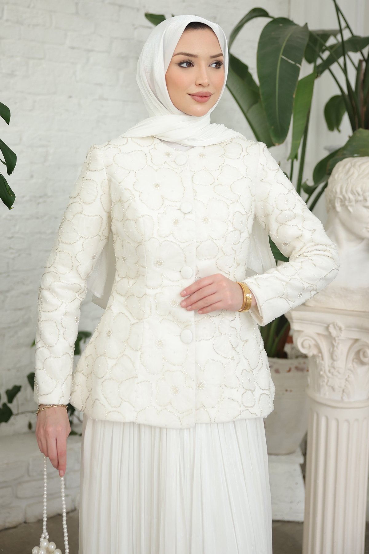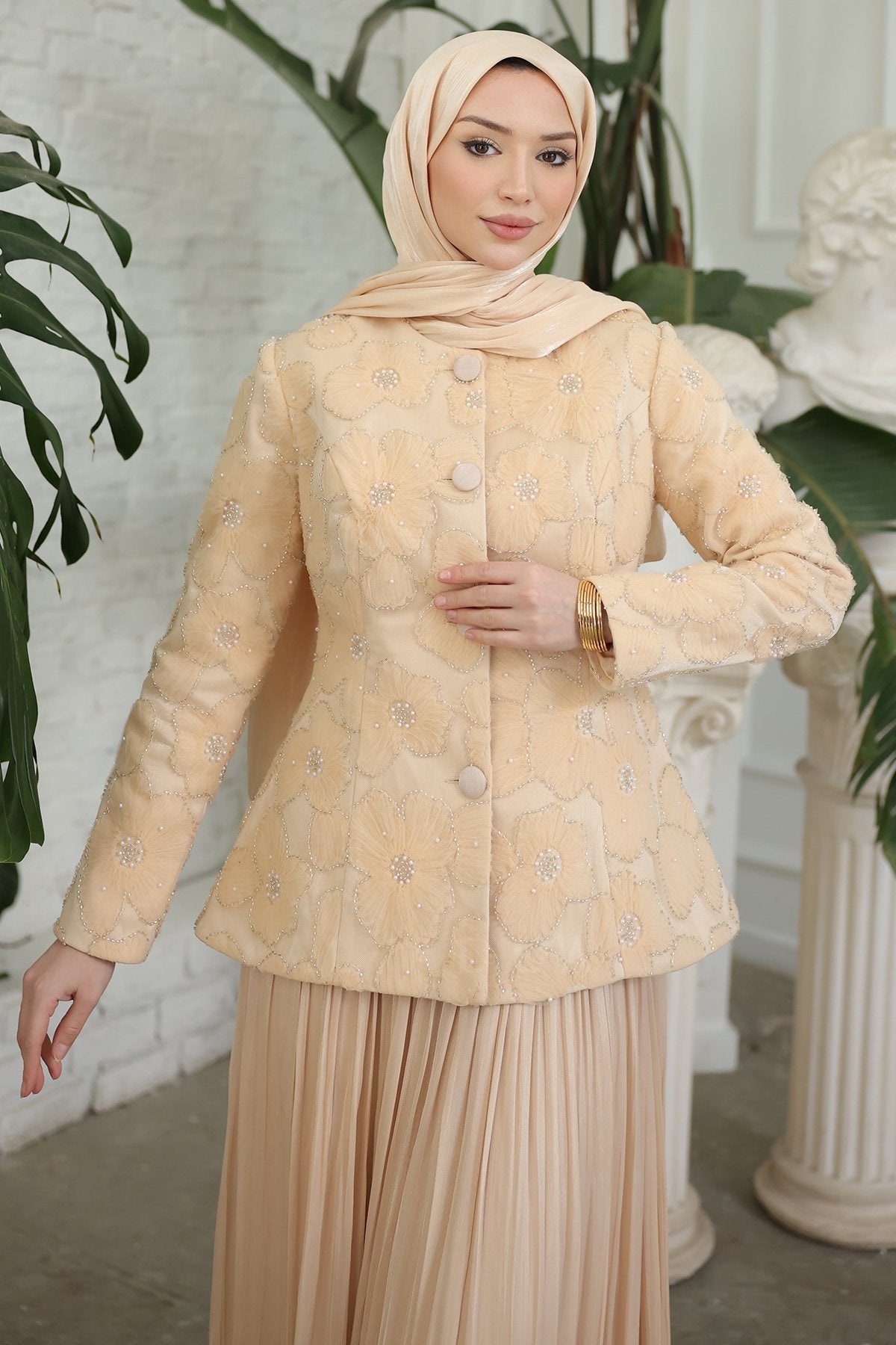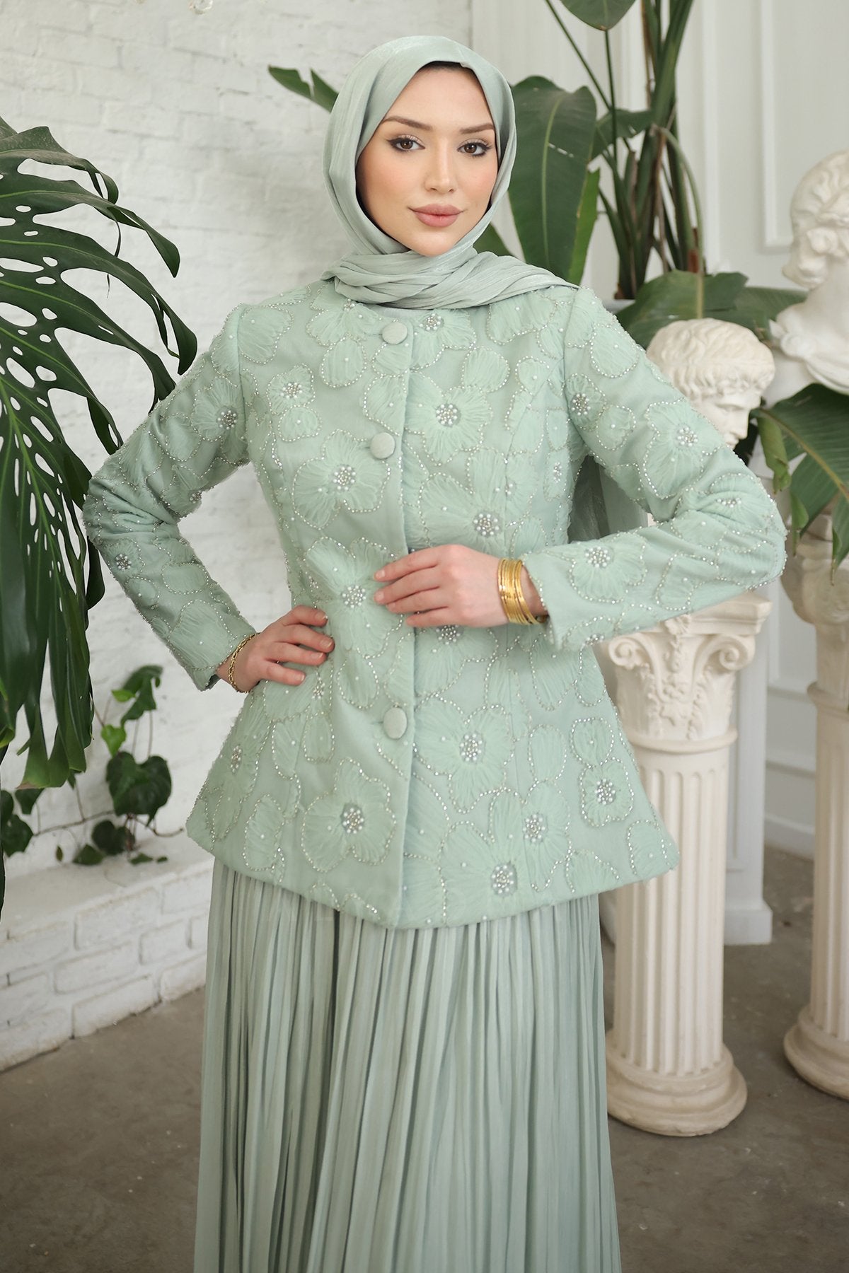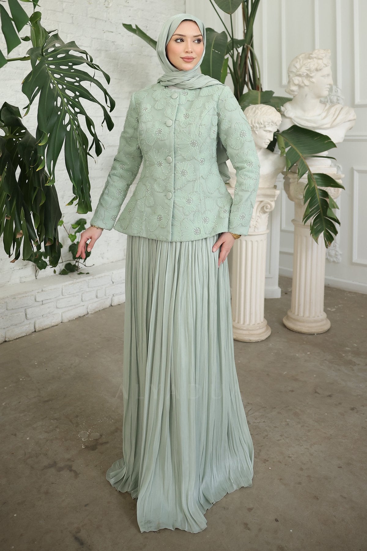 - Pileli etek ve özel tasarım ceket uyumuyla davetlerde zarif, düzenli ve dikkat çekici bir kombin sunar.