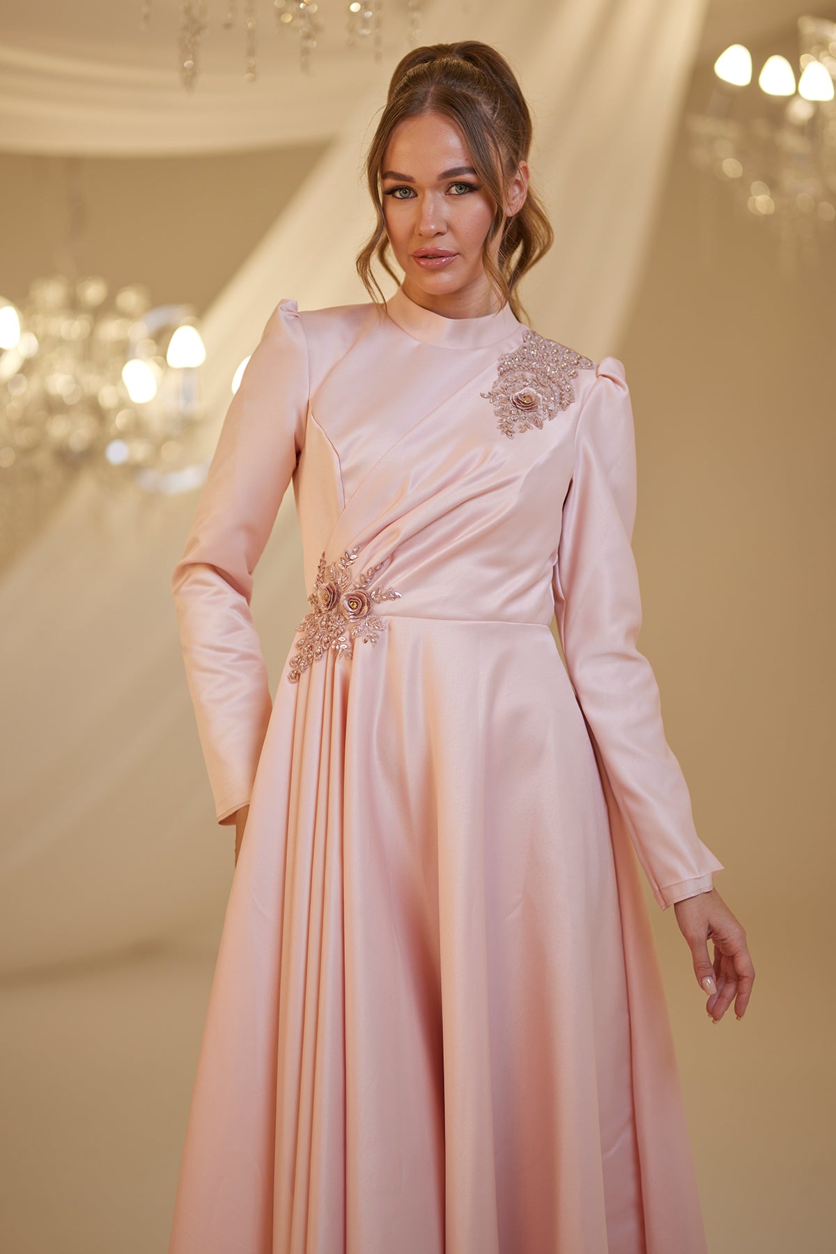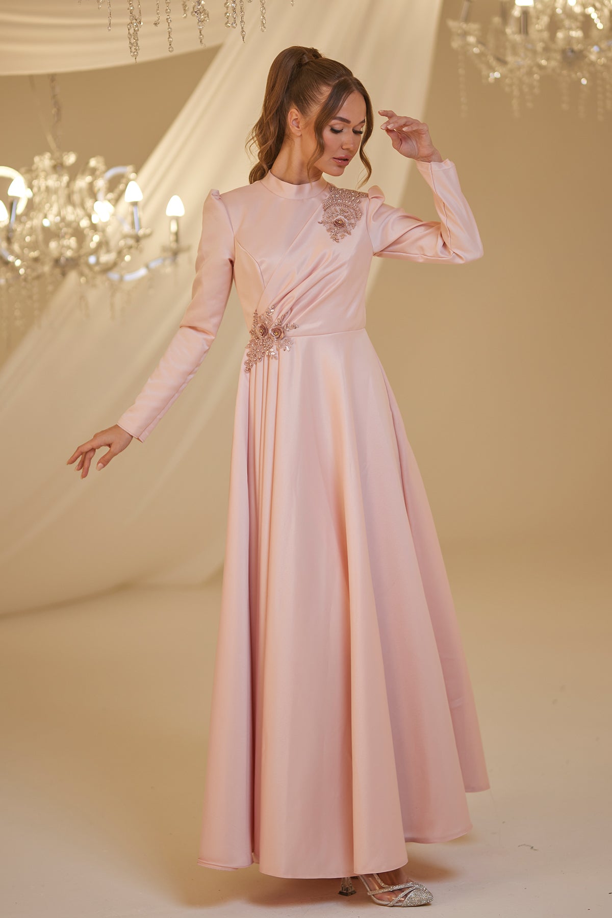 Omuz ve bel kısmında işleme olan saten gül abiye modelimiz arkadan gizli fermuarlı olup astarlıdır.