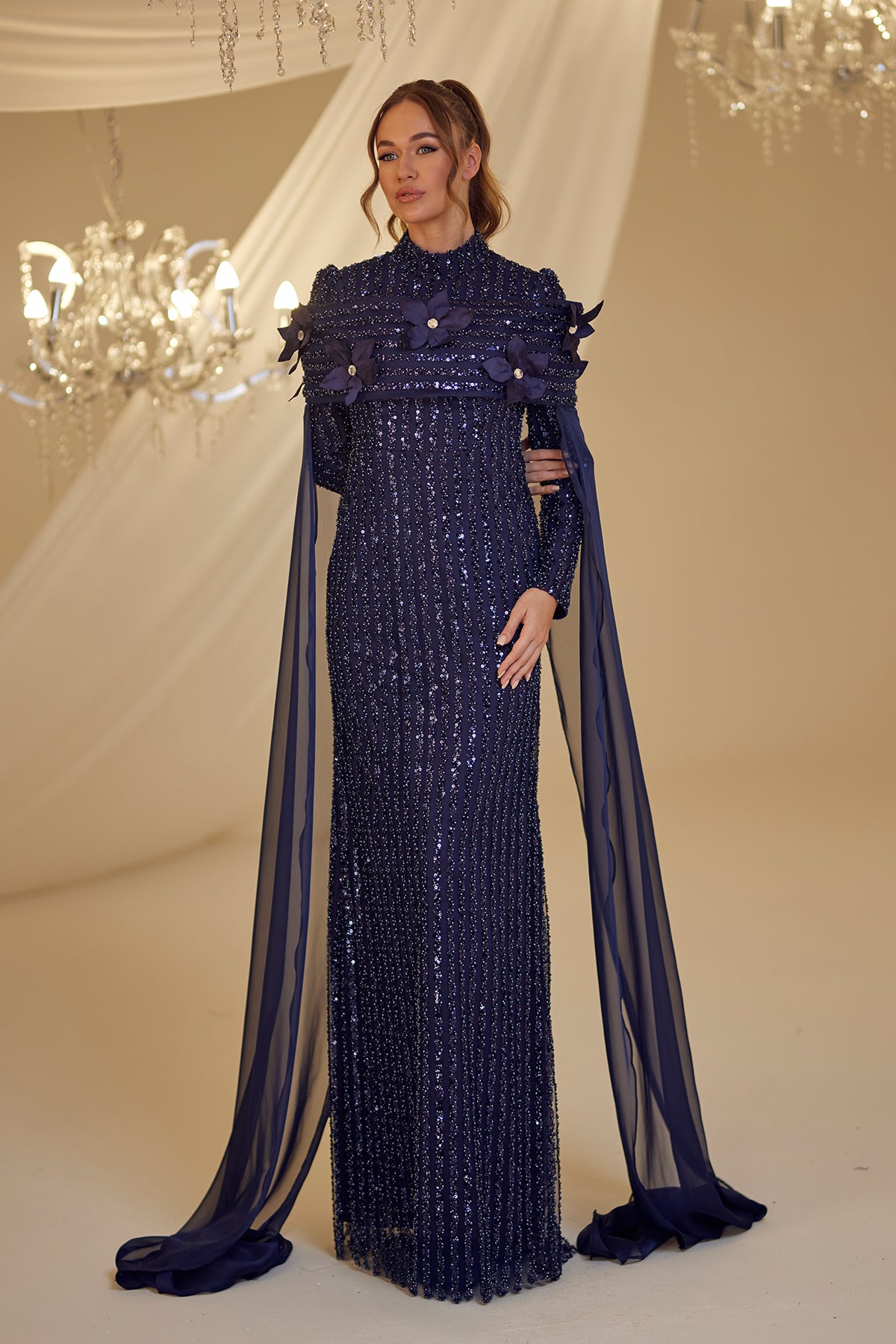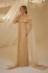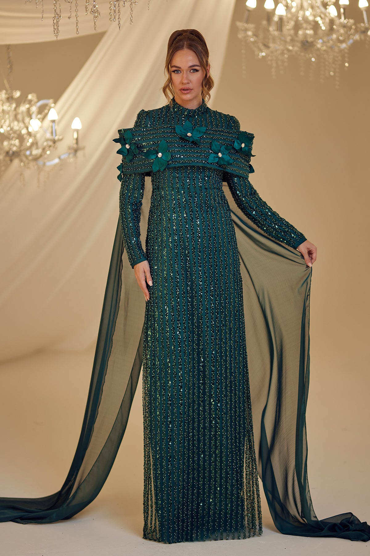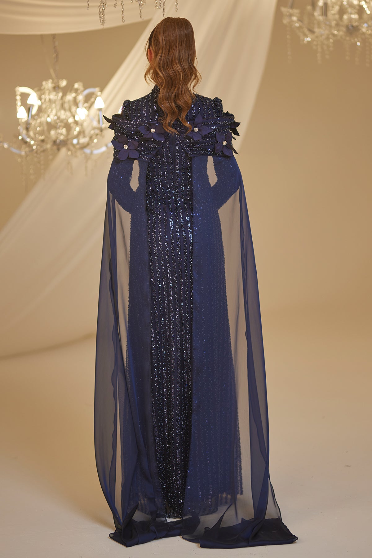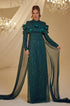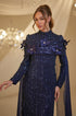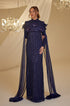 Tül pelerinli omuzu çiçek detaylı ve boncuk işlemeli olan hafsa abiye modelimiz arkadan gizli fermuarlı olup astarlıdır.