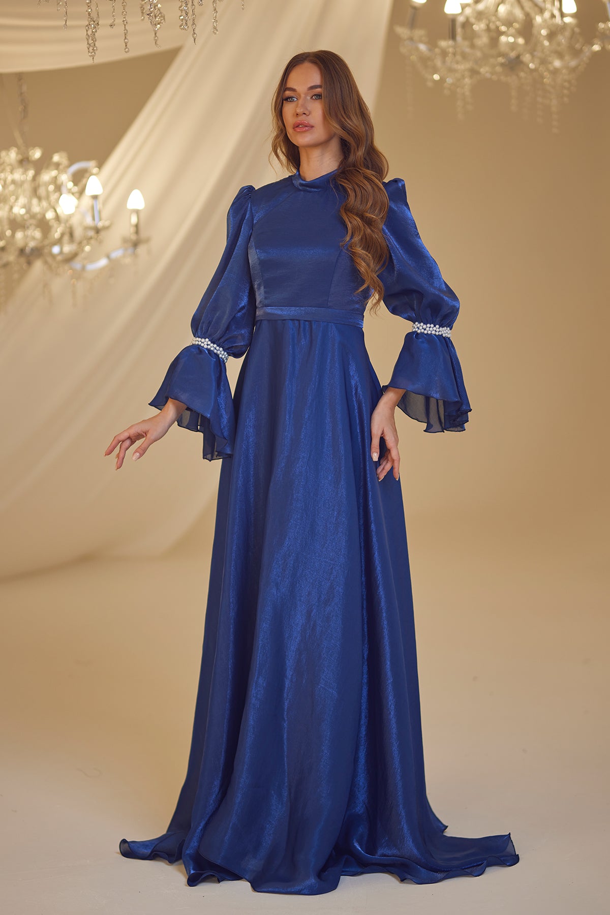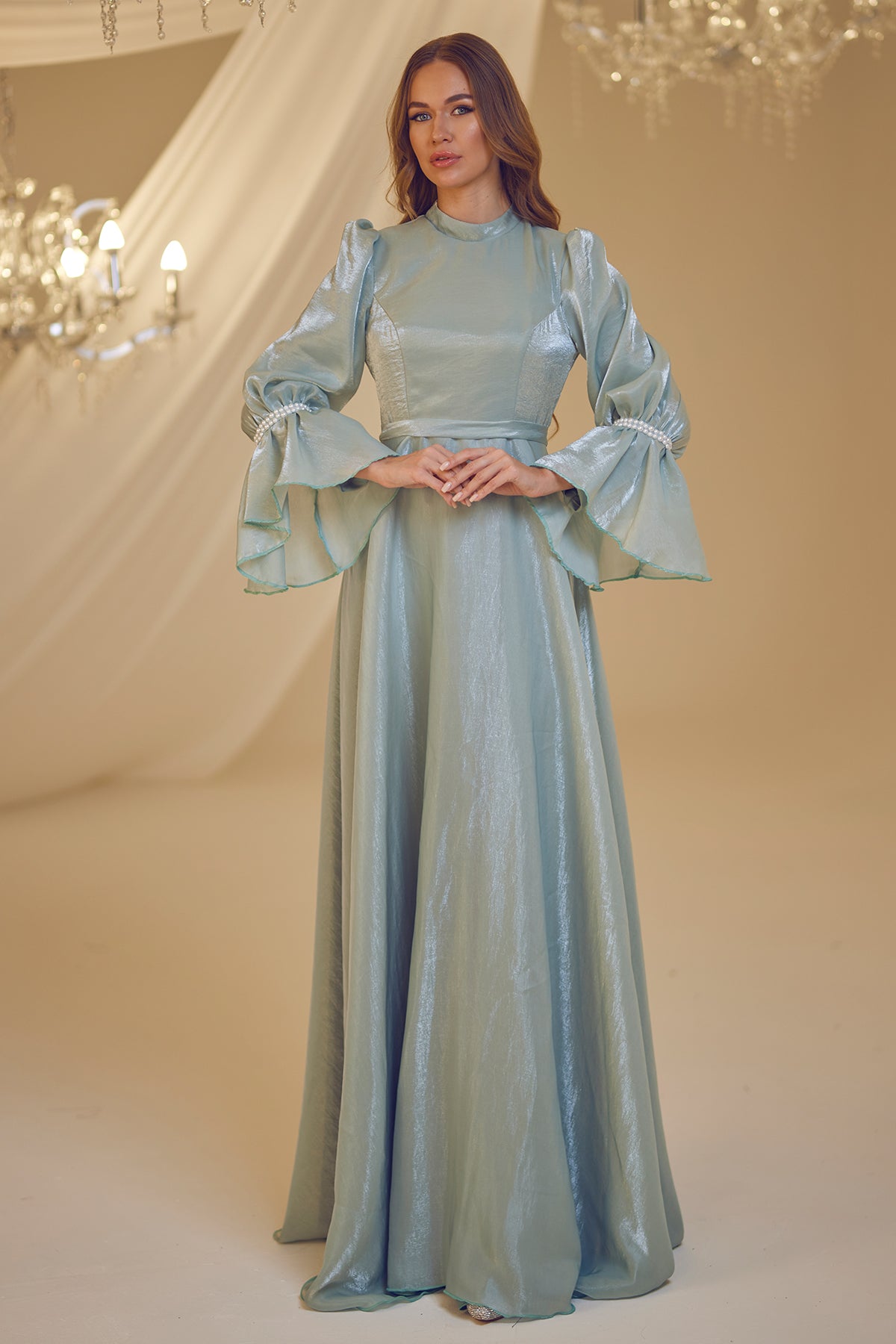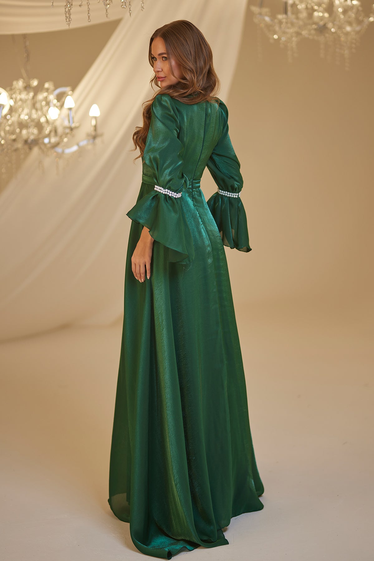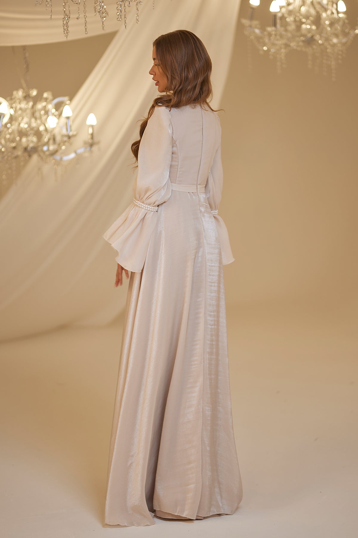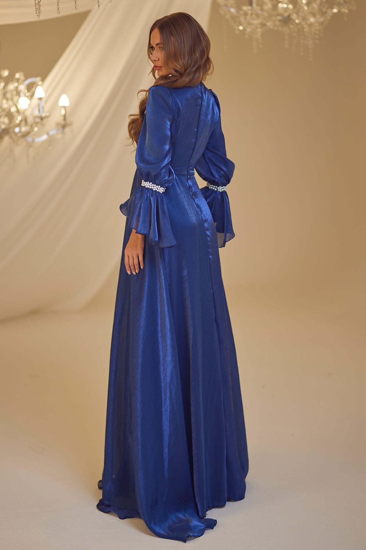 Trompet kol olarak tasarlanmış ve her iki kolda incilerle süslenmiş şifon inci abiye modelimiz arkadan gizli fermuarlı olup astarlıdır.
