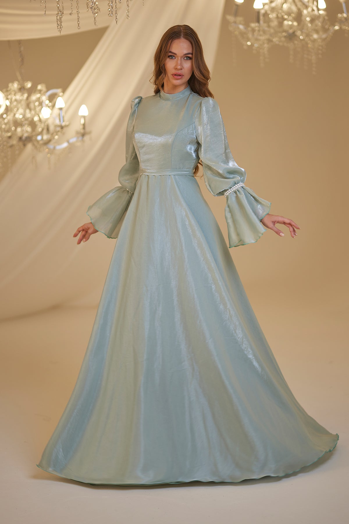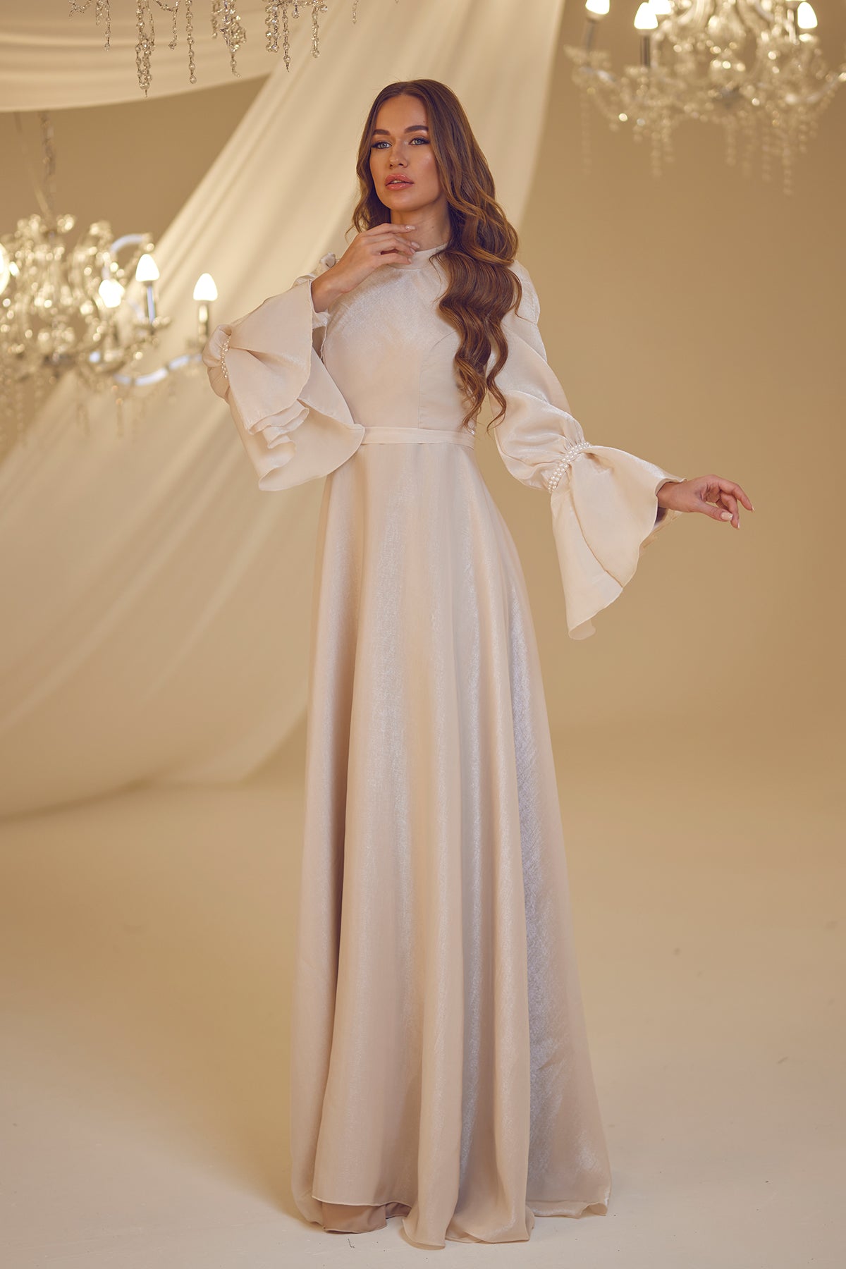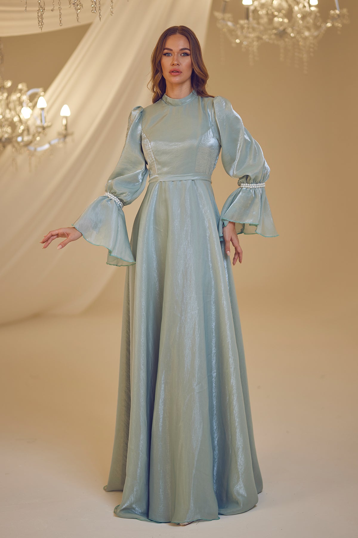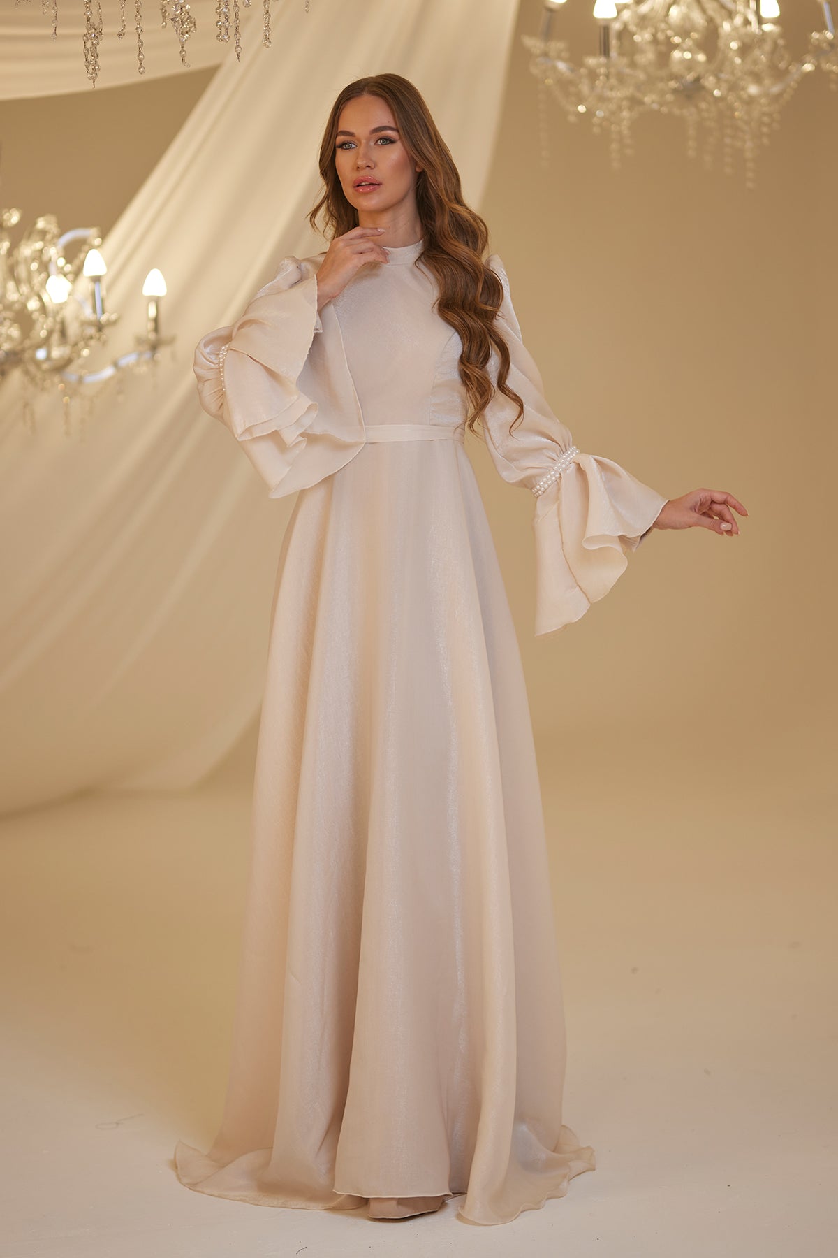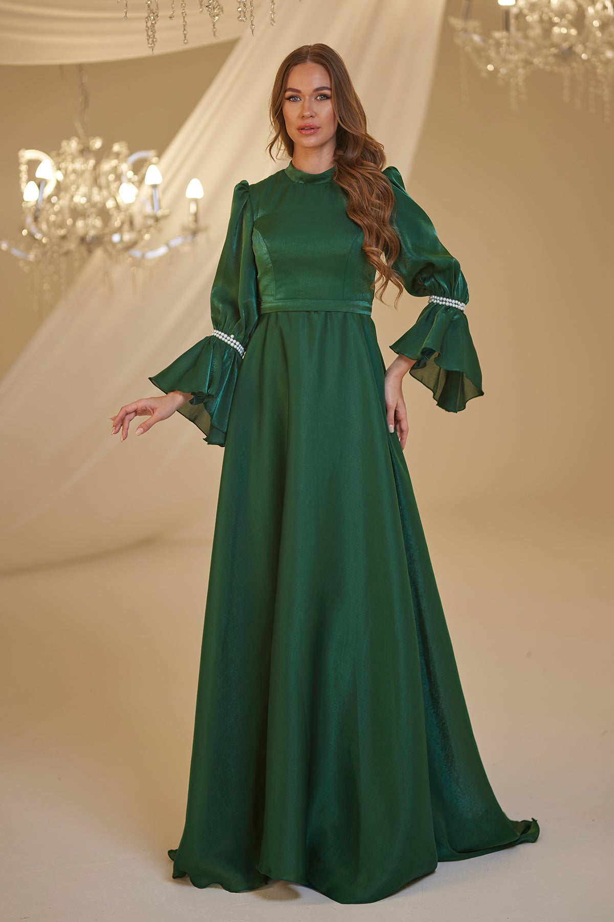 Trompet kol olarak tasarlanmış ve her iki kolda incilerle süslenmiş şifon inci abiye modelimiz arkadan gizli fermuarlı olup astarlıdır.