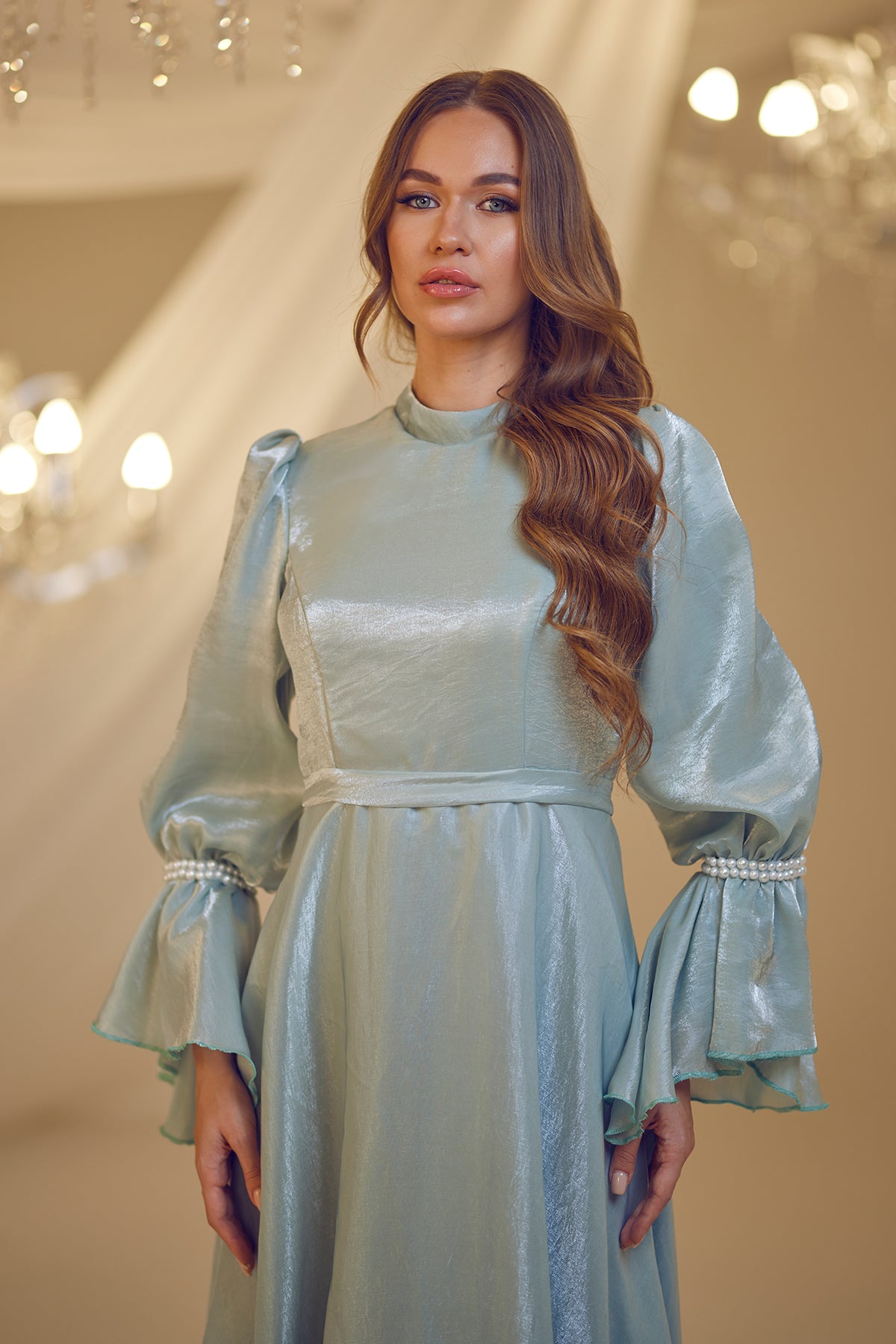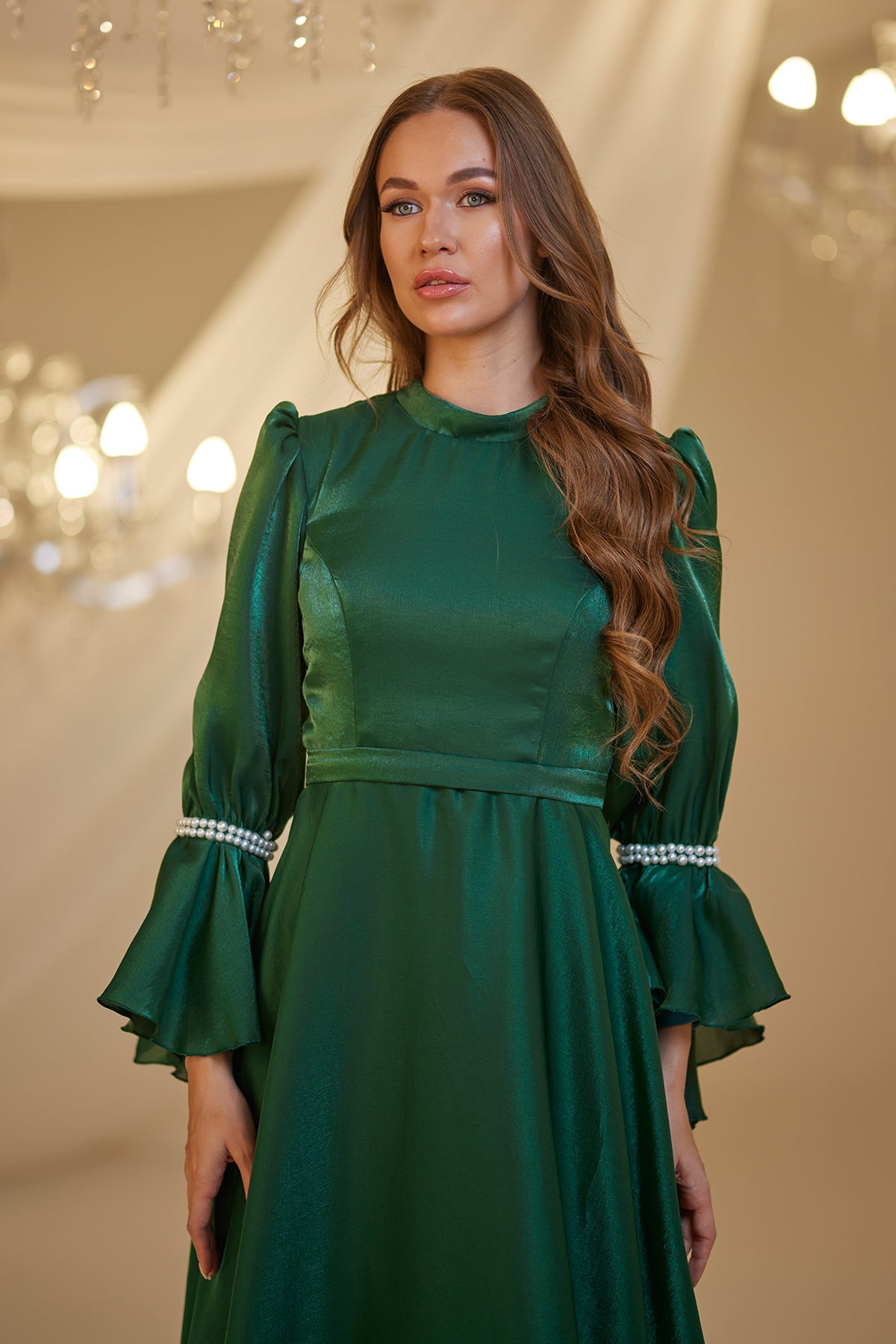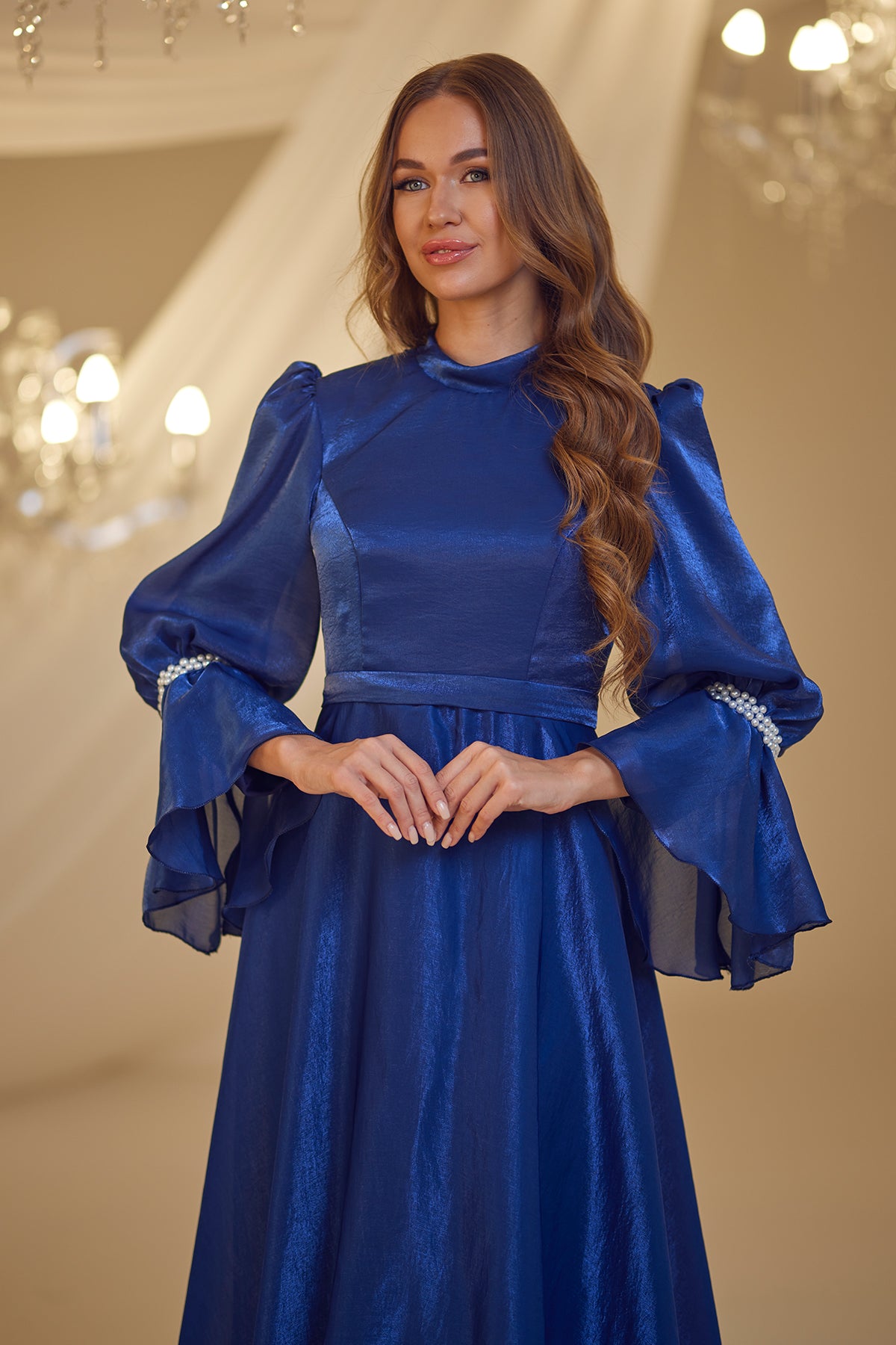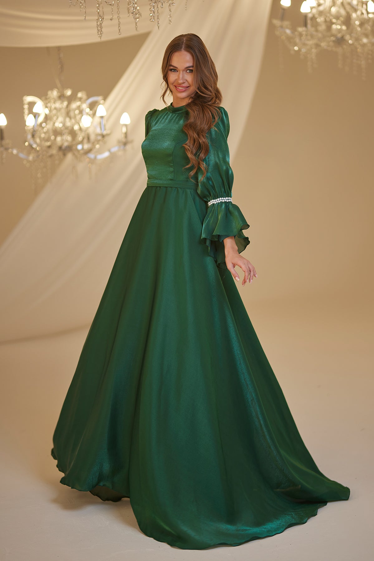 Trompet kol olarak tasarlanmış ve her iki kolda incilerle süslenmiş şifon inci abiye modelimiz arkadan gizli fermuarlı olup astarlıdır.