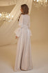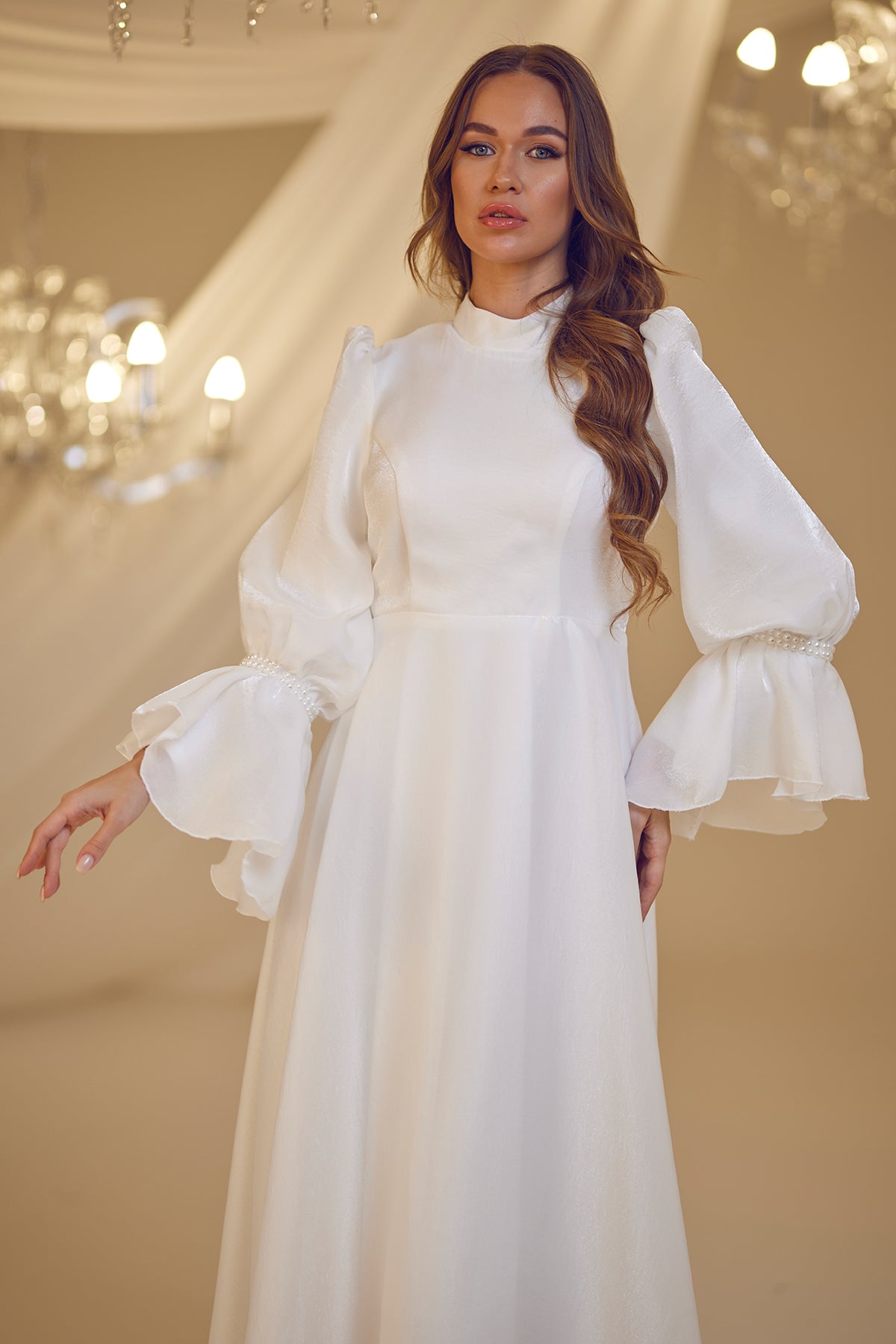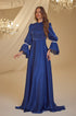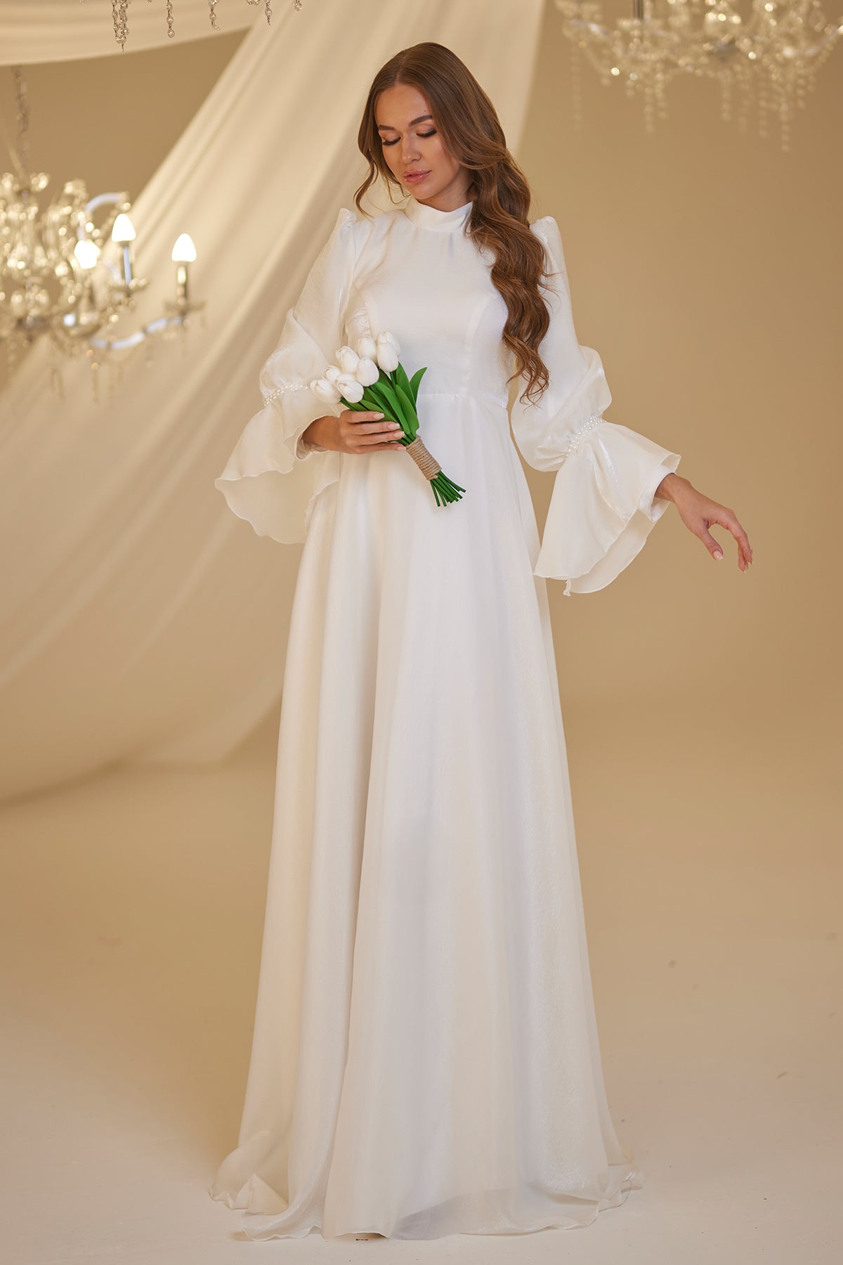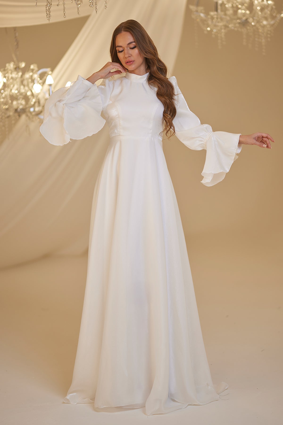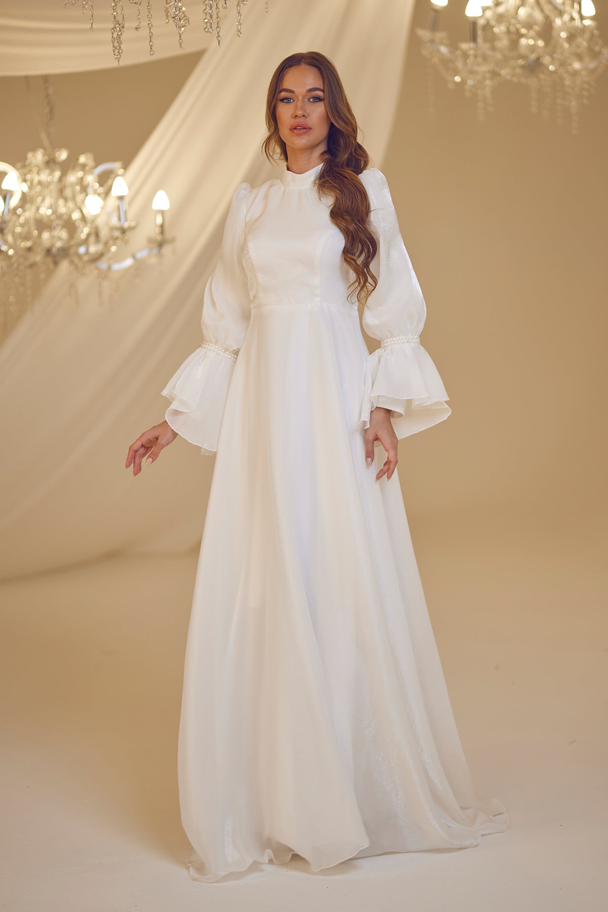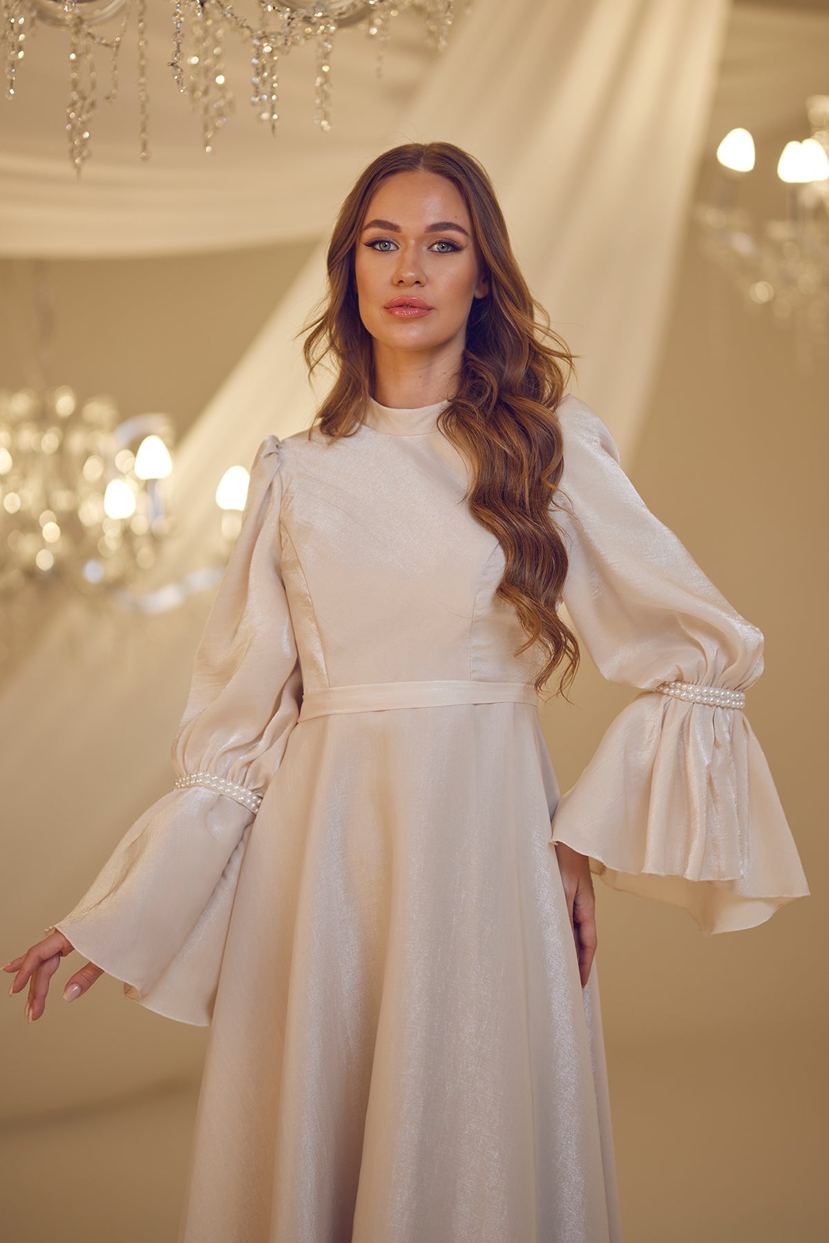 Trompet kol olarak tasarlanmış ve her iki kolda incilerle süslenmiş şifon inci abiye modelimiz arkadan gizli fermuarlı olup astarlıdır.