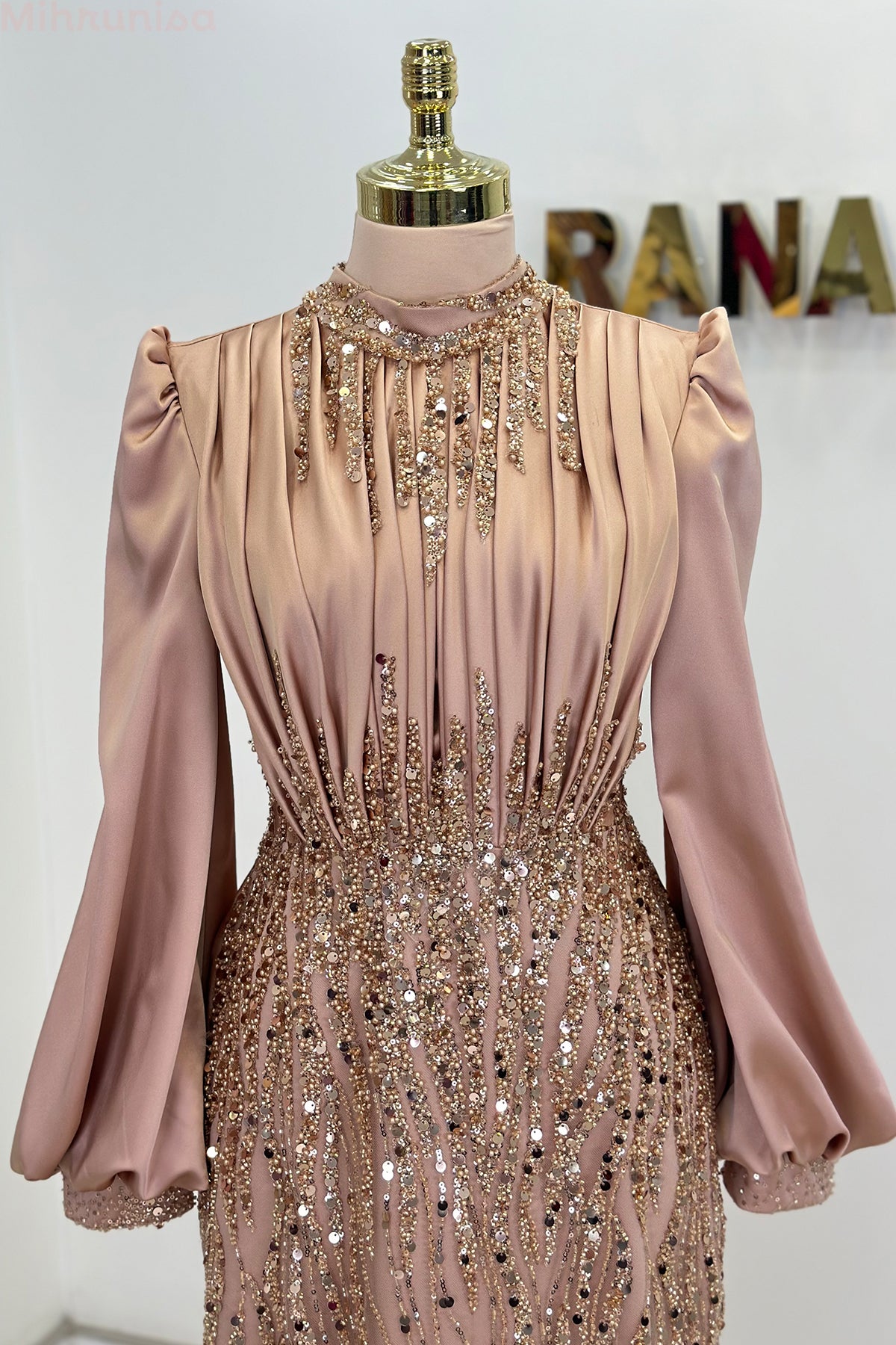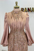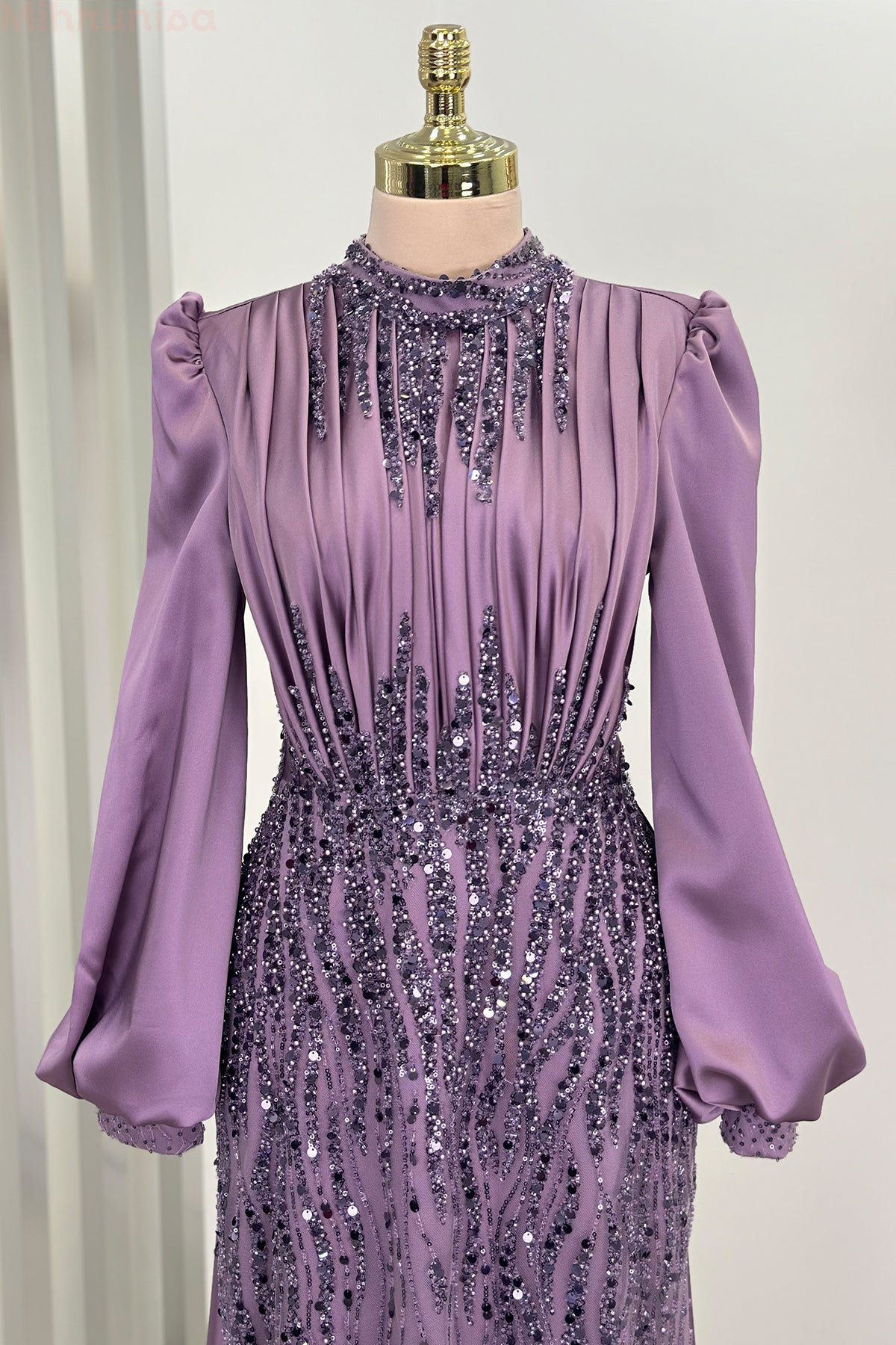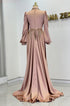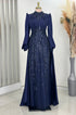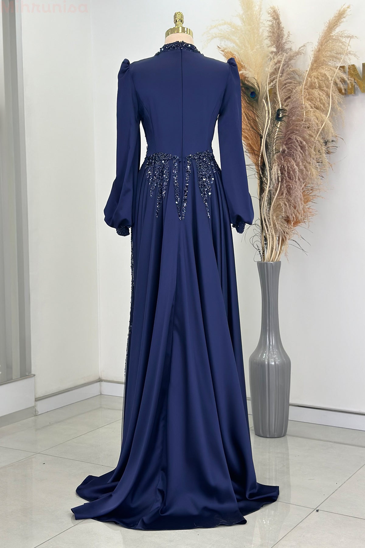 Ön kısmı tamamen pul ve taş işlemeli olan incilay abiye modelimizin pelerin eteği olup balon koldur, astarlıdır ve arkadan gizli fermuarlıdır.