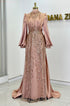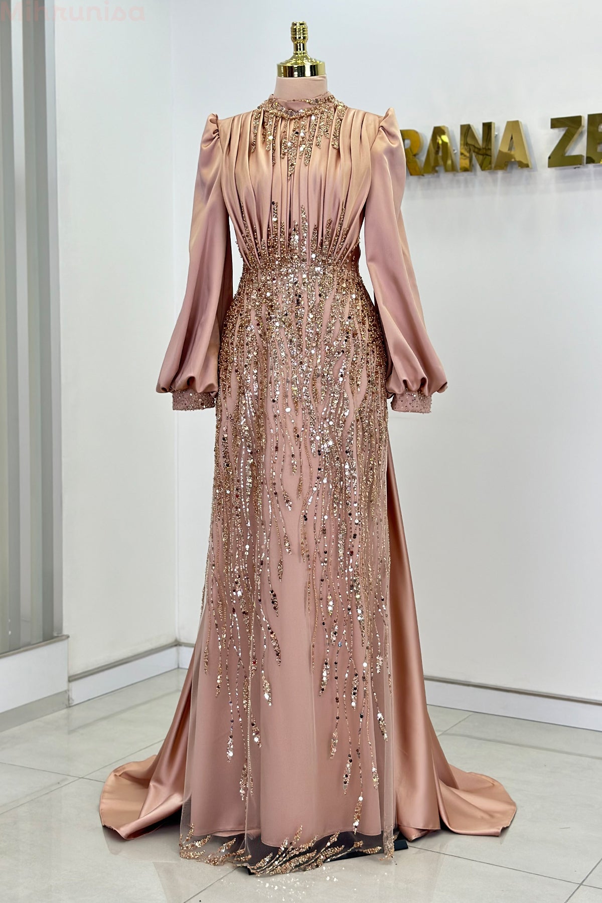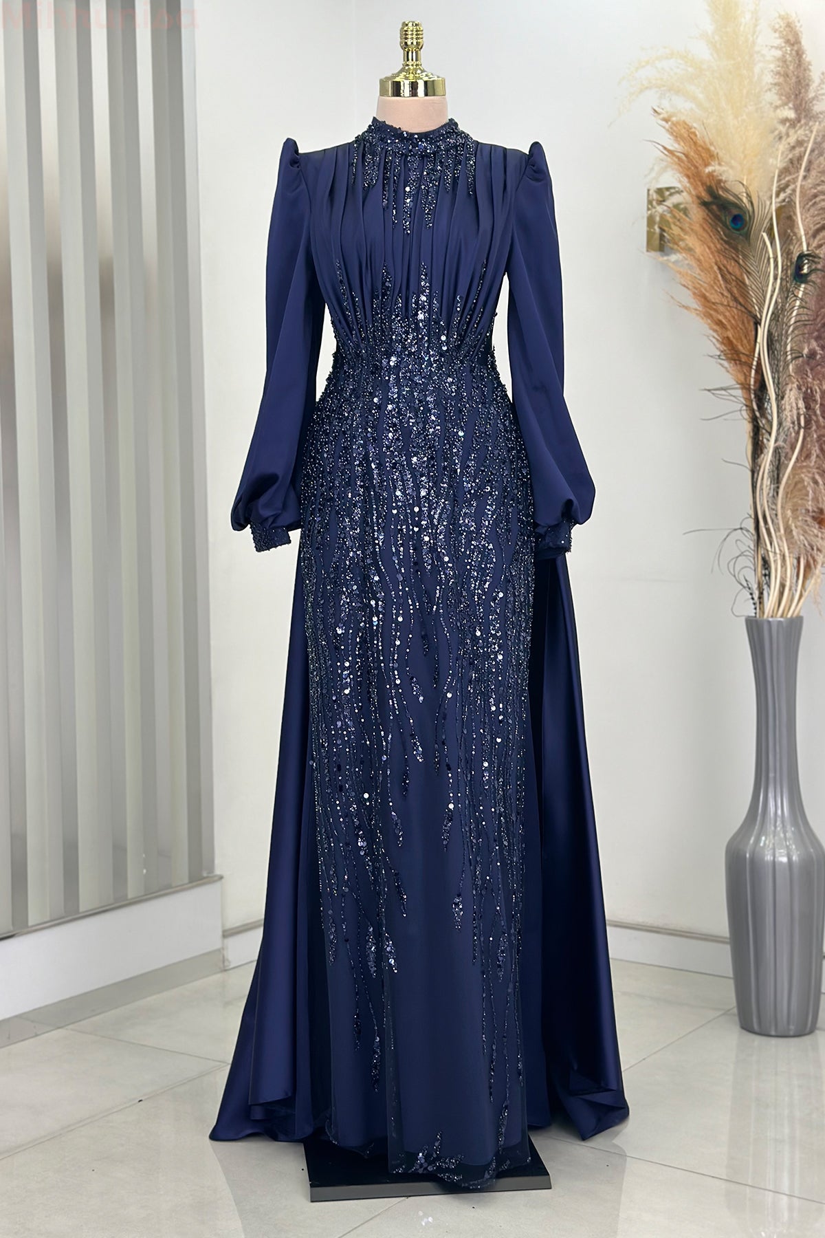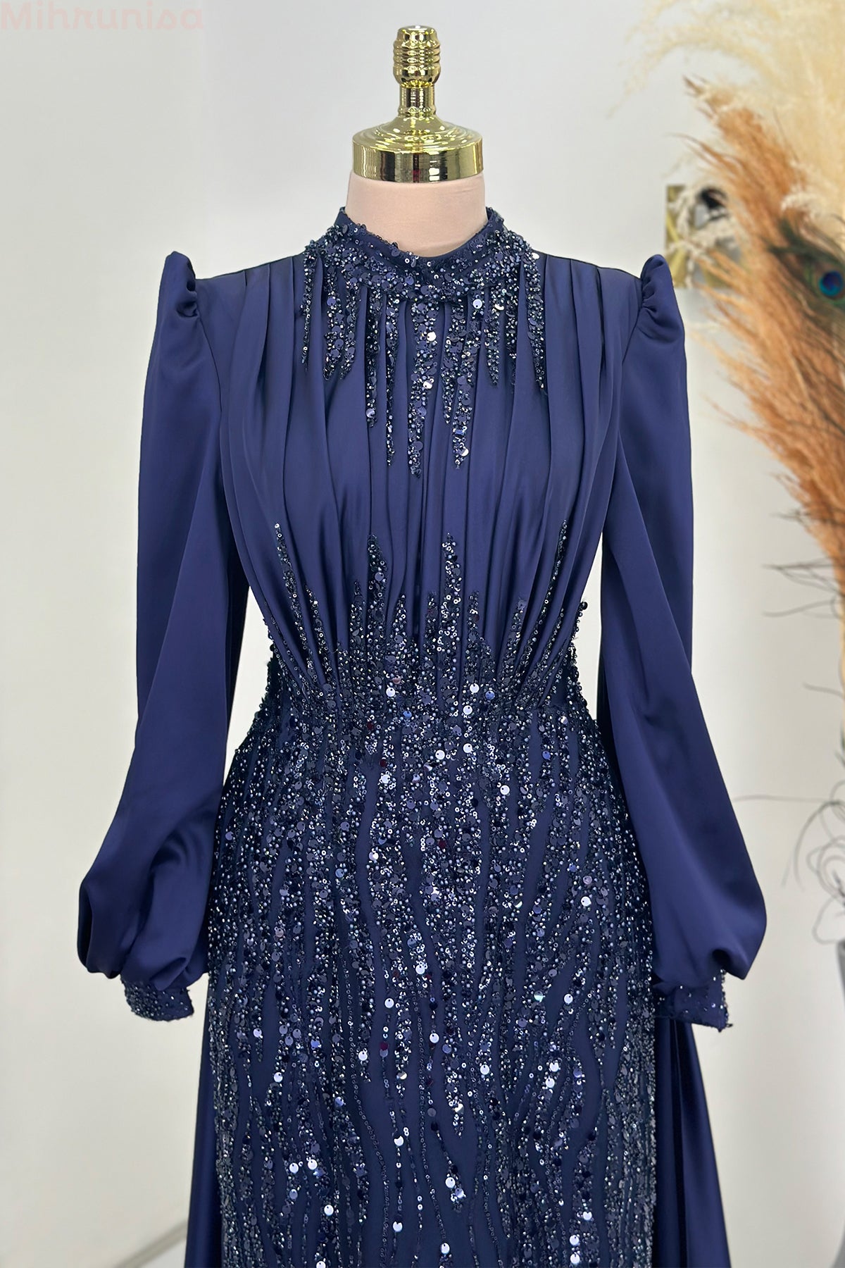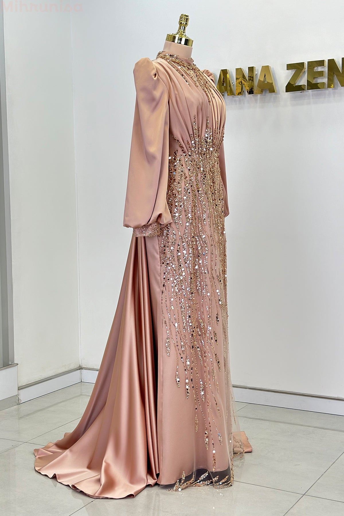 Ön kısmı tamamen pul ve taş işlemeli olan incilay abiye modelimizin pelerin eteği olup balon koldur, astarlıdır ve arkadan gizli fermuarlıdır.