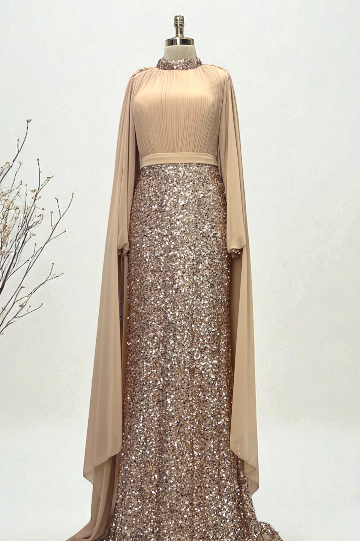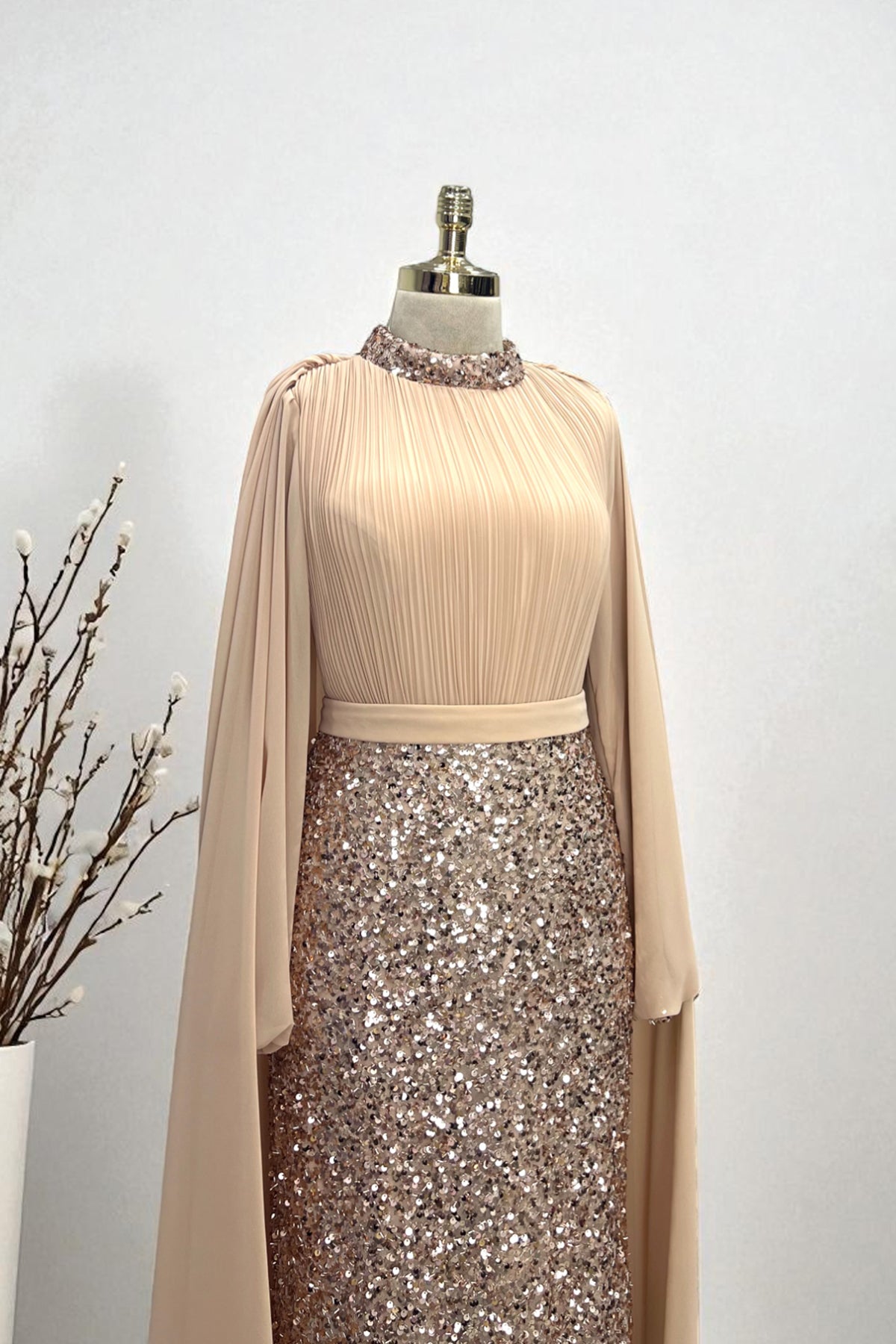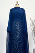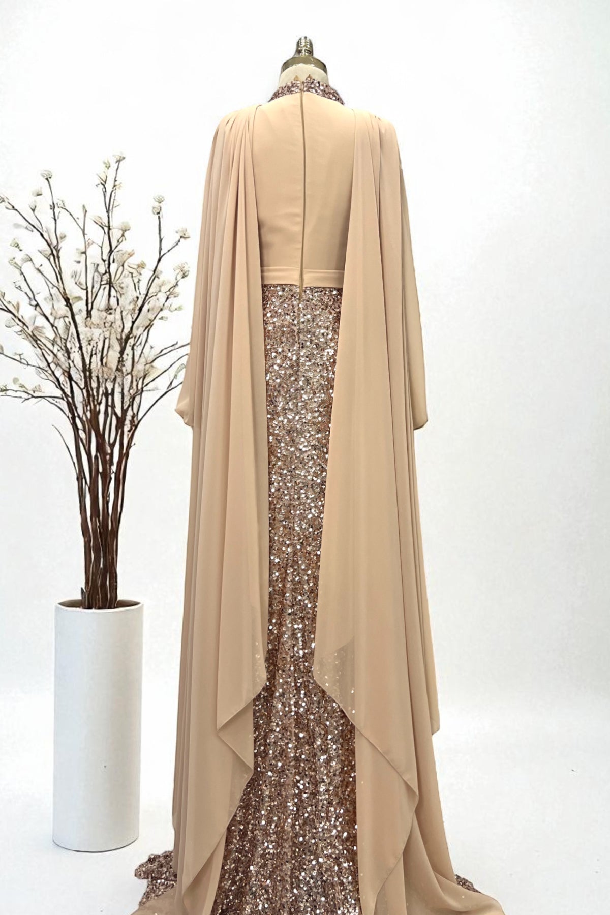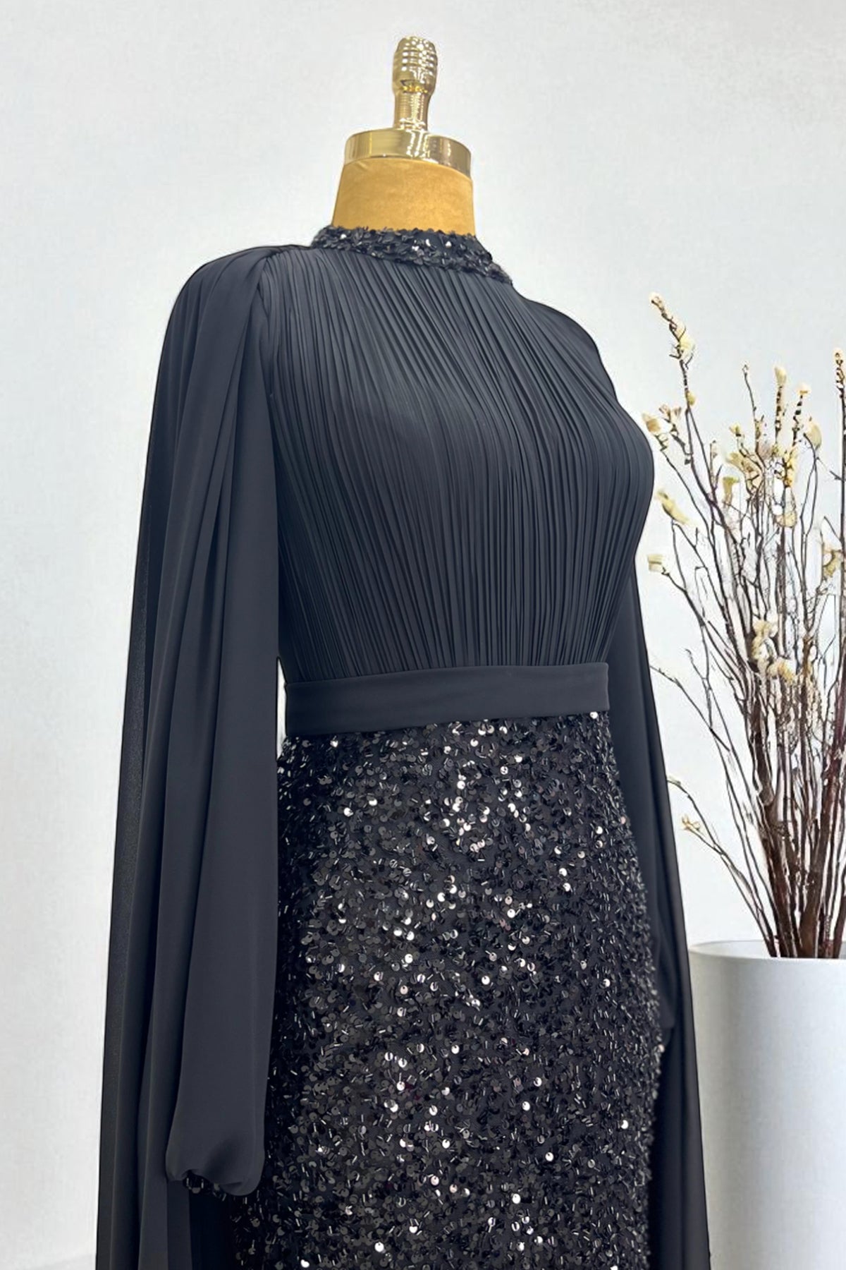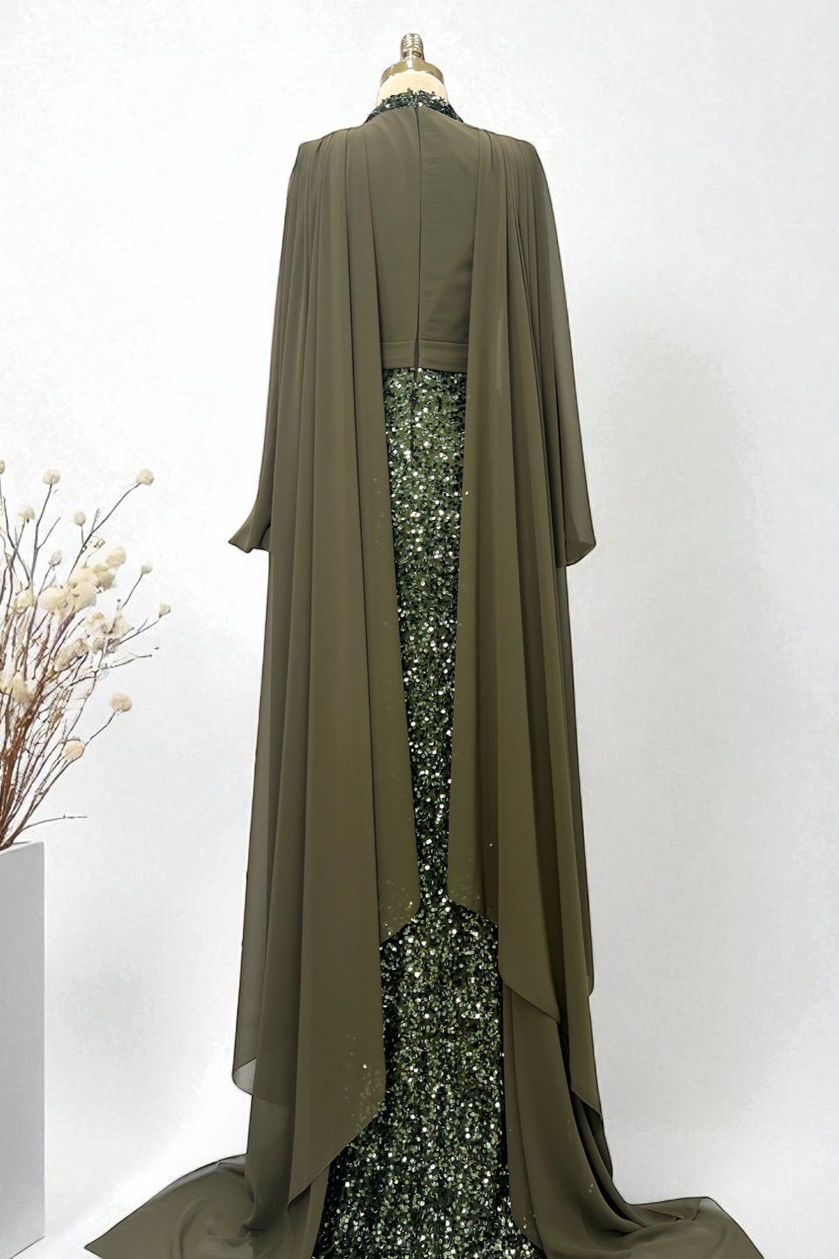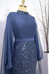 - Omuzdan şifon pelerinli, ışıltılı detayları ve akıcı tasarımıyla özel günlerde şık bir görünüm sunar.