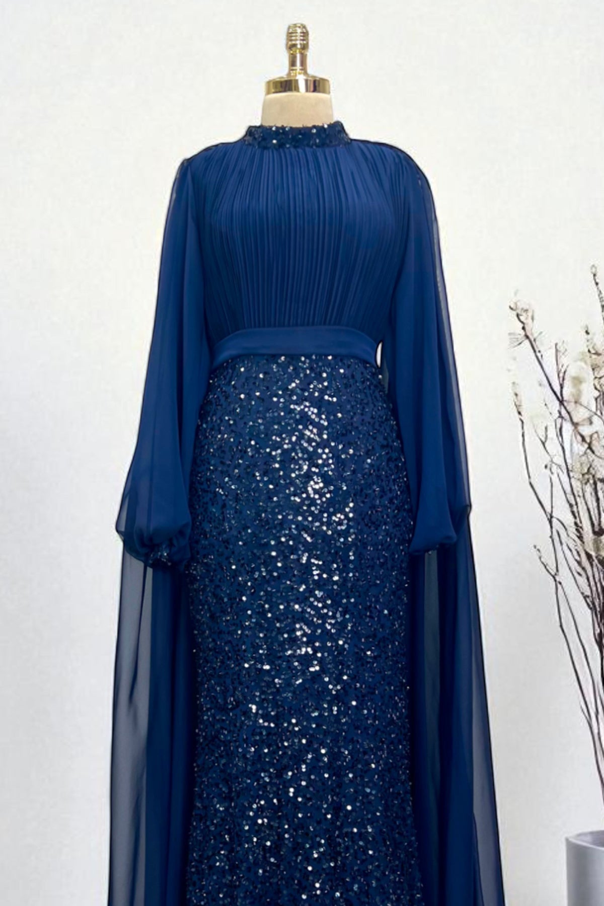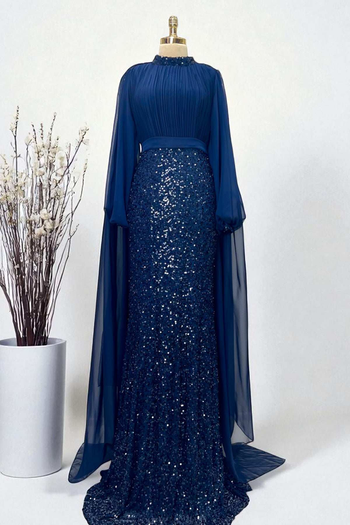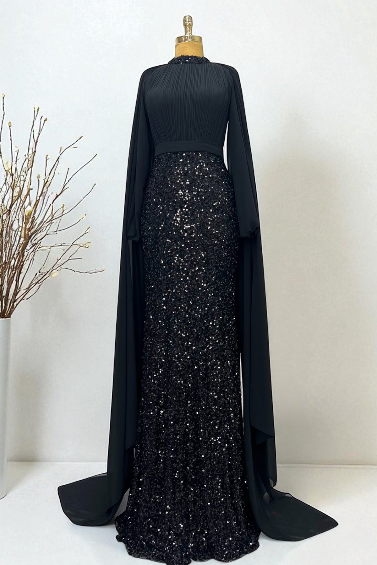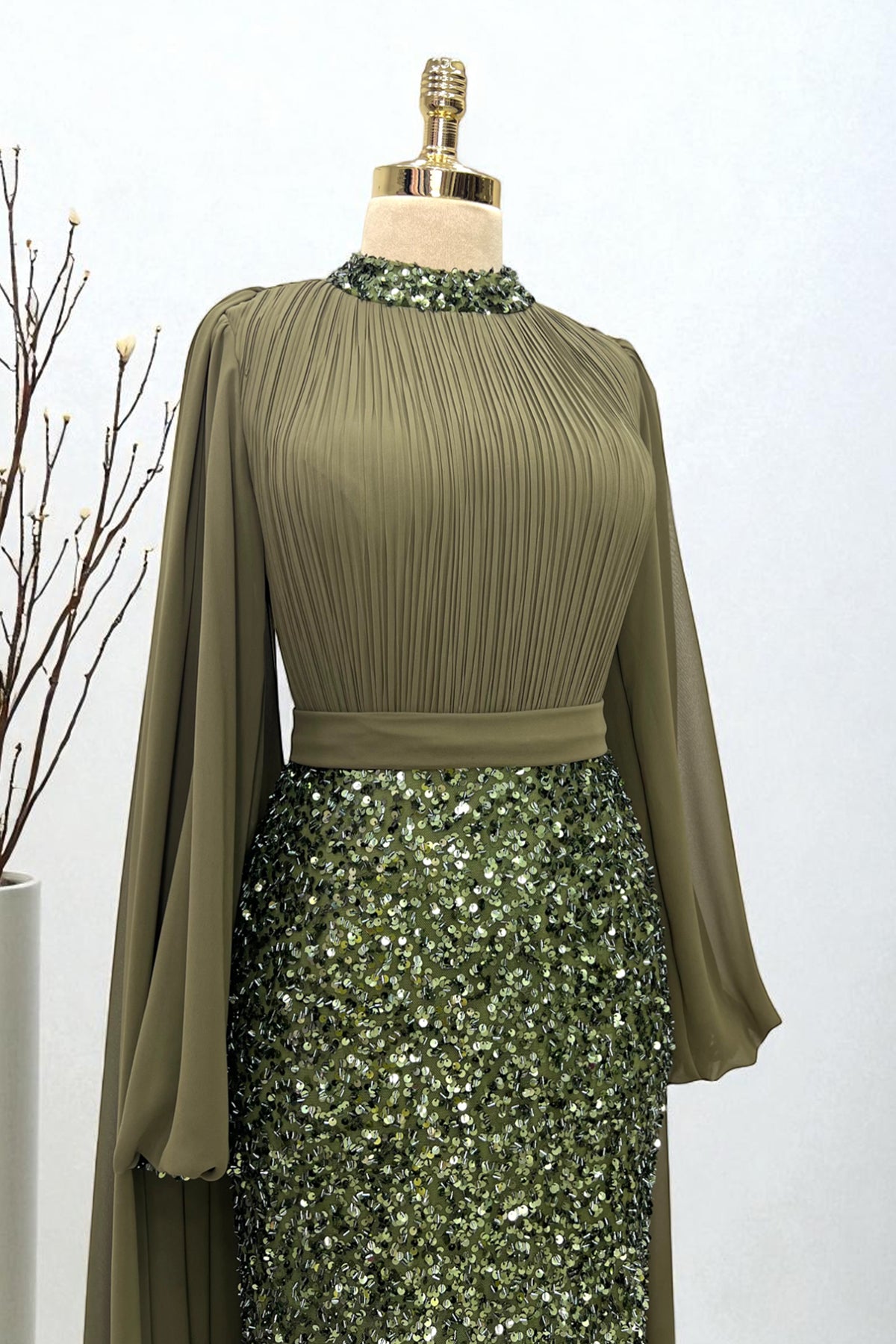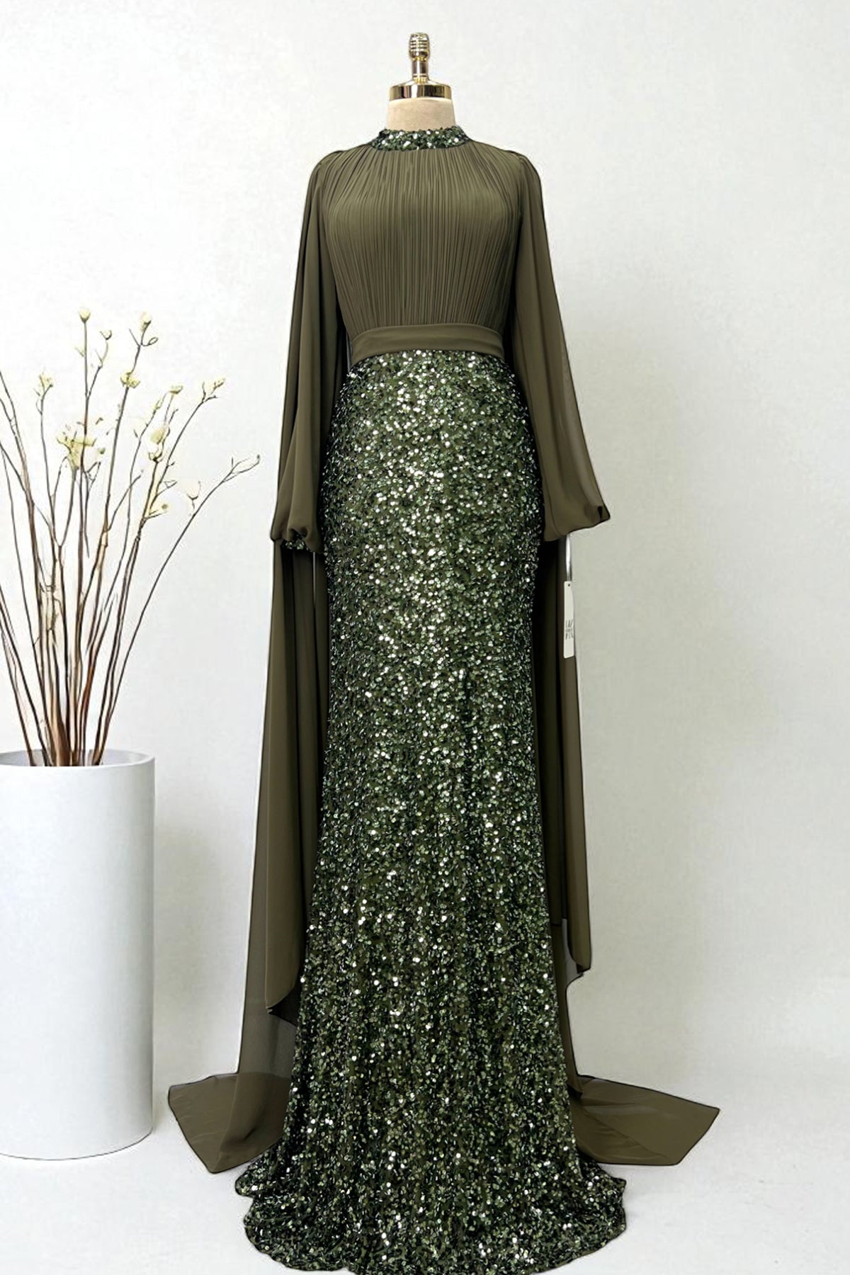 - Omuzdan şifon pelerinli, ışıltılı detayları ve akıcı tasarımıyla özel günlerde şık bir görünüm sunar.