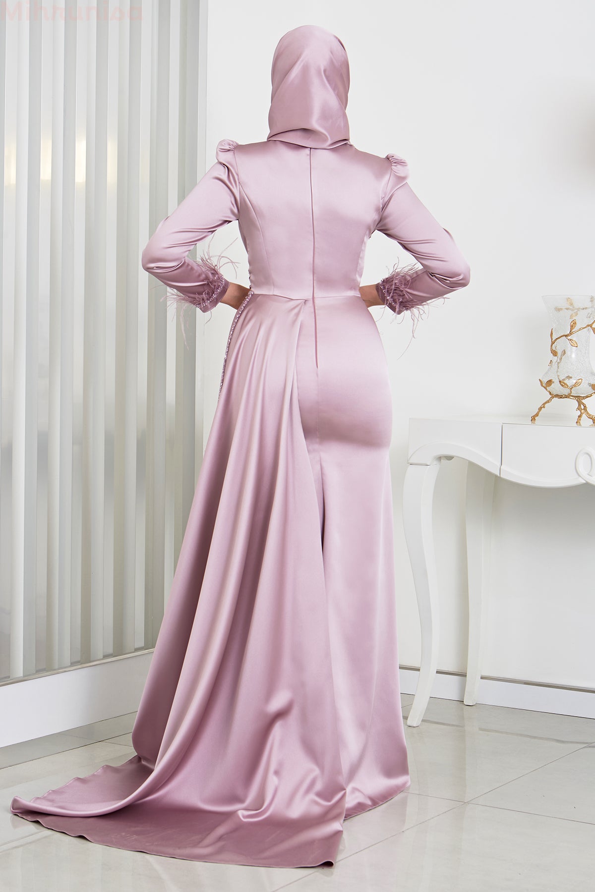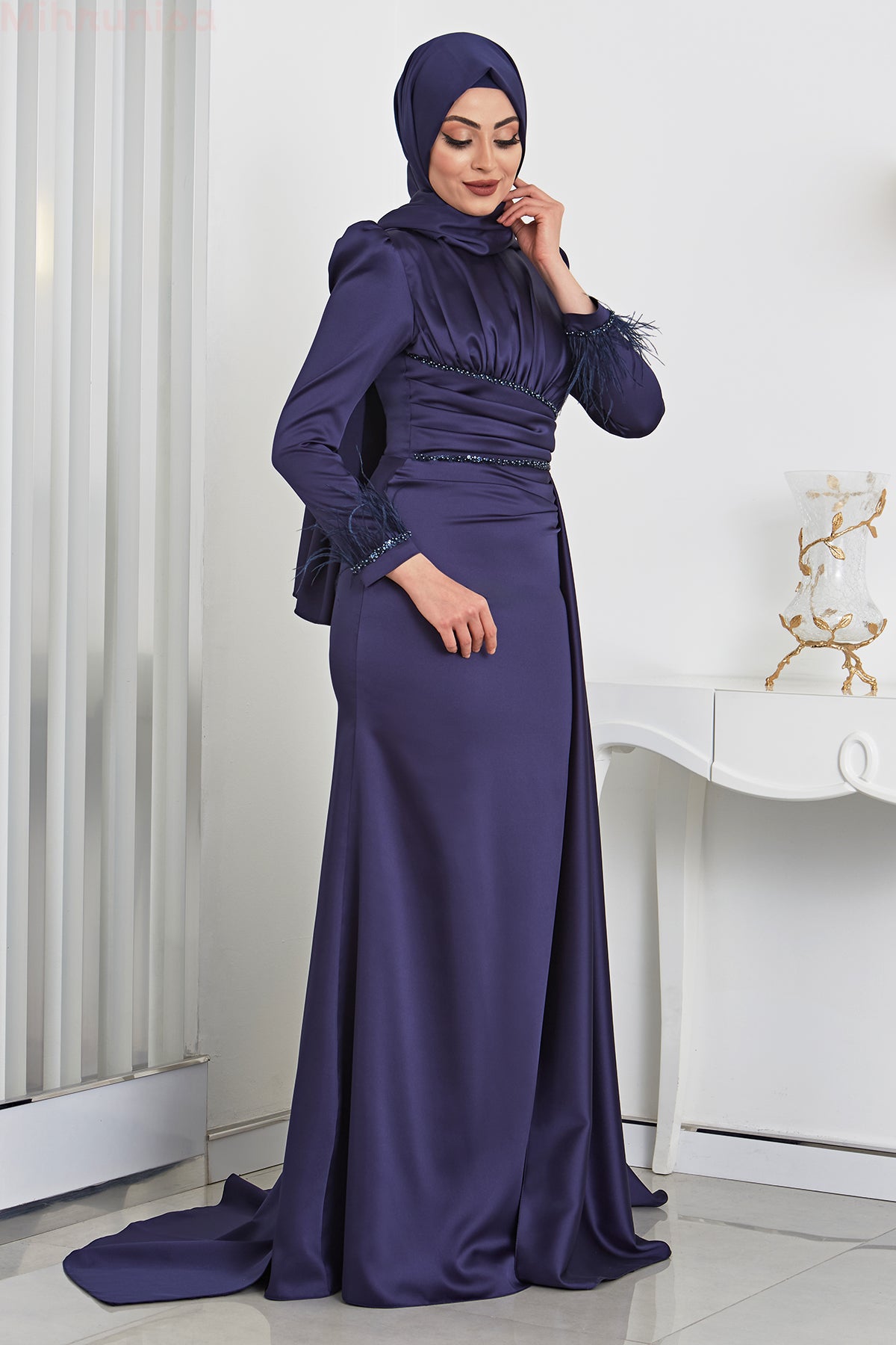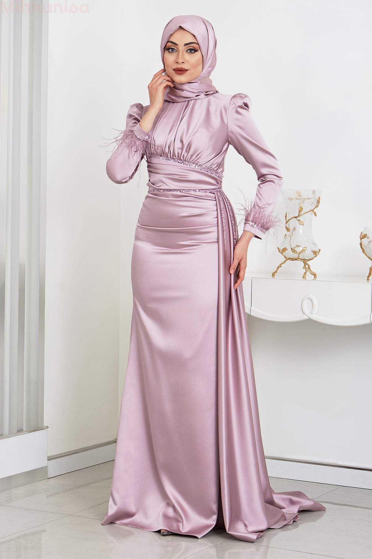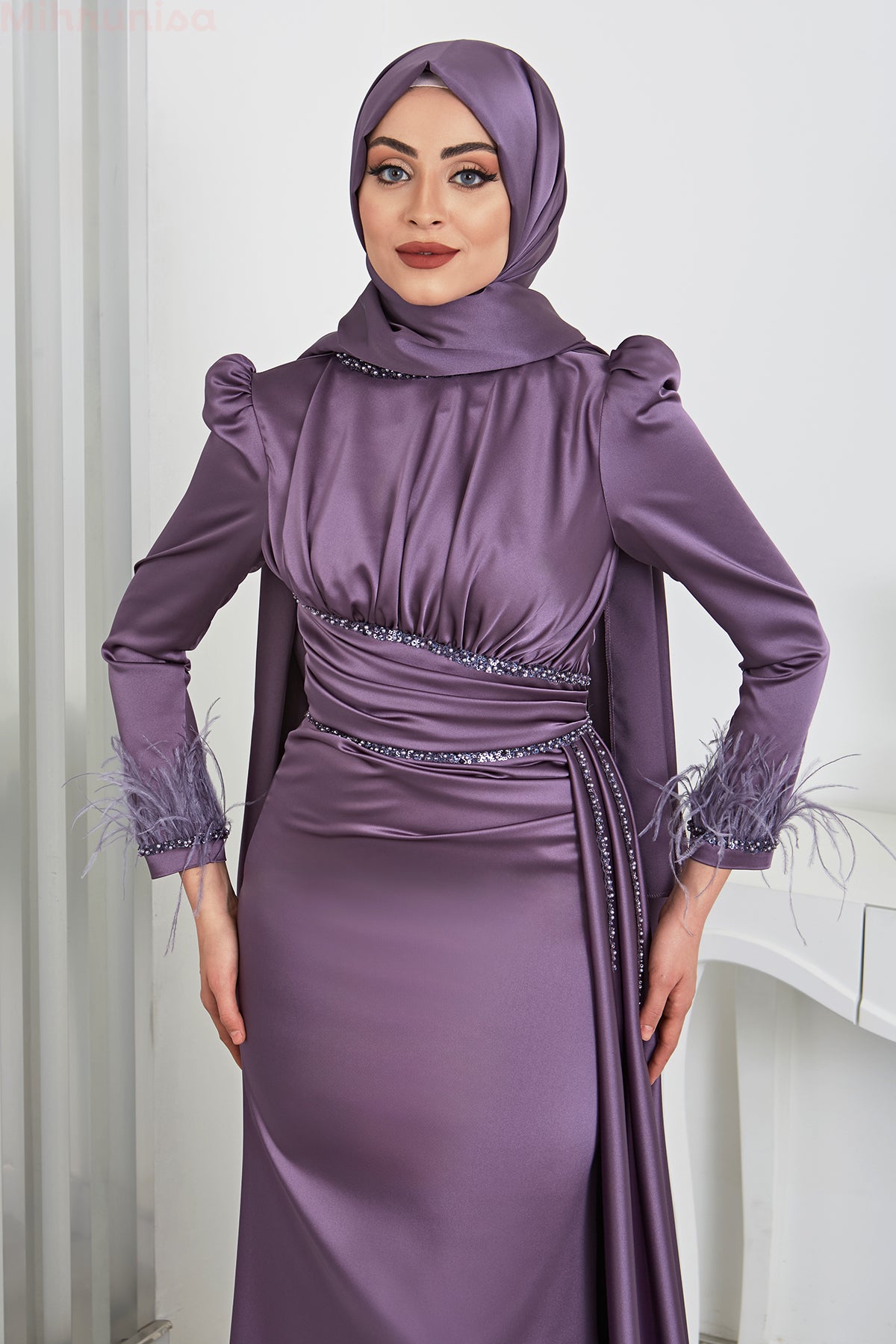 Kol uçlarında taş ve tüy detayları olan marinette abiye modelimiz pelerin kuyruğa sahip olup astarlıdır ve arkadan gizli fermuarlıdır.