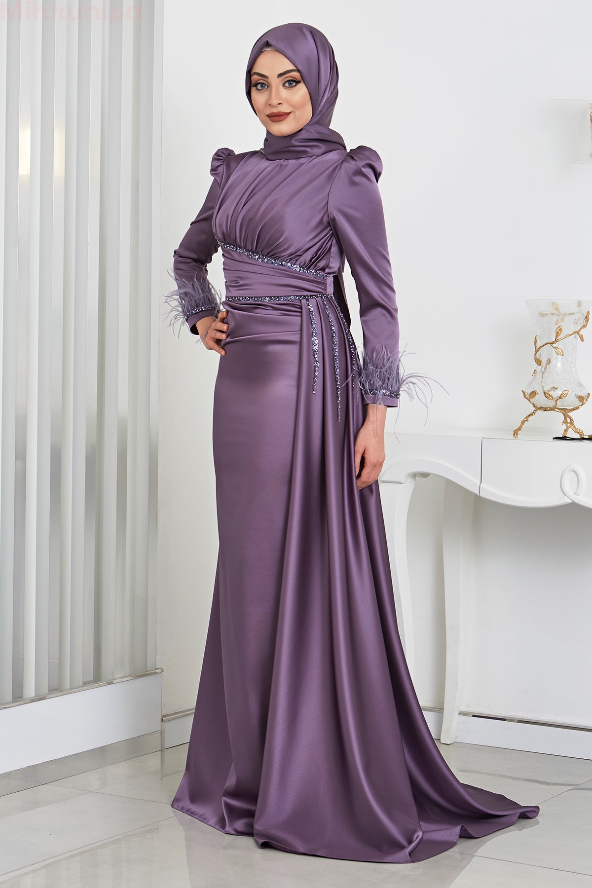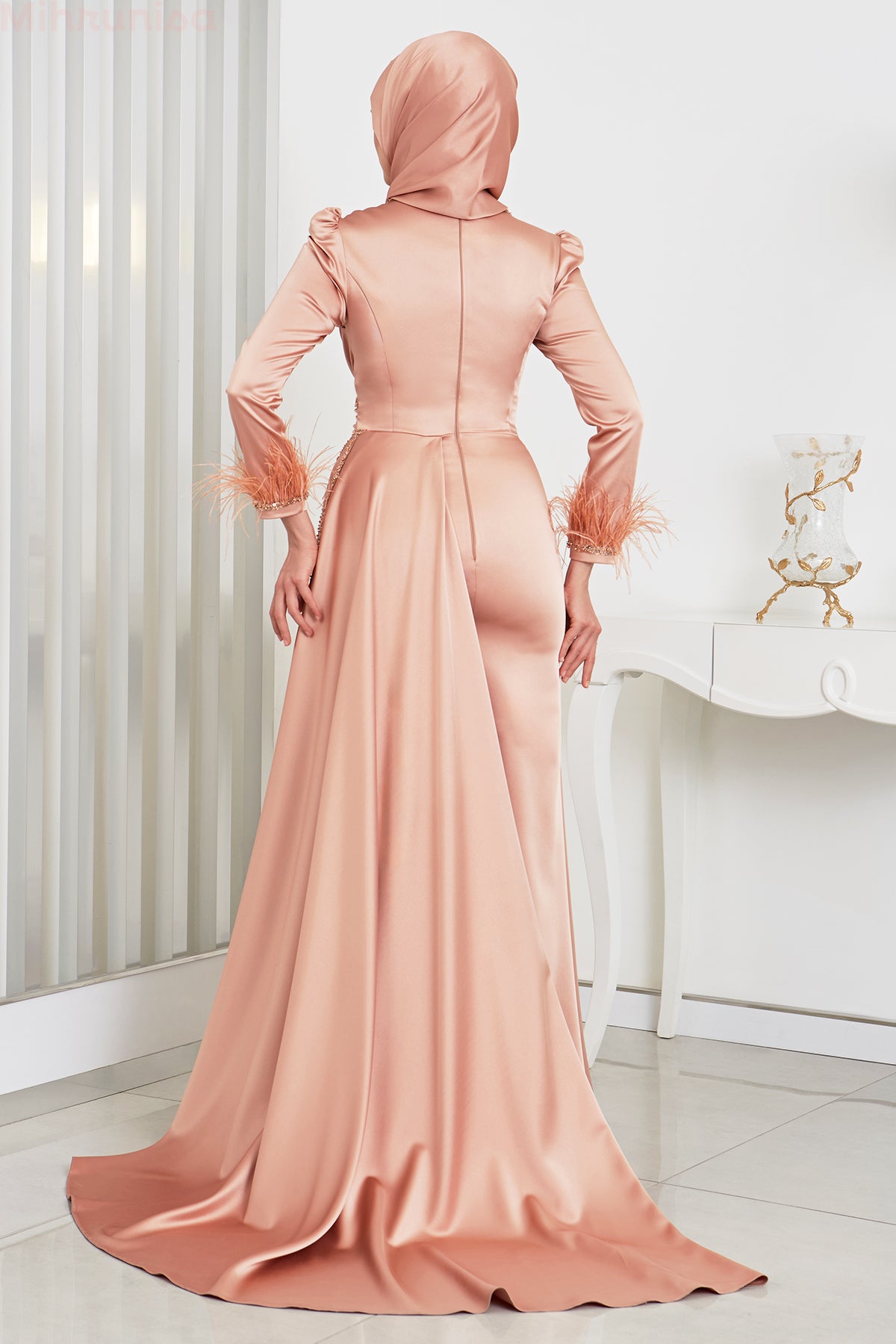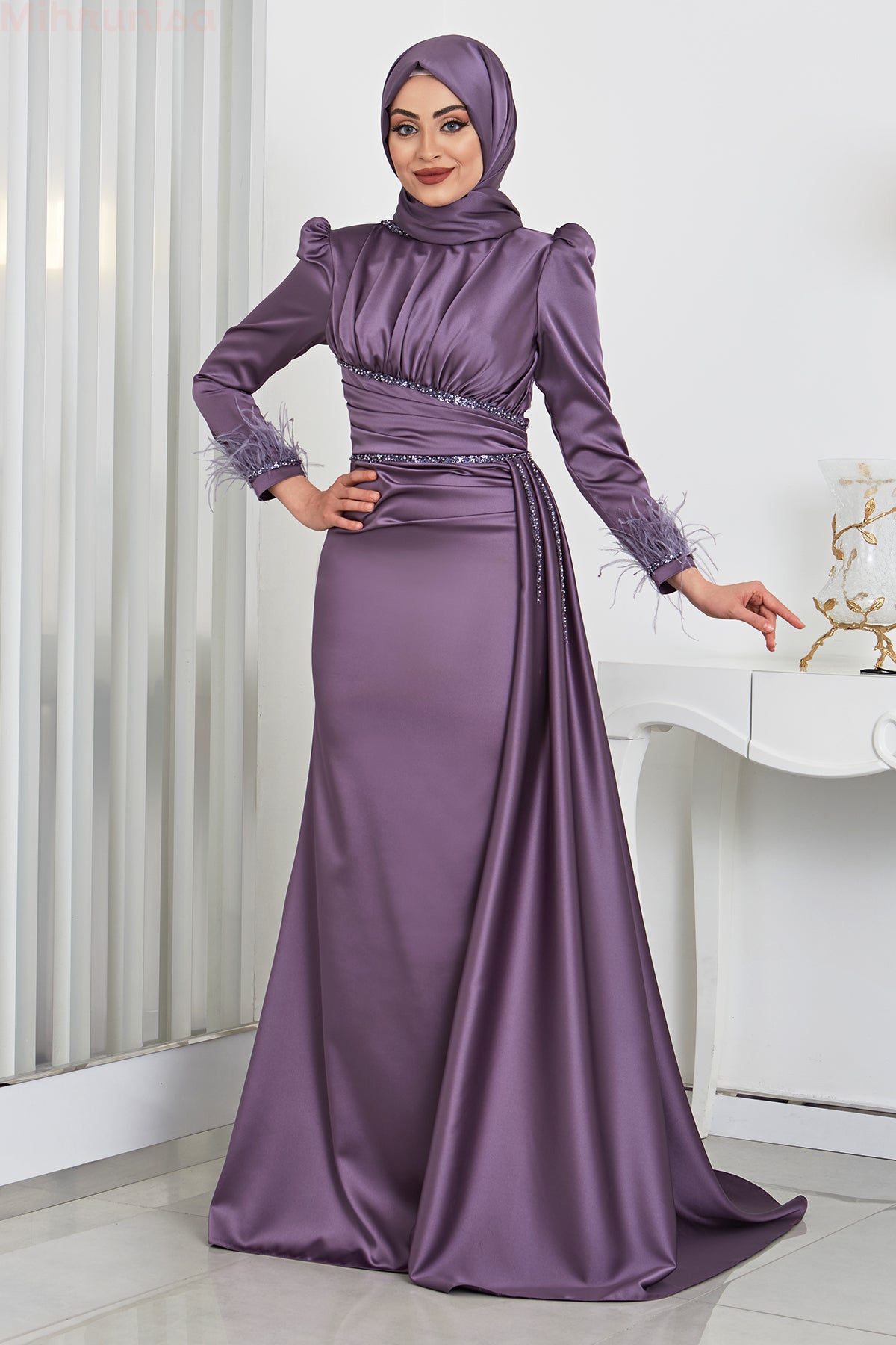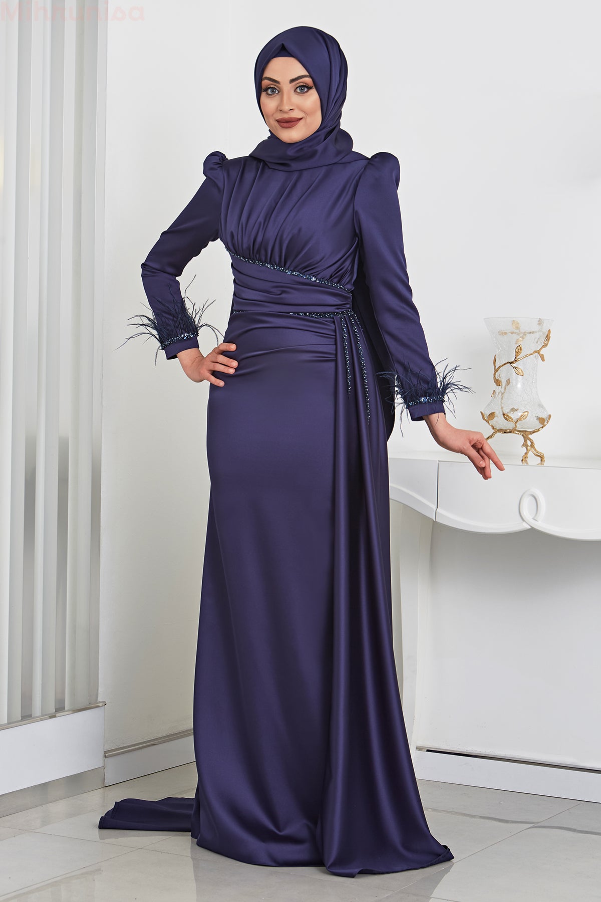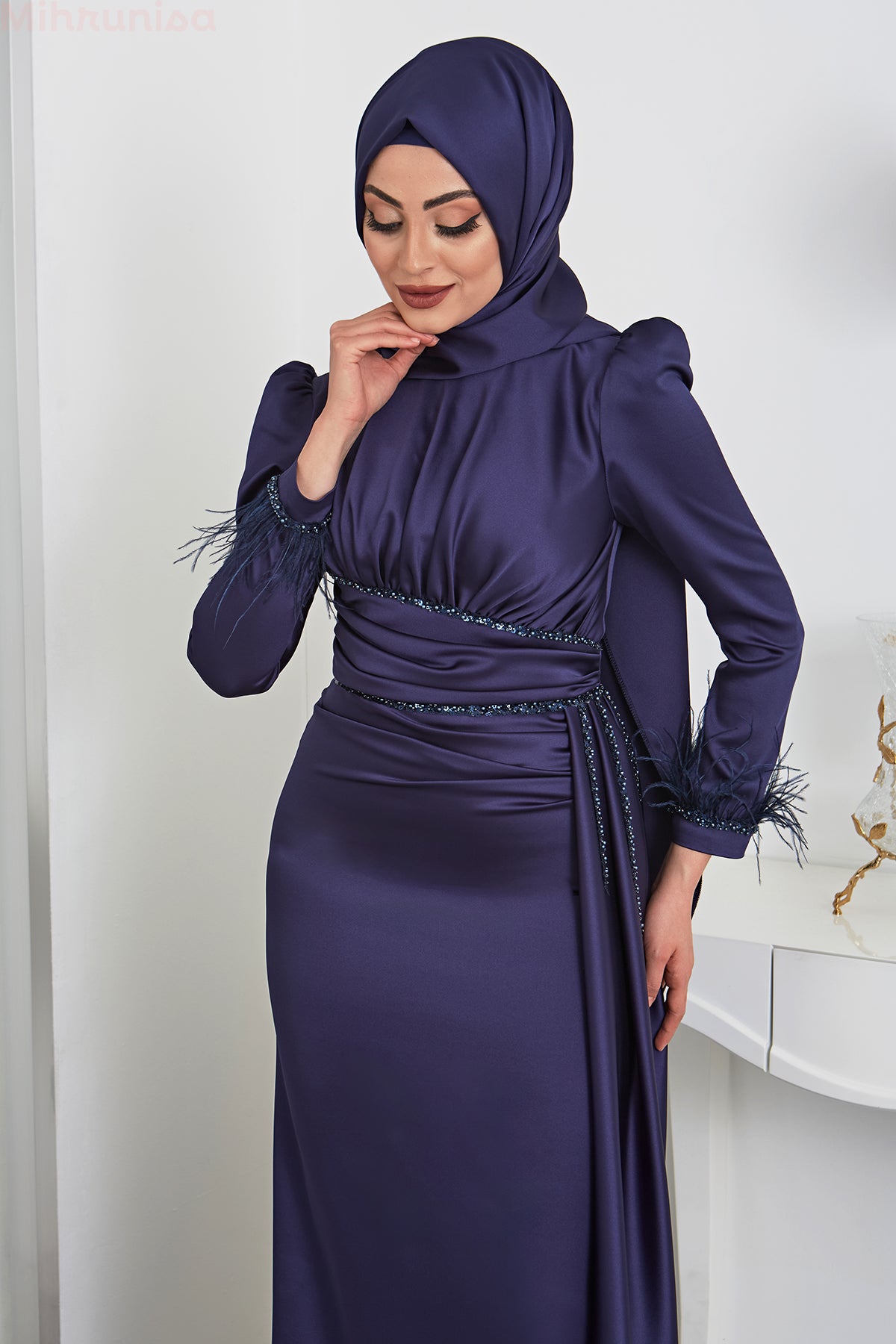Kol uçlarında taş ve tüy detayları olan marinette abiye modelimiz pelerin kuyruğa sahip olup astarlıdır ve arkadan gizli fermuarlıdır.