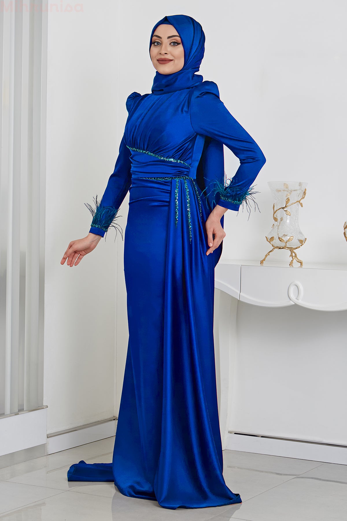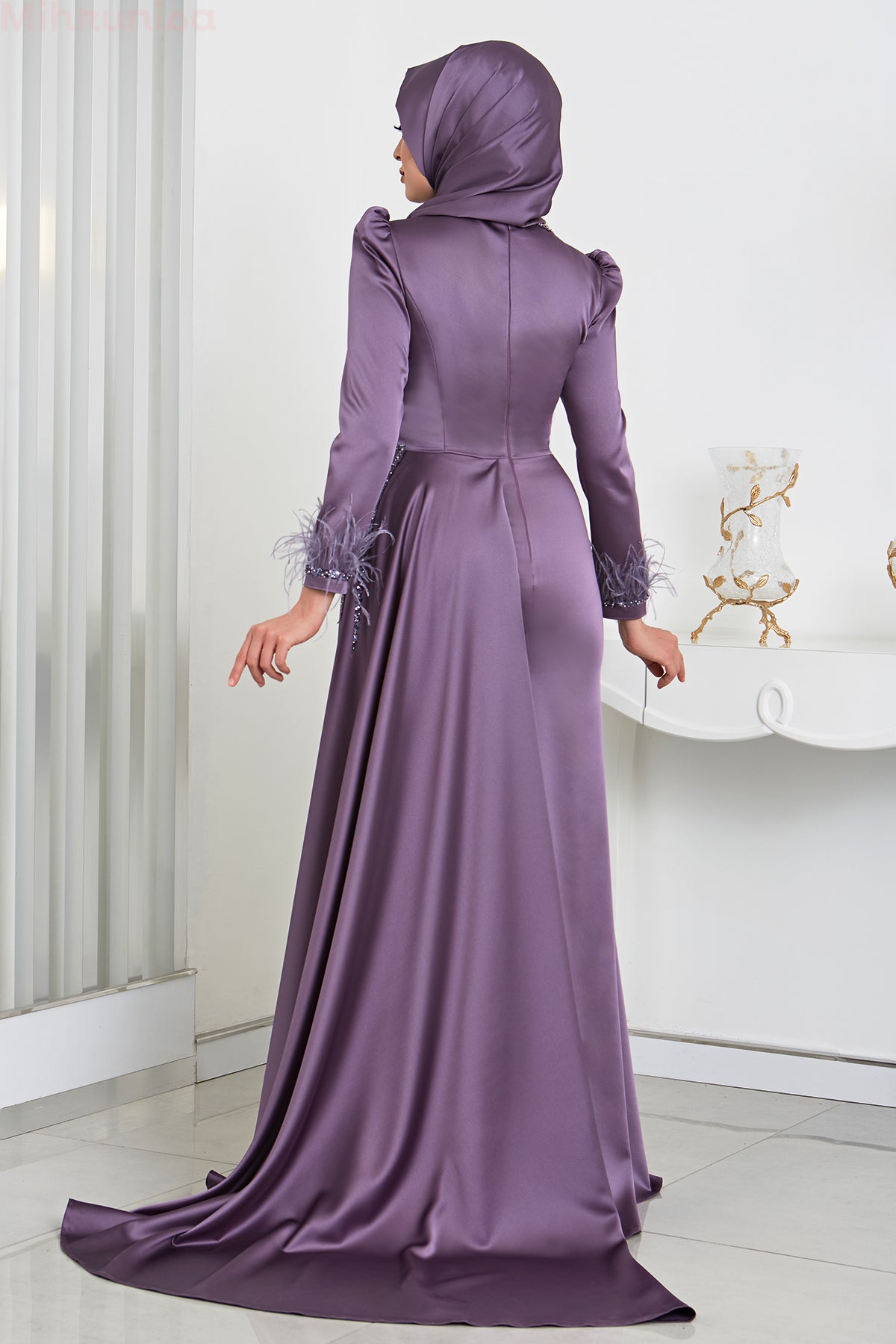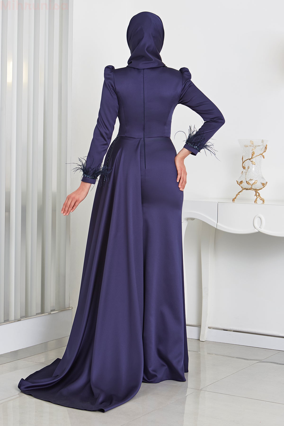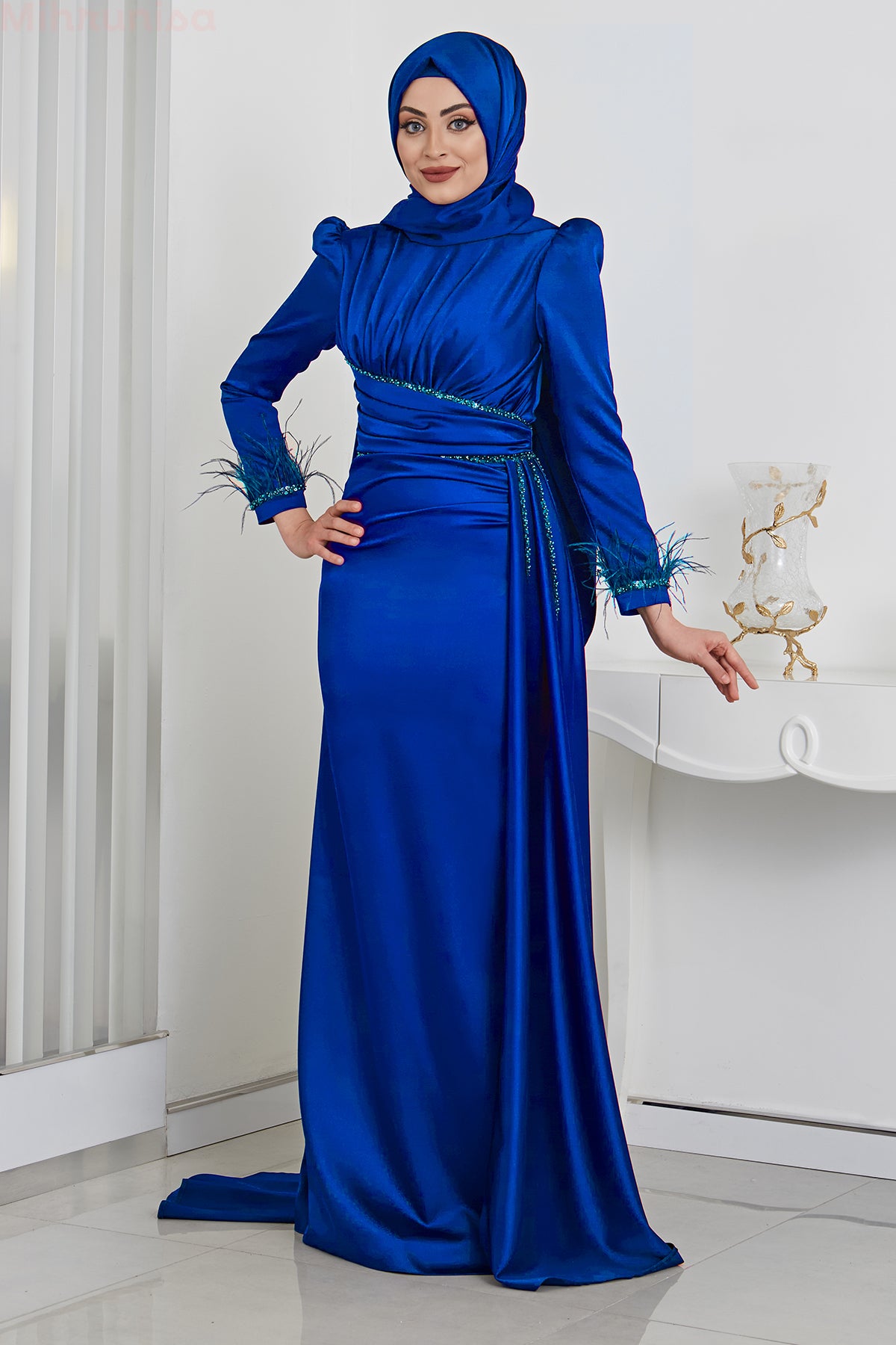 Kol uçlarında taş ve tüy detayları olan marinette abiye modelimiz pelerin kuyruğa sahip olup astarlıdır ve arkadan gizli fermuarlıdır.