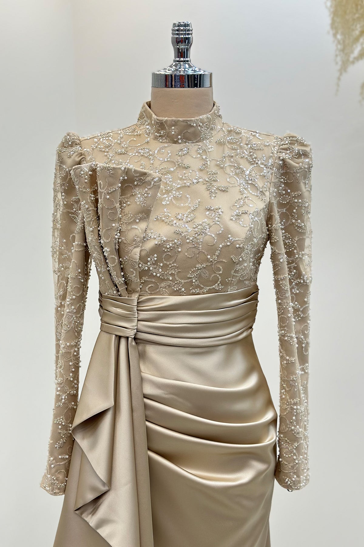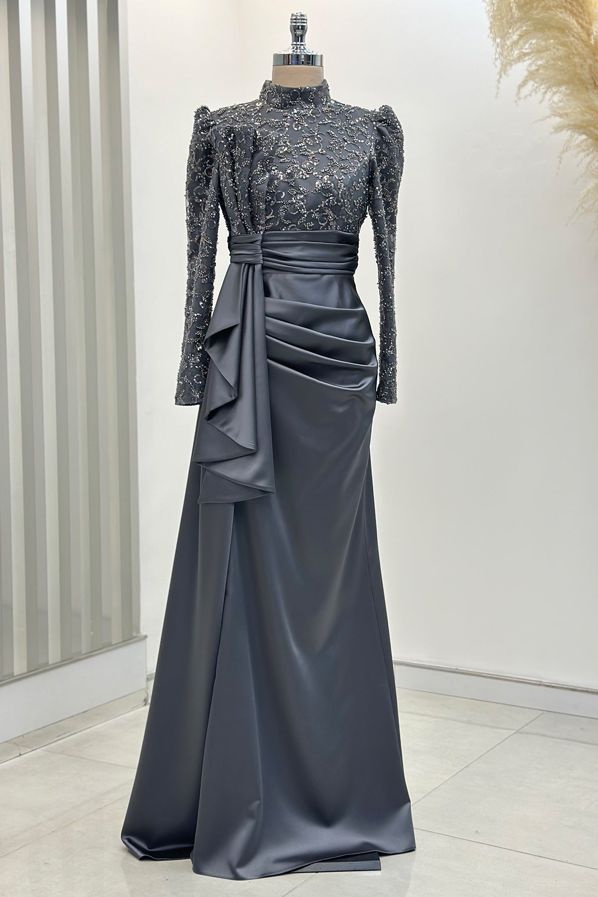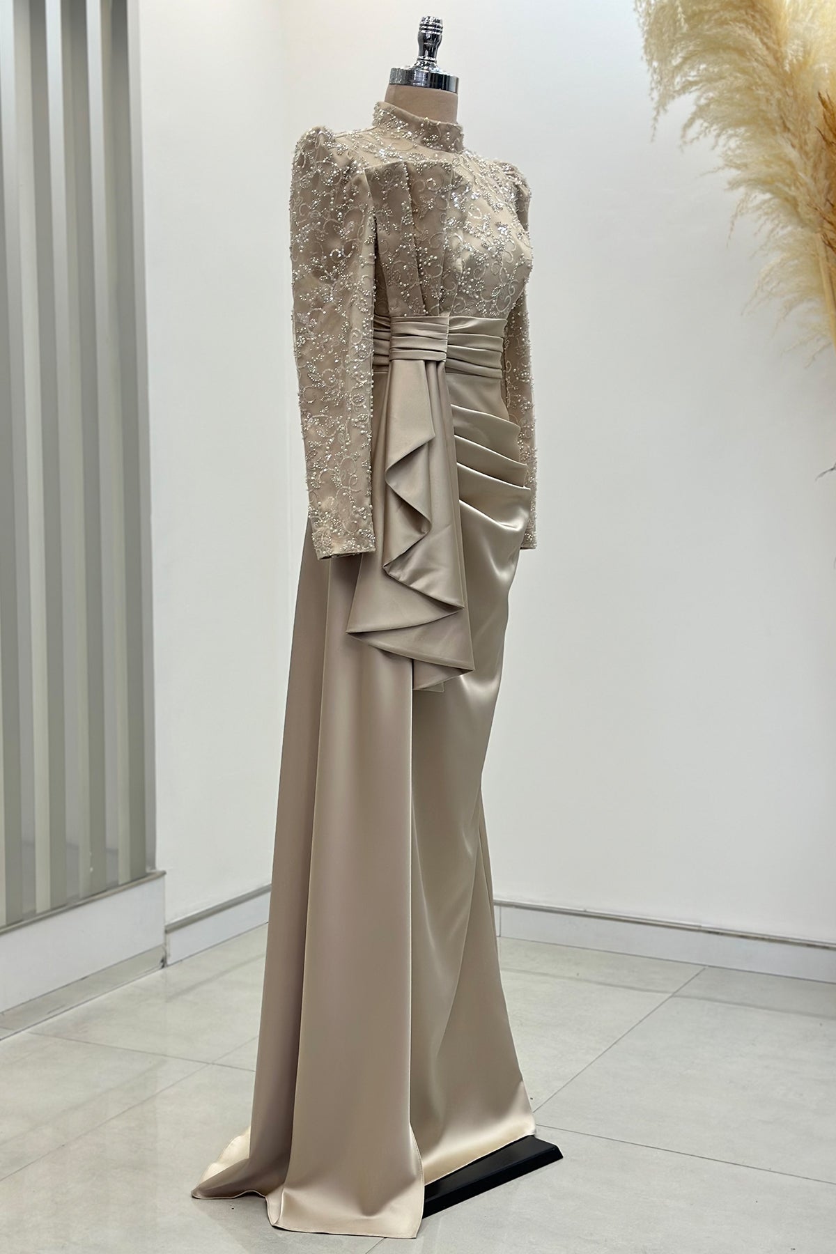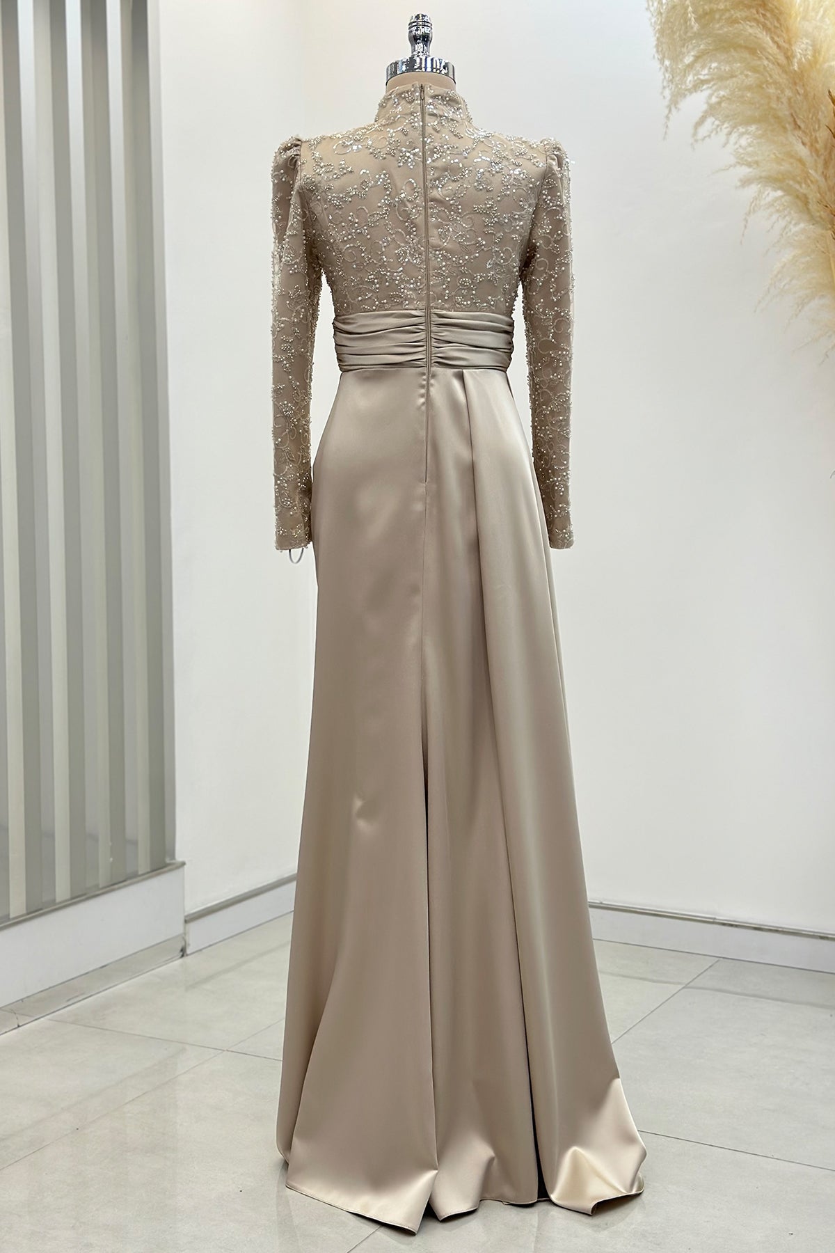 Üst kısmı ve kollarında taş işlemeleri yapılan belinde papyon detayı olan merva abiye modelimiz arkadan gizli fermuarlı olup astarlıdır.