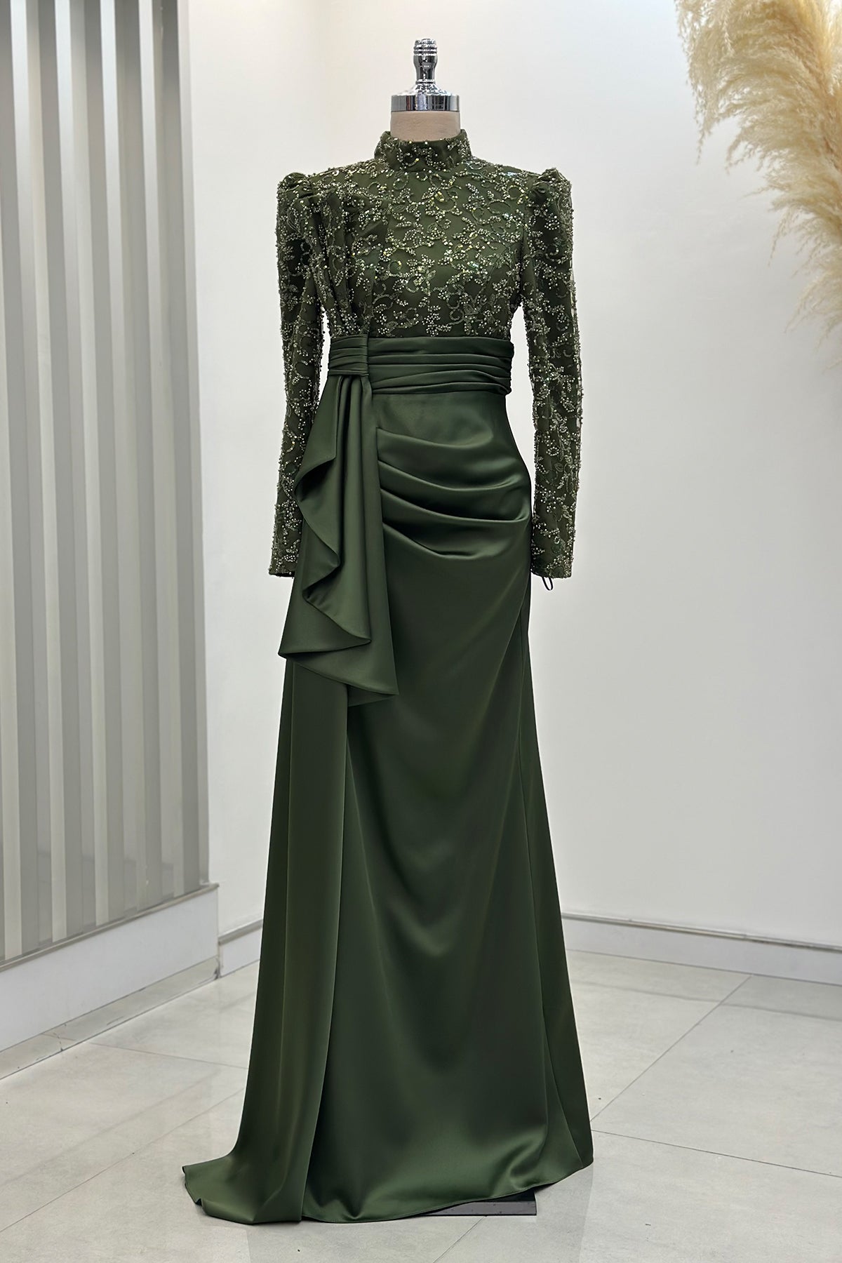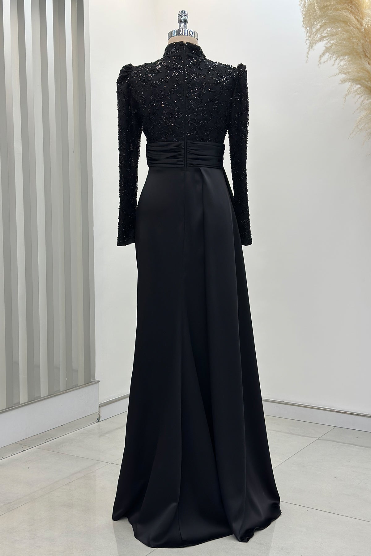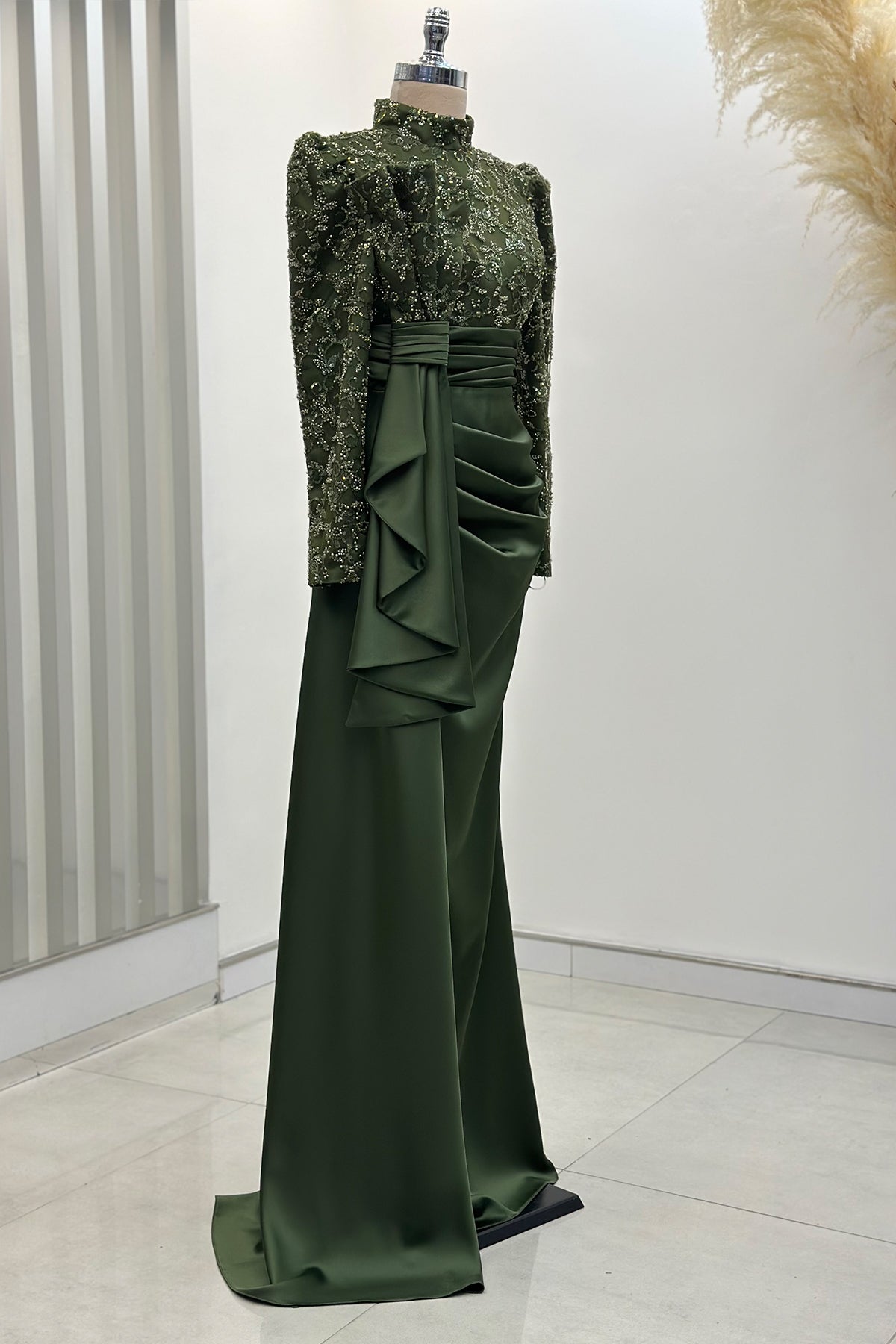 Üst kısmı ve kollarında taş işlemeleri yapılan belinde papyon detayı olan merva abiye modelimiz arkadan gizli fermuarlı olup astarlıdır.