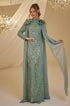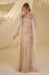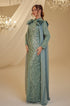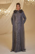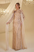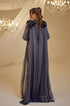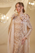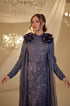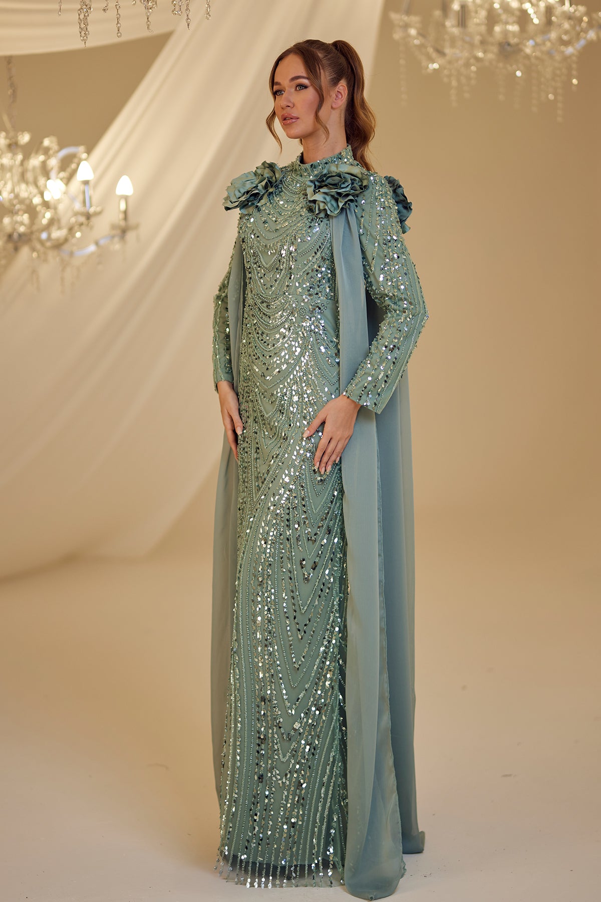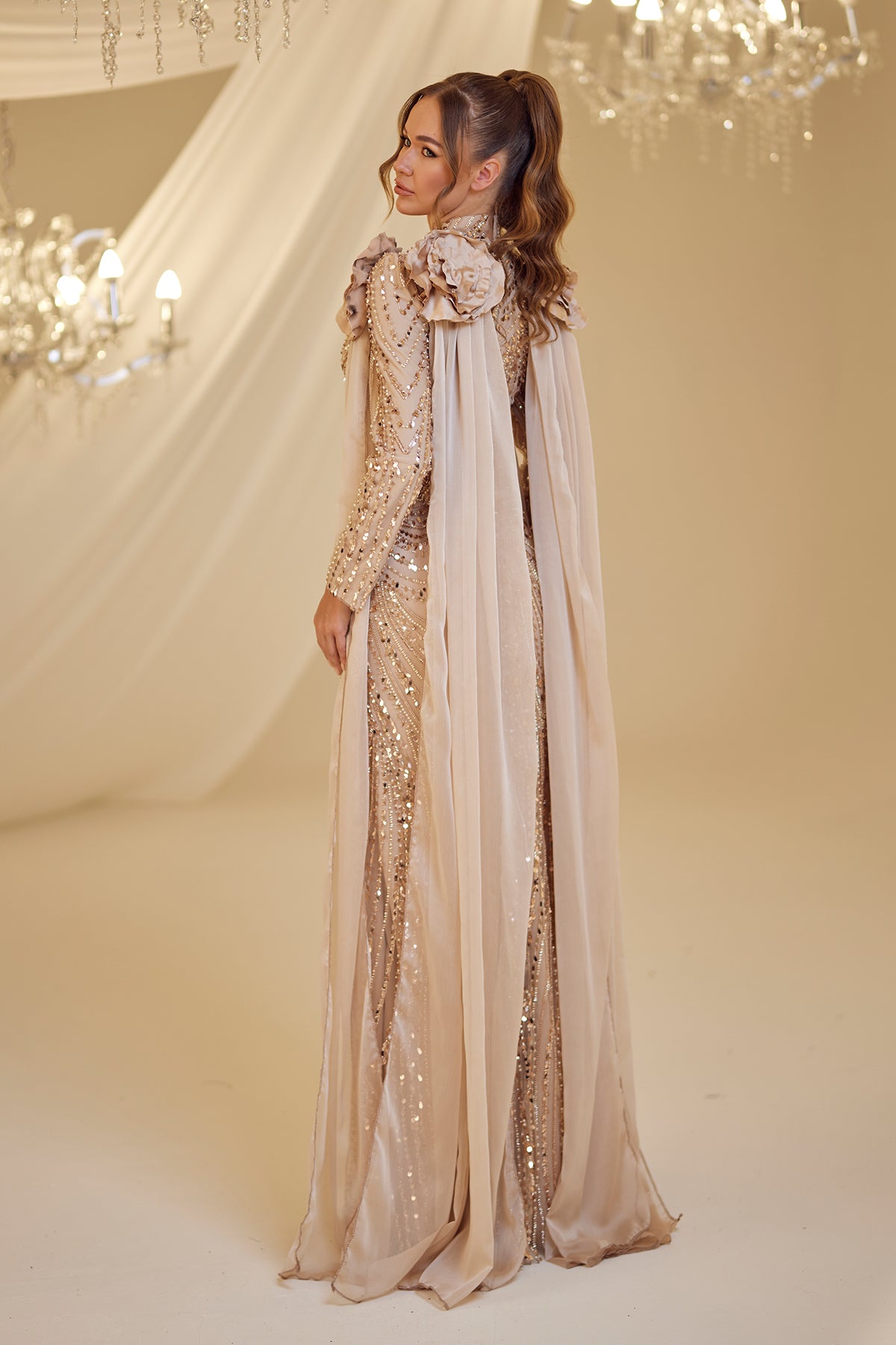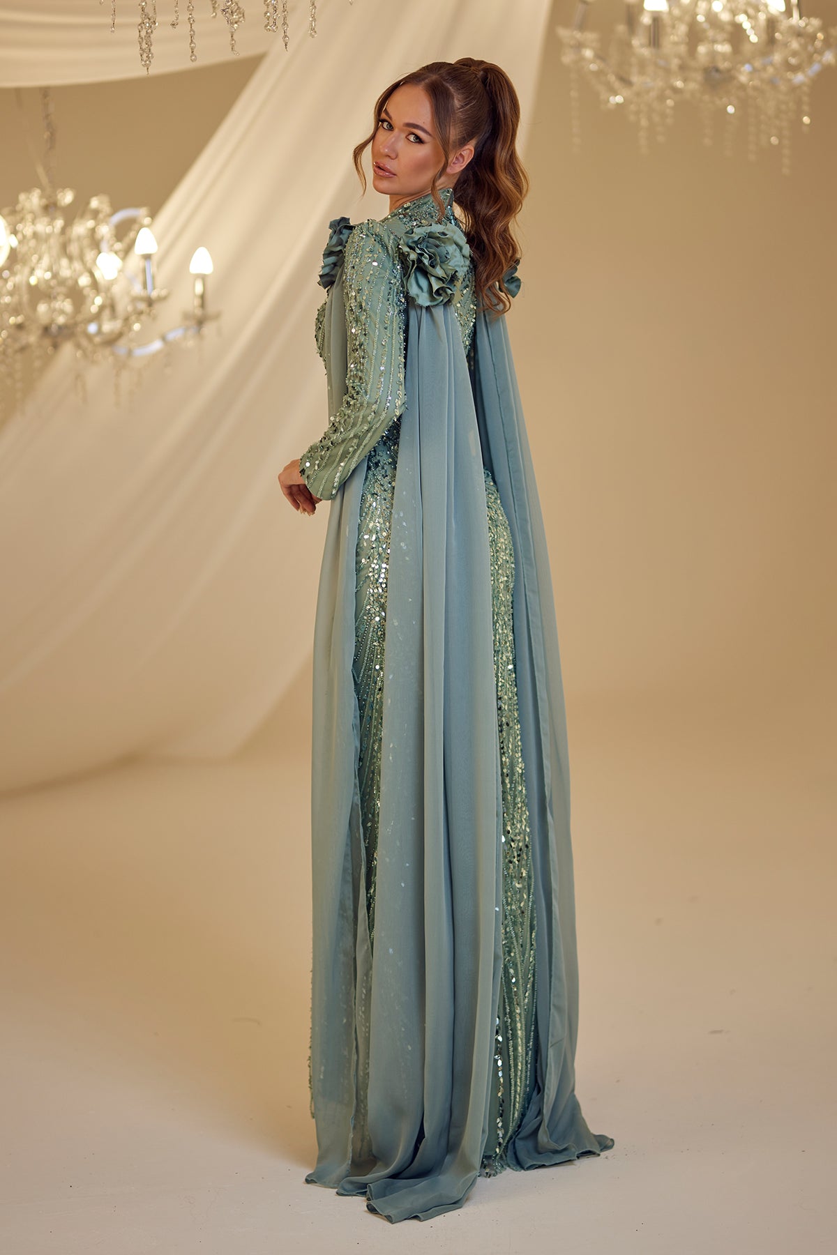Omuzdan çiçek detalı ve pelerinli olan boncuk işlemeli mihrimah abiye modelimiz arkadan gizli fermuarlı olup astarlıdır.