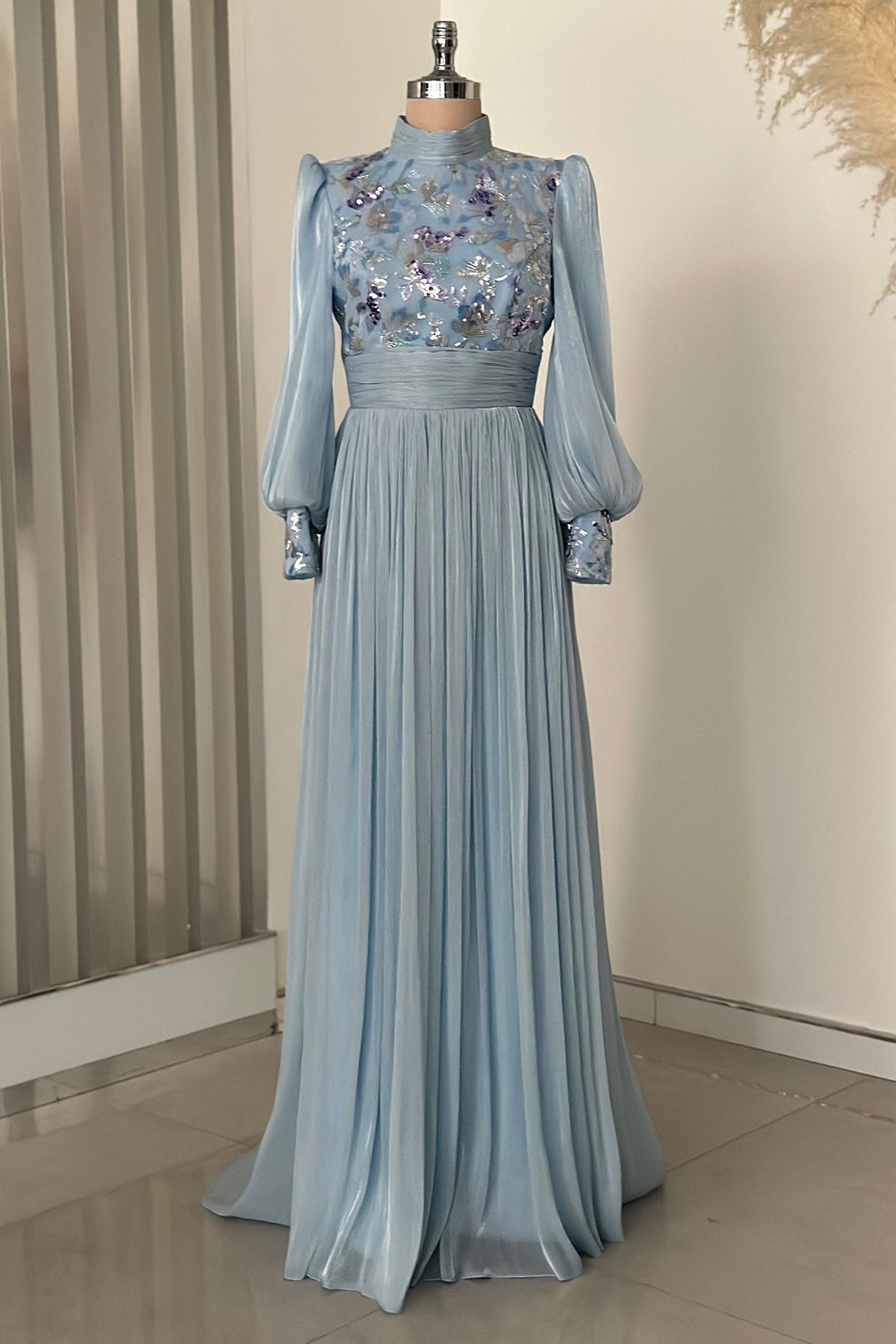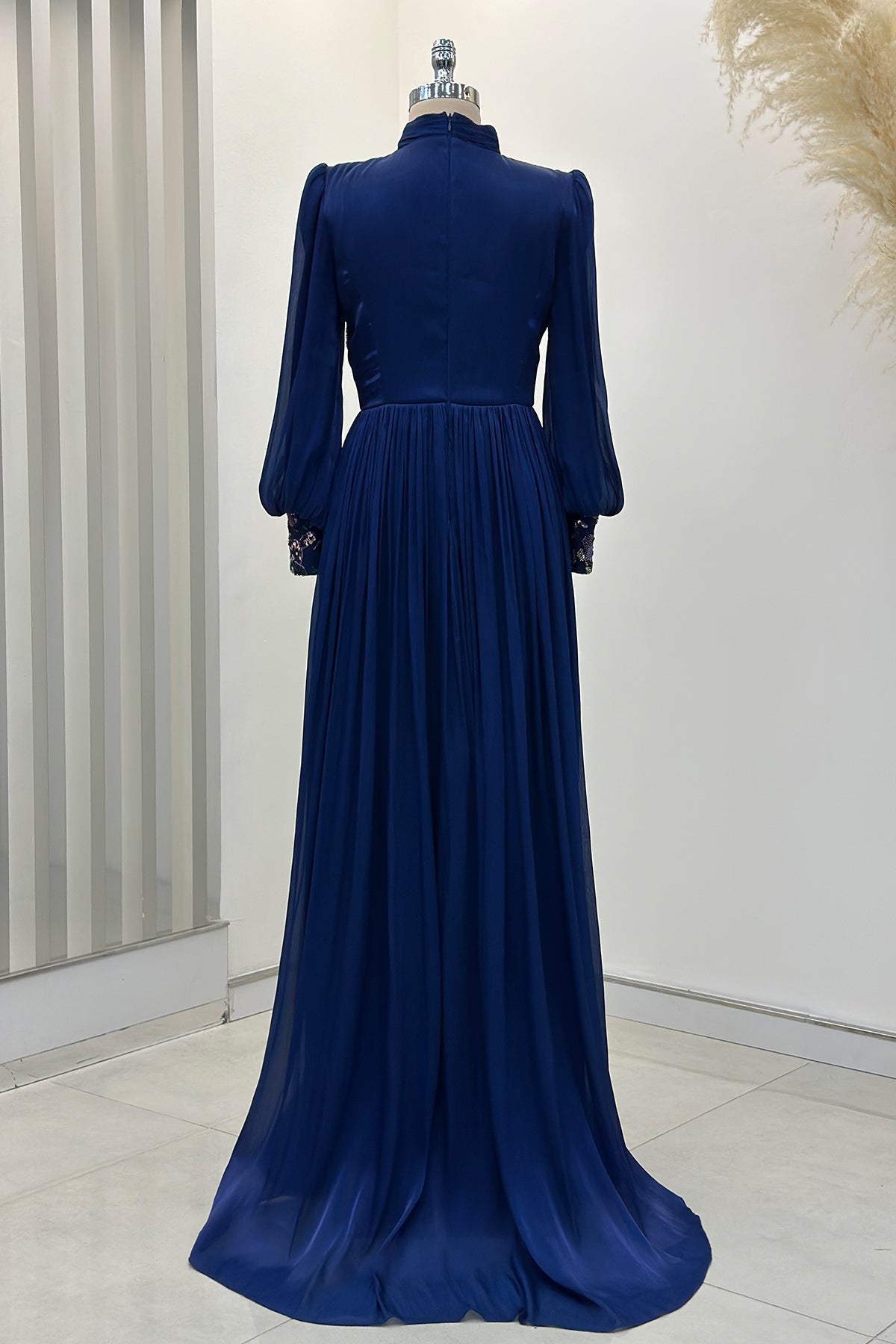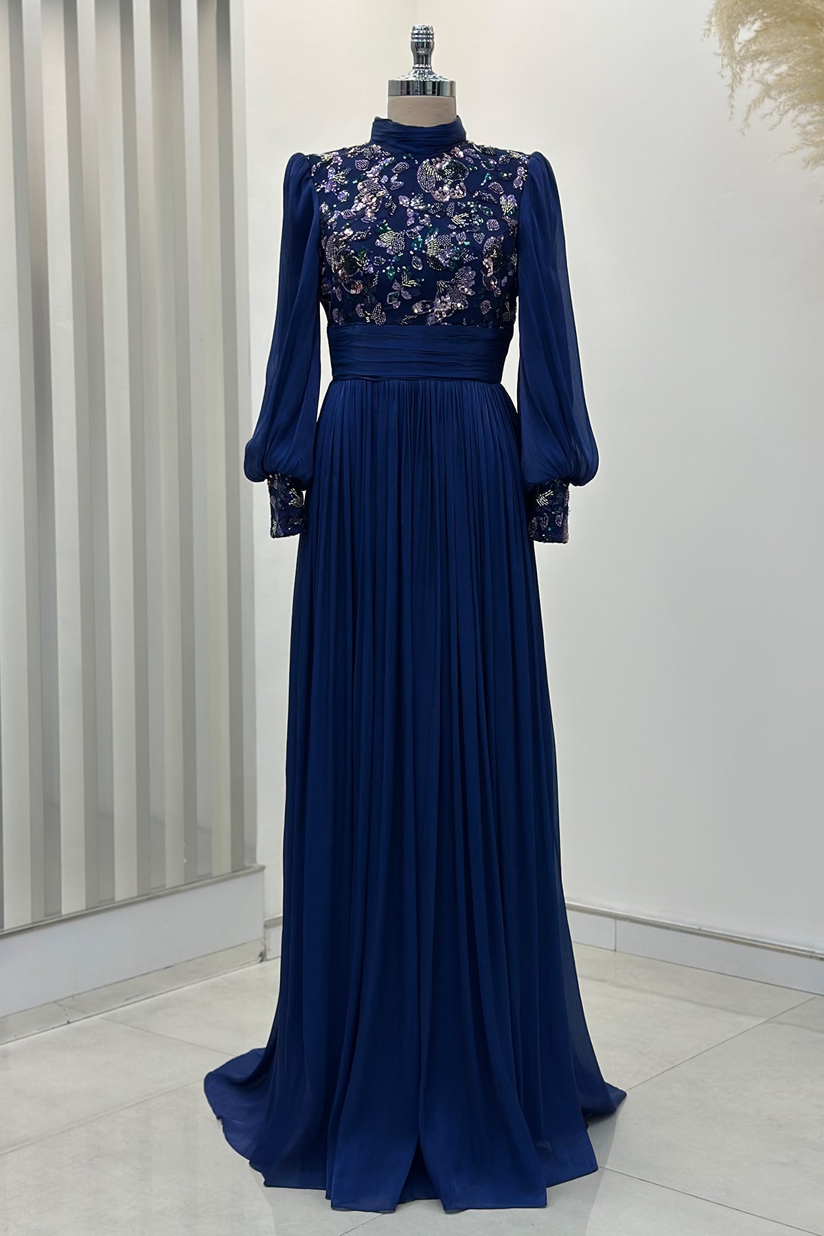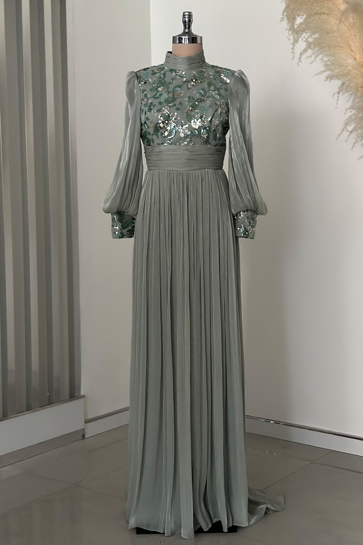 Amerikan şifon kumaş ve üst kısmında boncuk işlemesi ve balon kol tasarım olan nadia abiye modelimiz arkadan gizli fermuarlı olup astarlıdır.