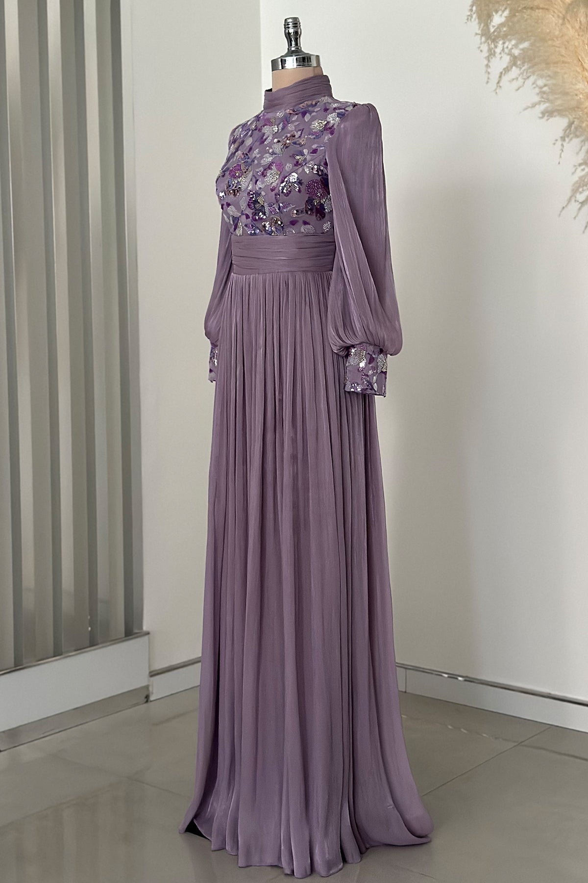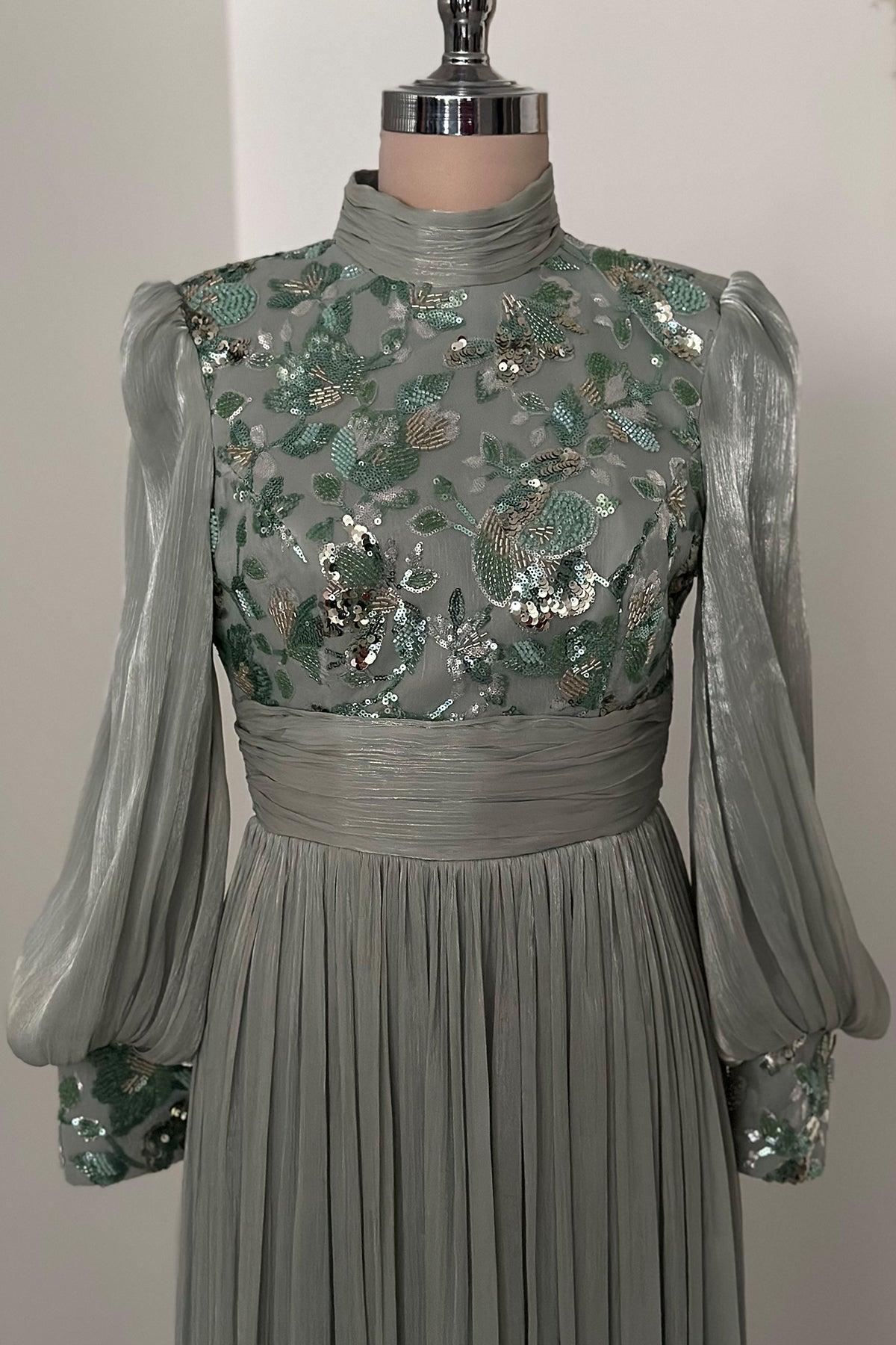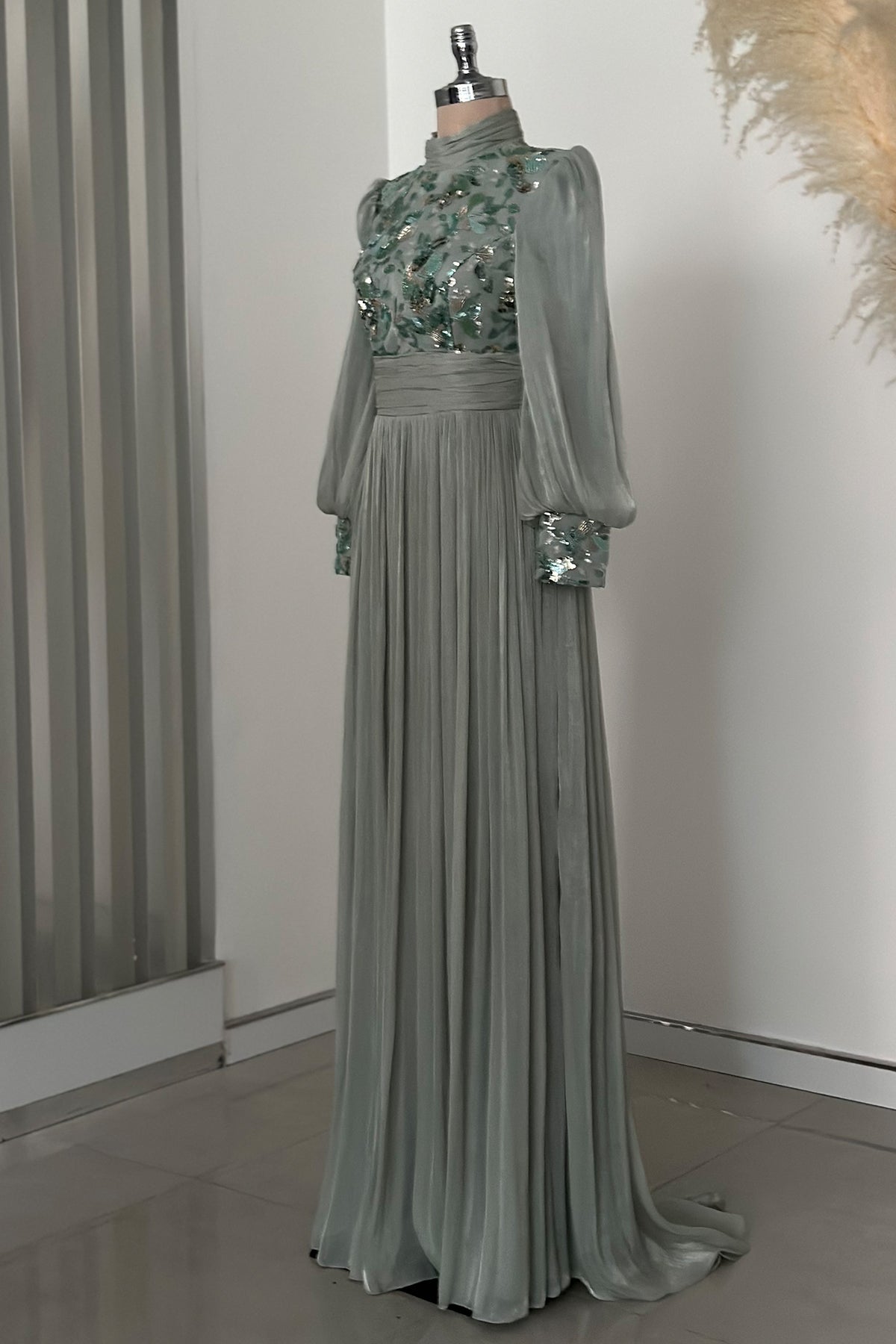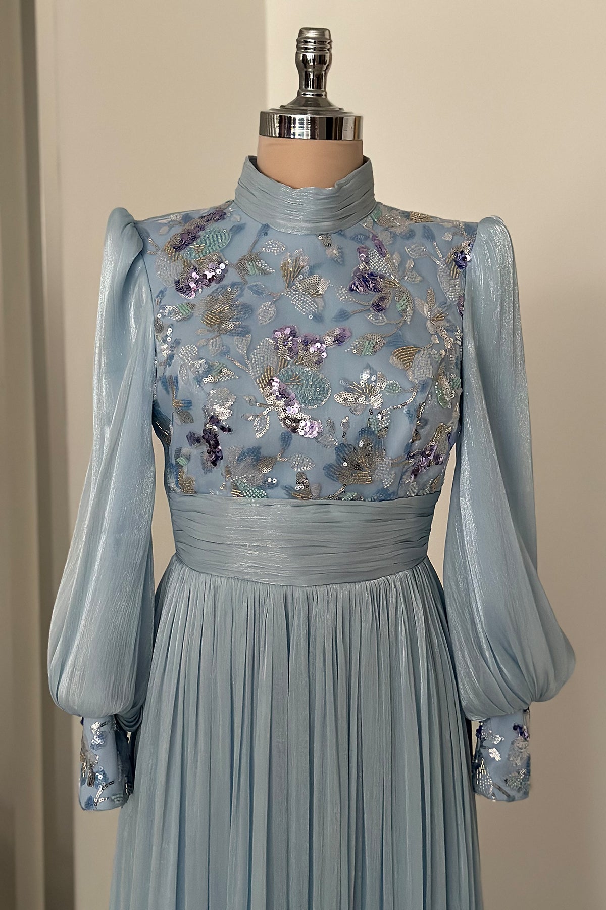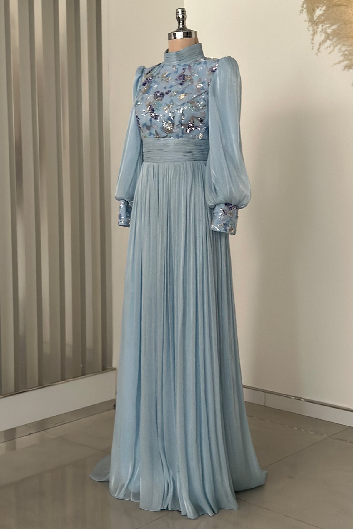 Amerikan şifon kumaş ve üst kısmında boncuk işlemesi ve balon kol tasarım olan nadia abiye modelimiz arkadan gizli fermuarlı olup astarlıdır.