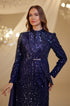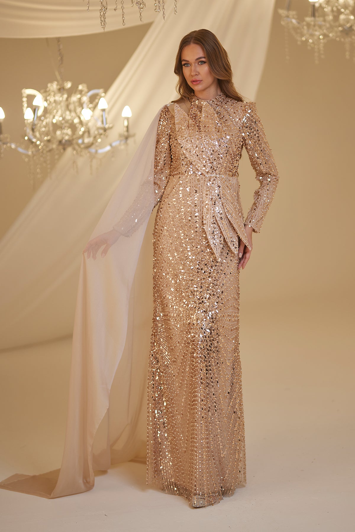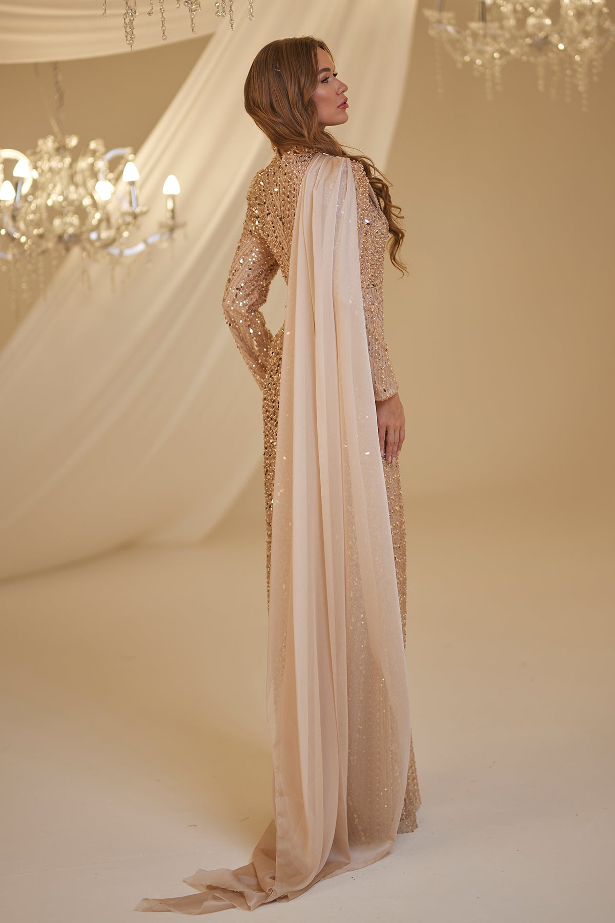 Omuzu tül pelerin detaylı önü yaprak desenli olan adel tesettür abiye modelimizin tamamı boncuk kumaş olup arkadan gizli fermuarlı ve astarlıdır.
