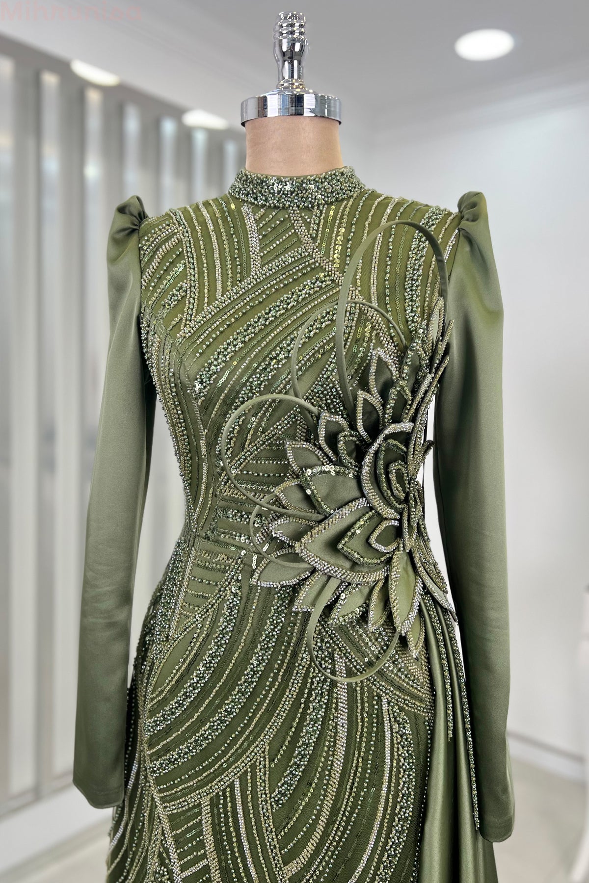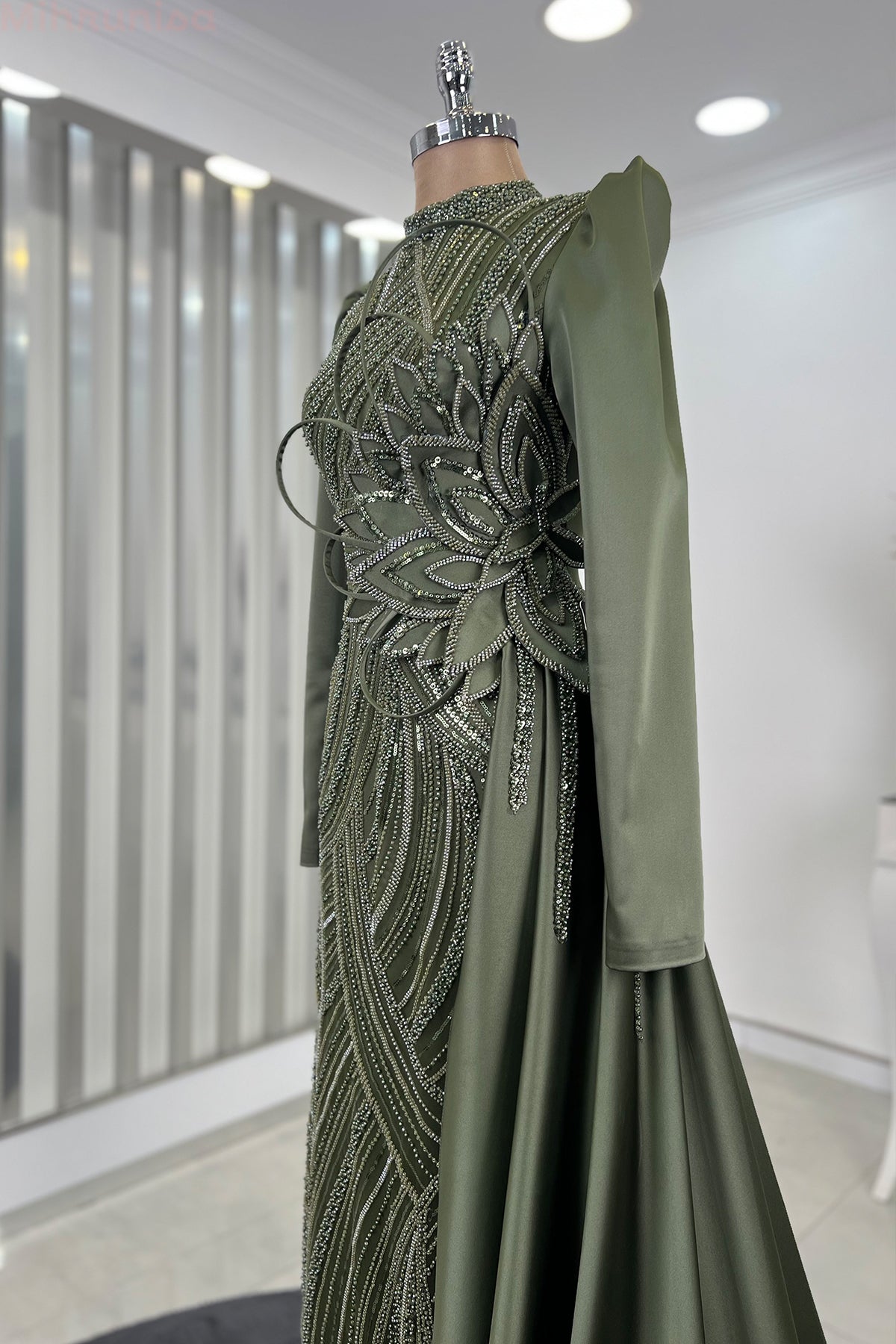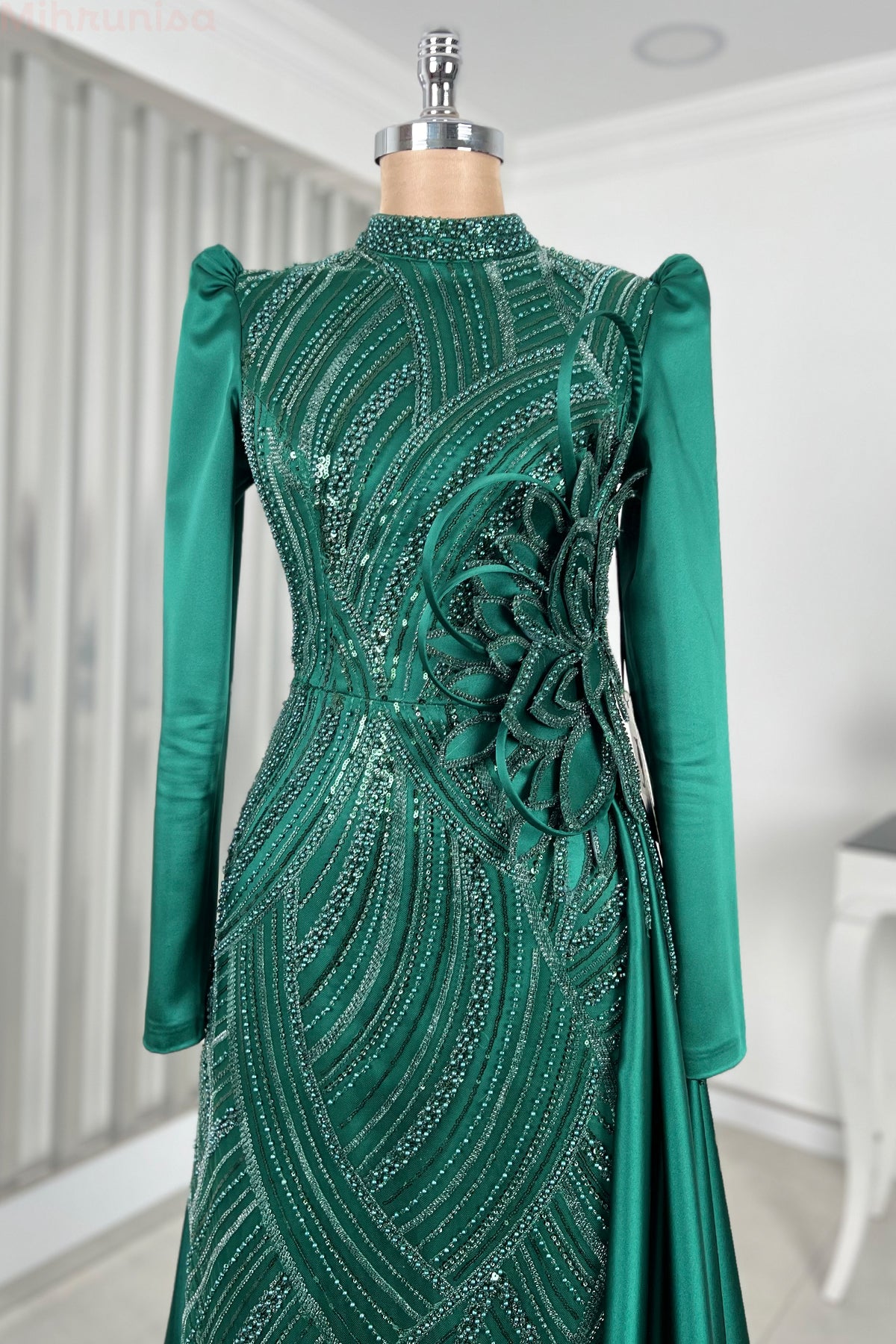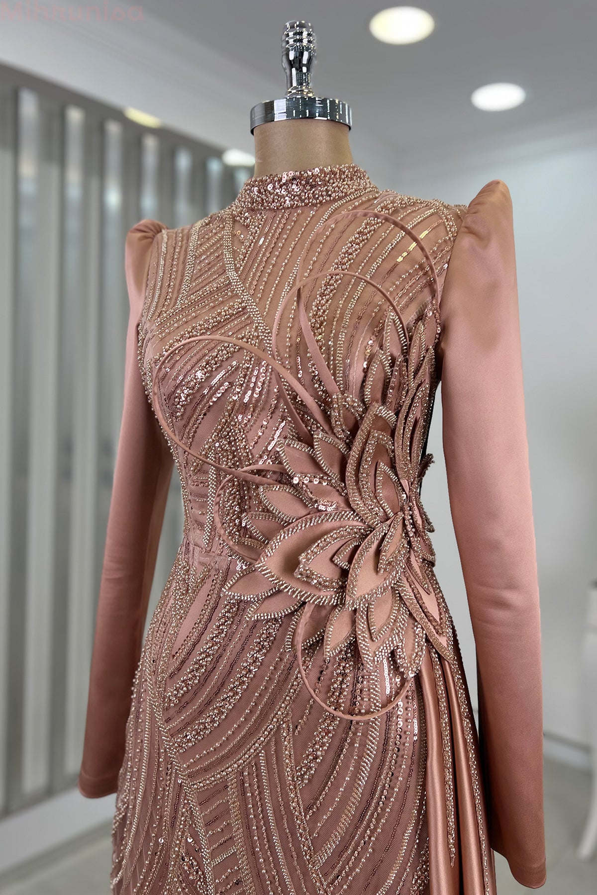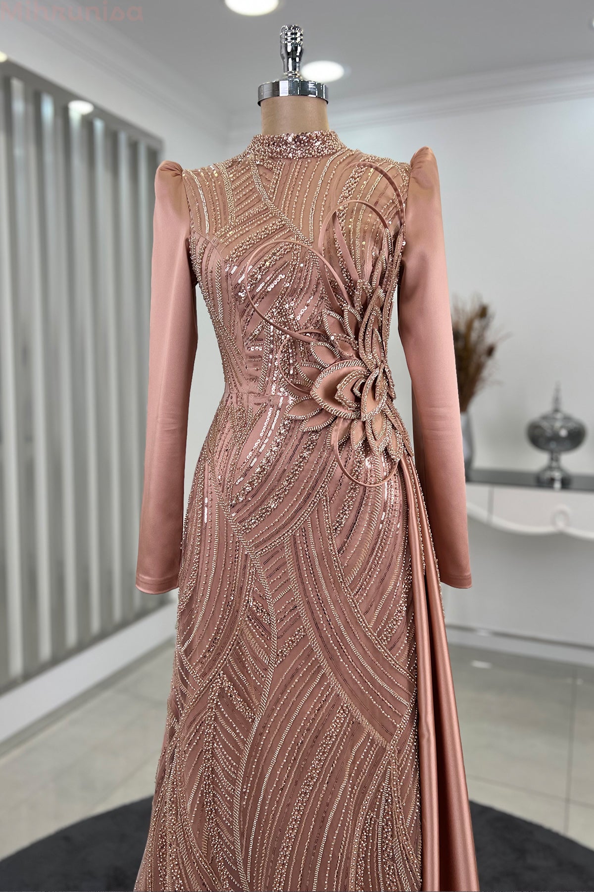 Belinde özel işleme çiçek detayı olan yaprak abiye modelimizin önü tamamen boncuk işlemeli olup astarlıdır ve arkadan gizli fermuarlıdır.