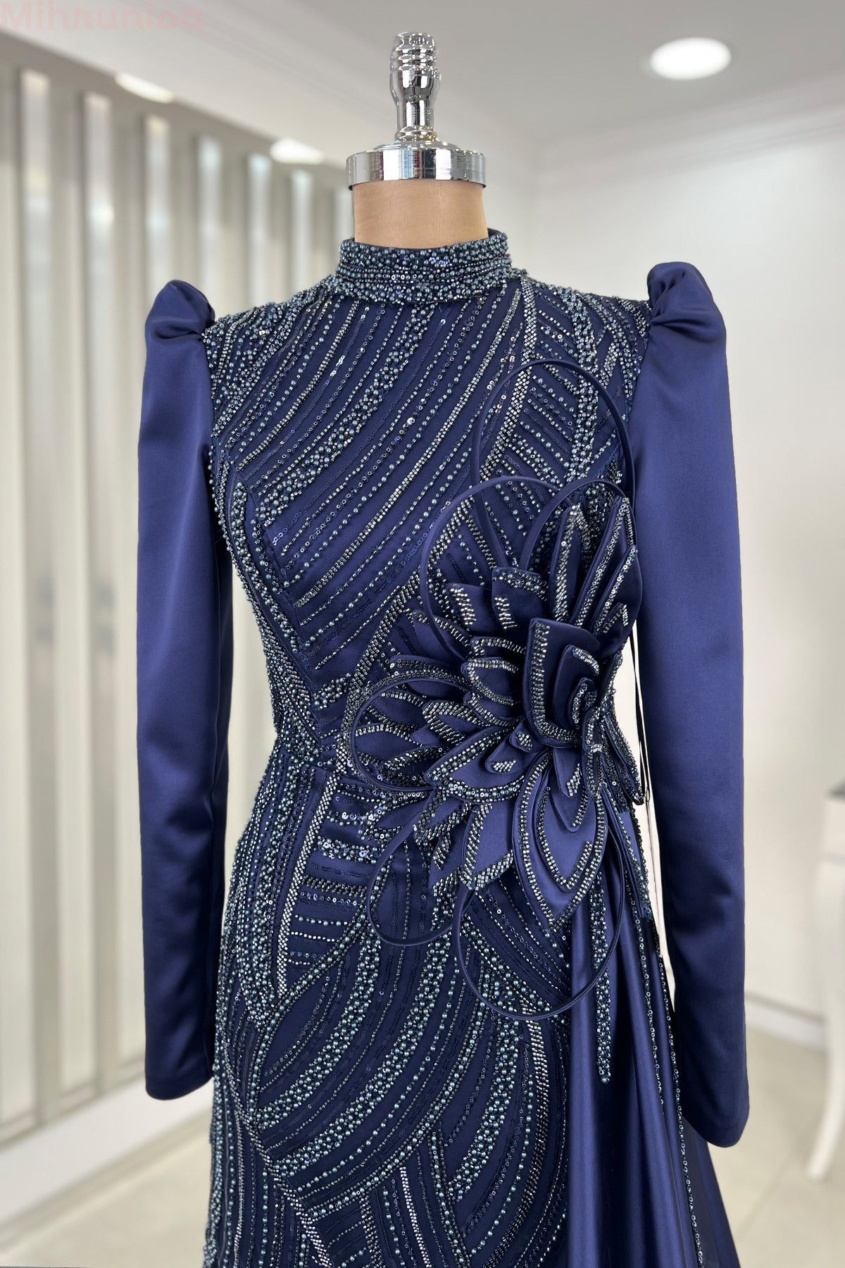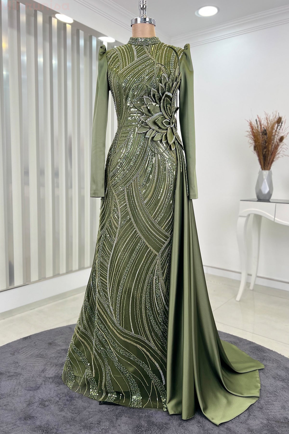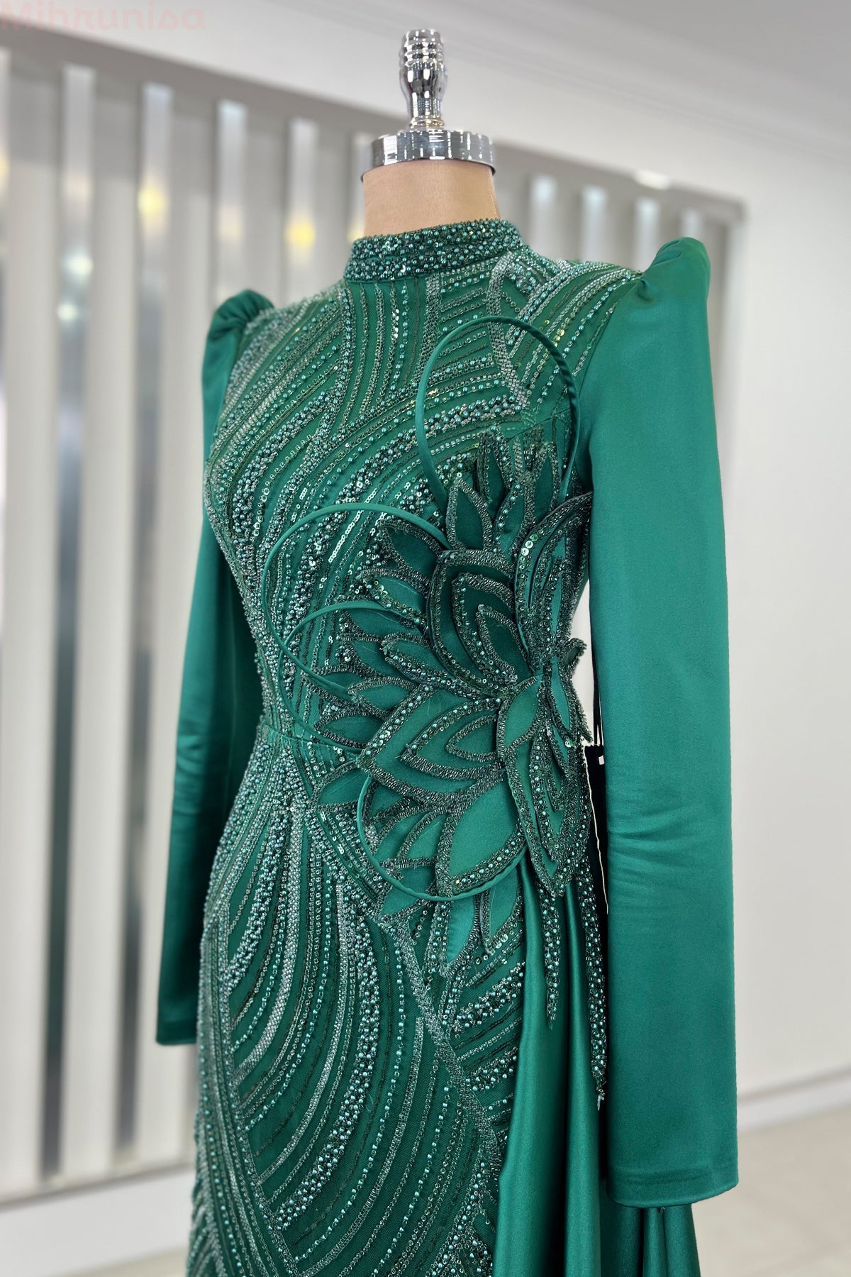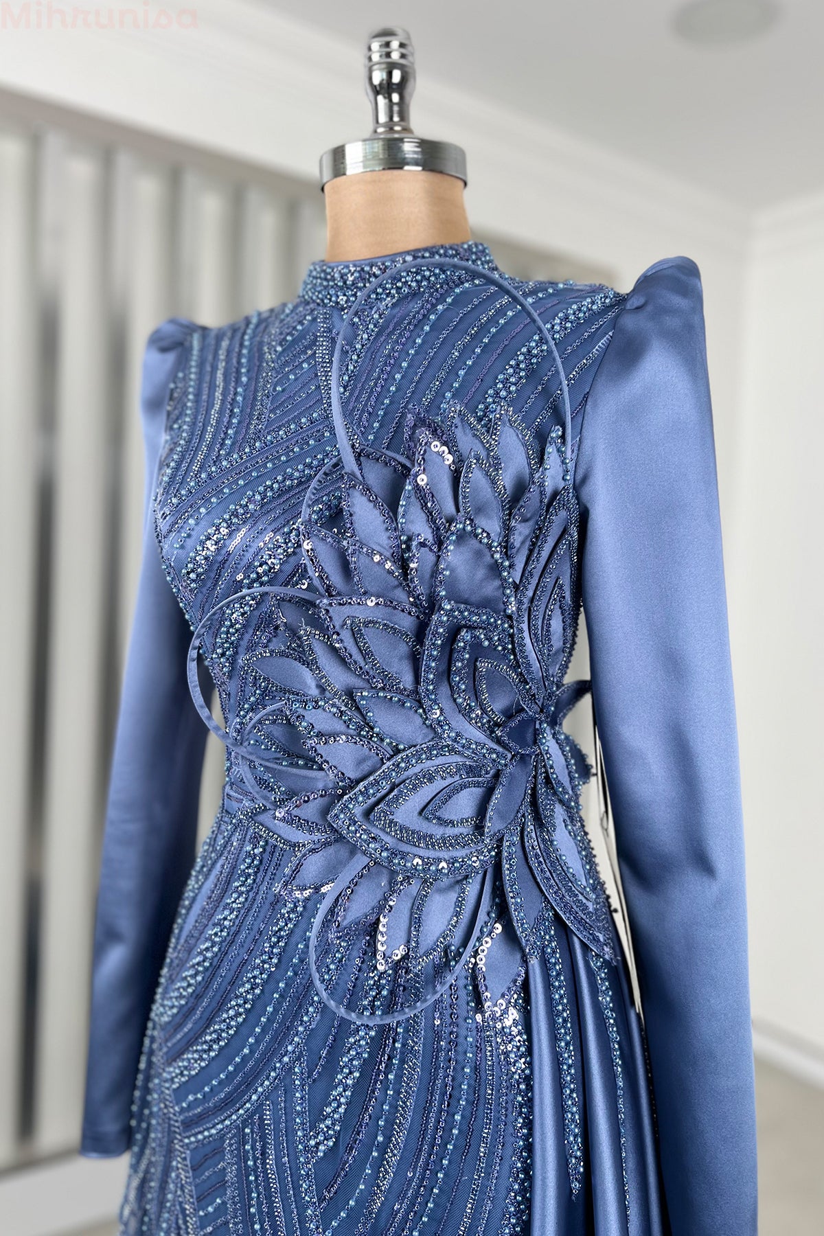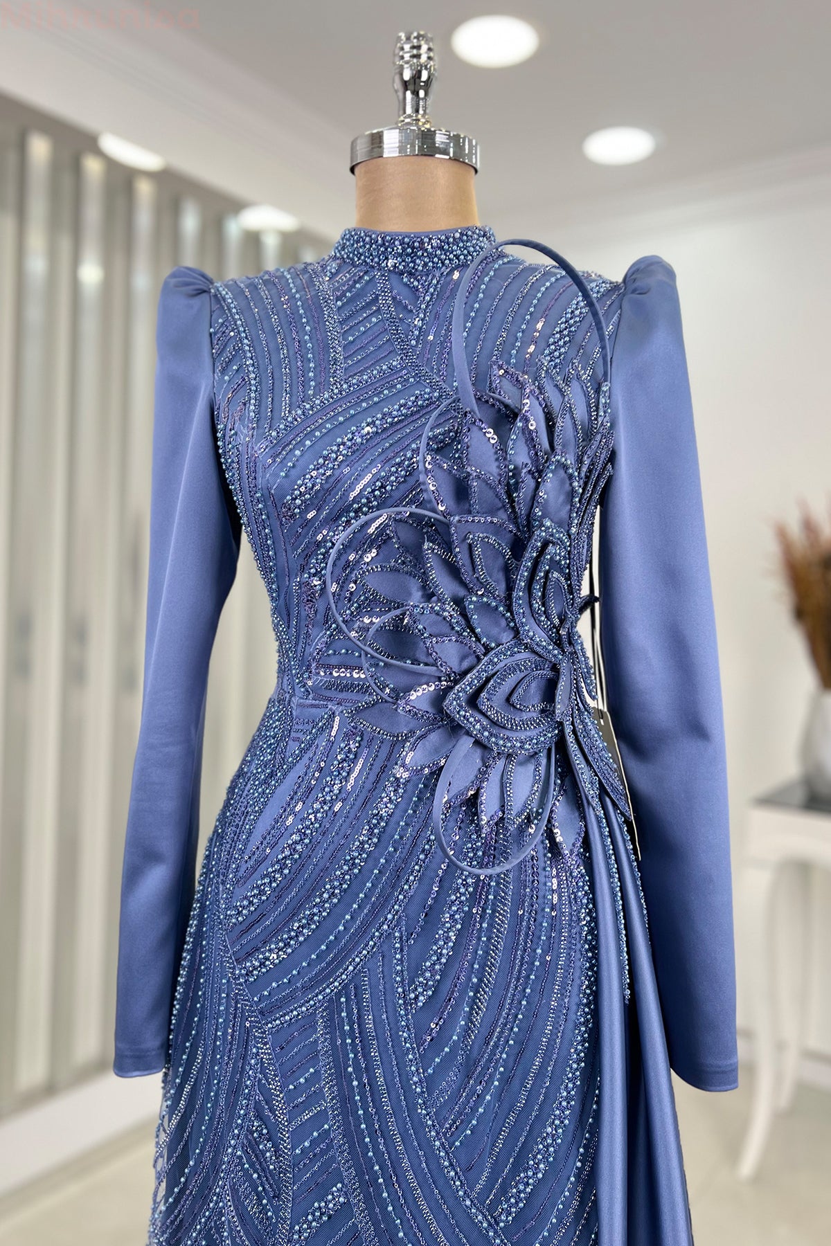 Belinde özel işleme çiçek detayı olan yaprak abiye modelimizin önü tamamen boncuk işlemeli olup astarlıdır ve arkadan gizli fermuarlıdır.