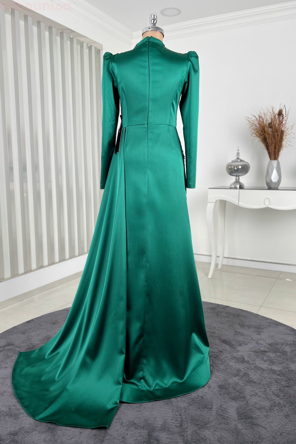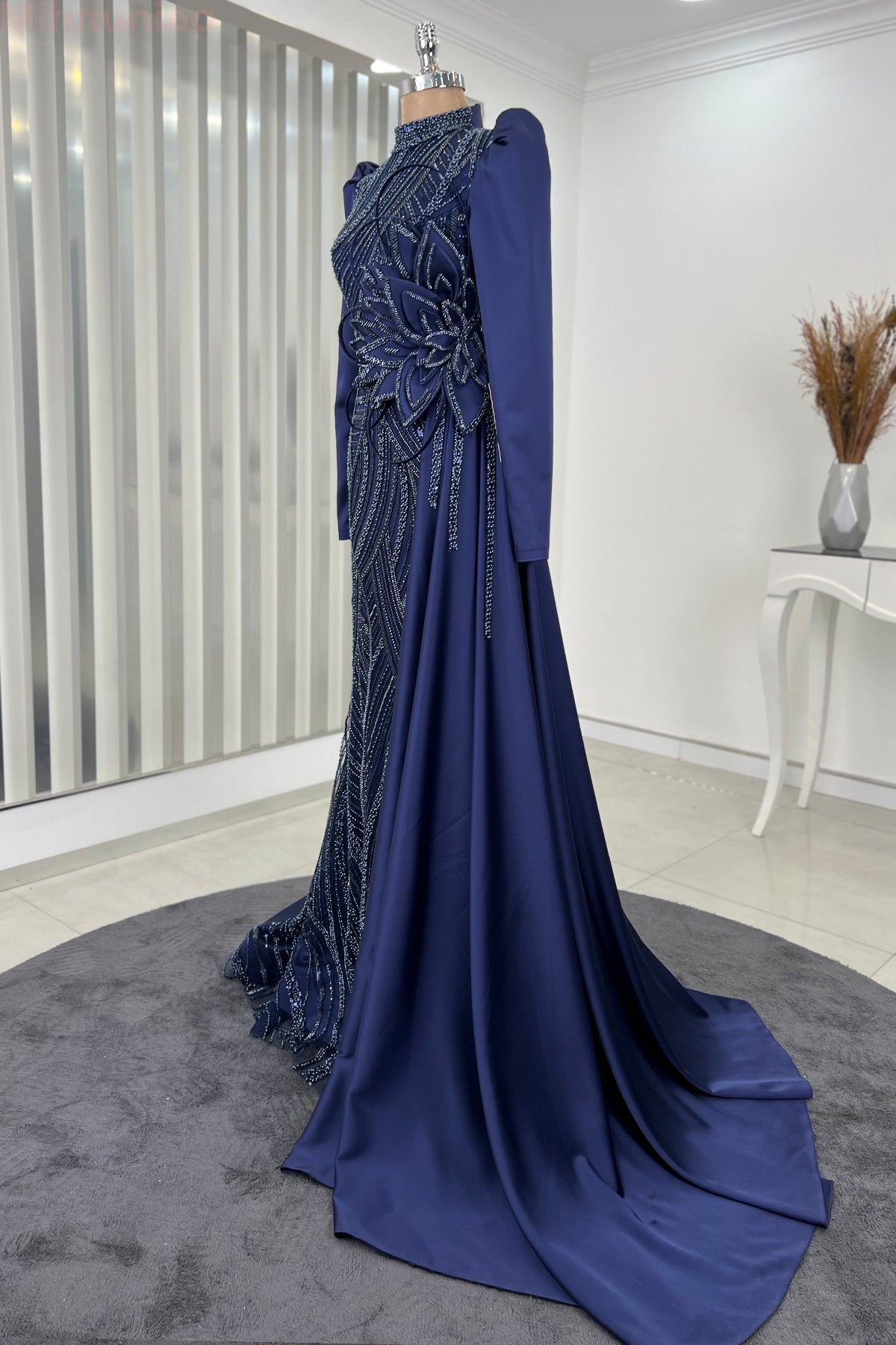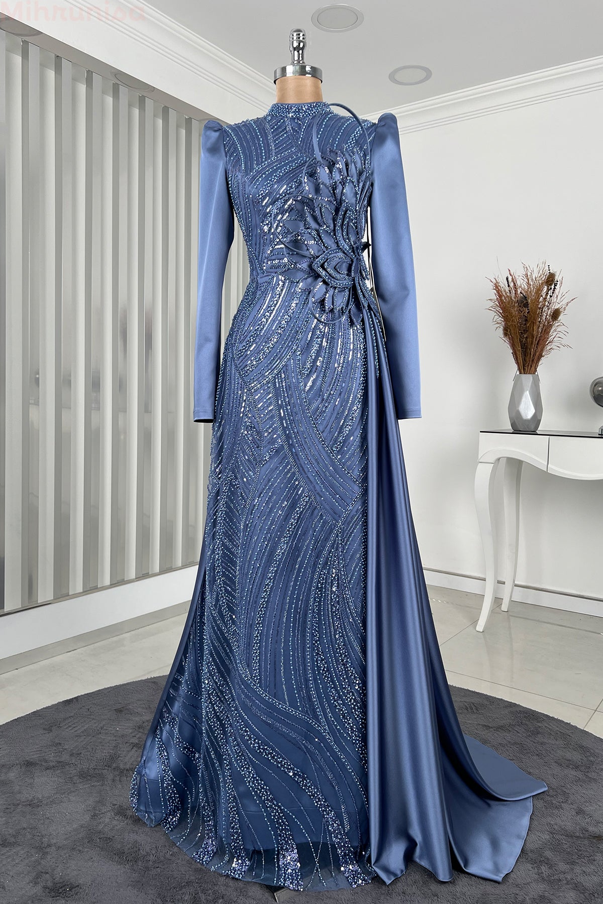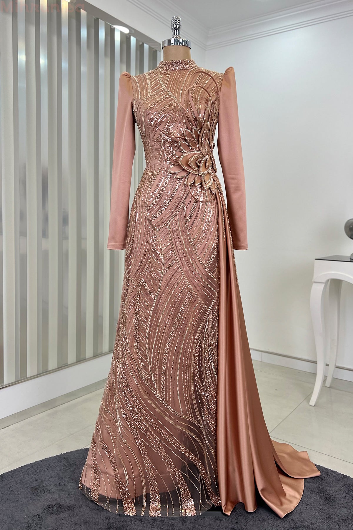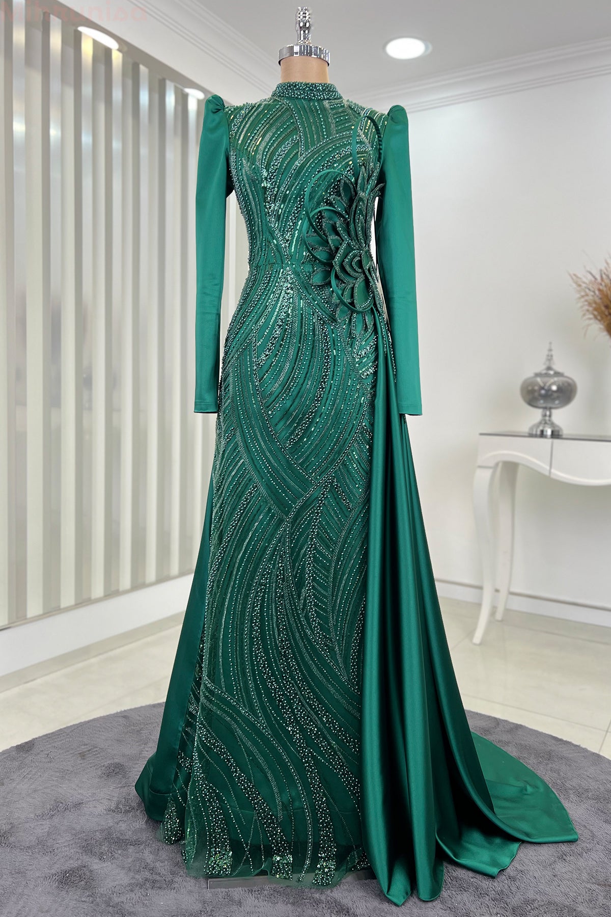 Belinde özel işleme çiçek detayı olan yaprak abiye modelimizin önü tamamen boncuk işlemeli olup astarlıdır ve arkadan gizli fermuarlıdır.