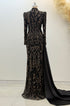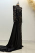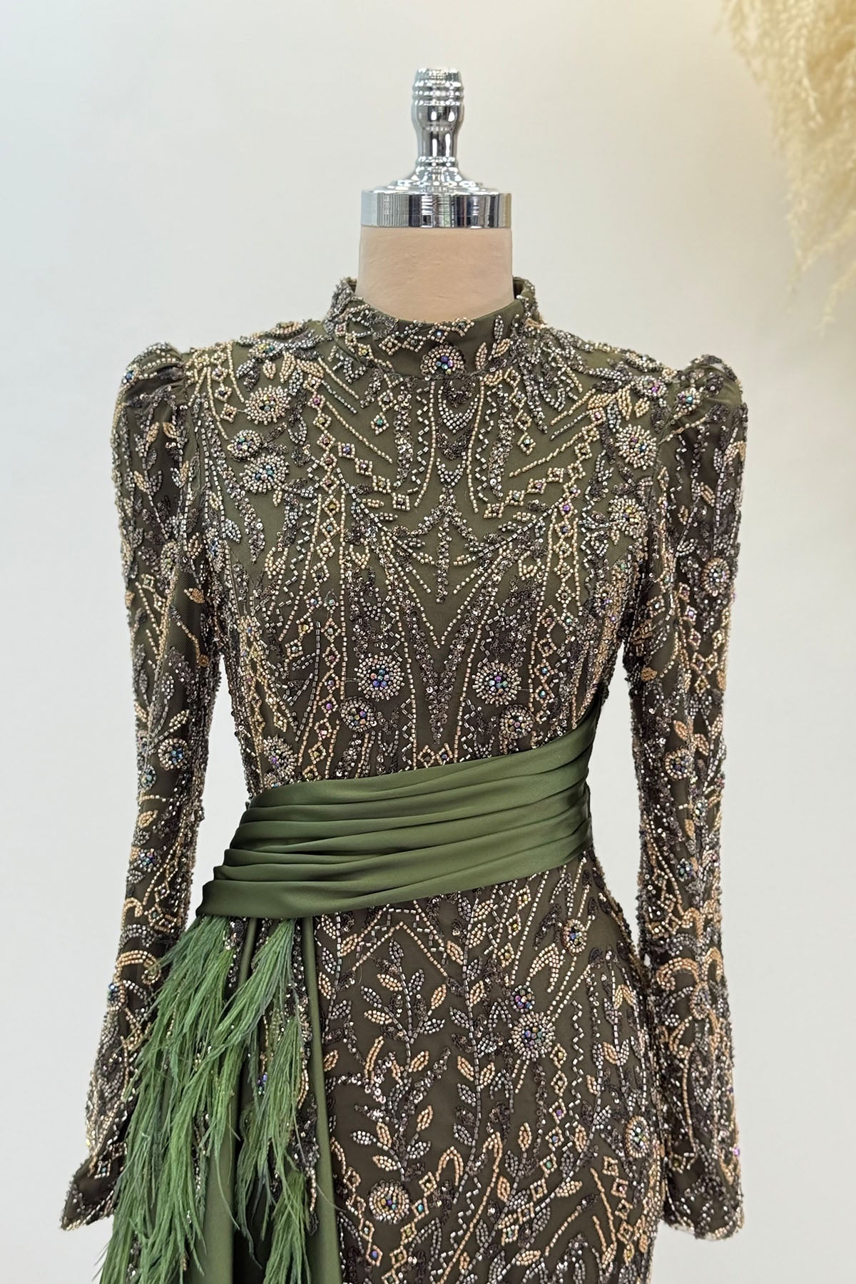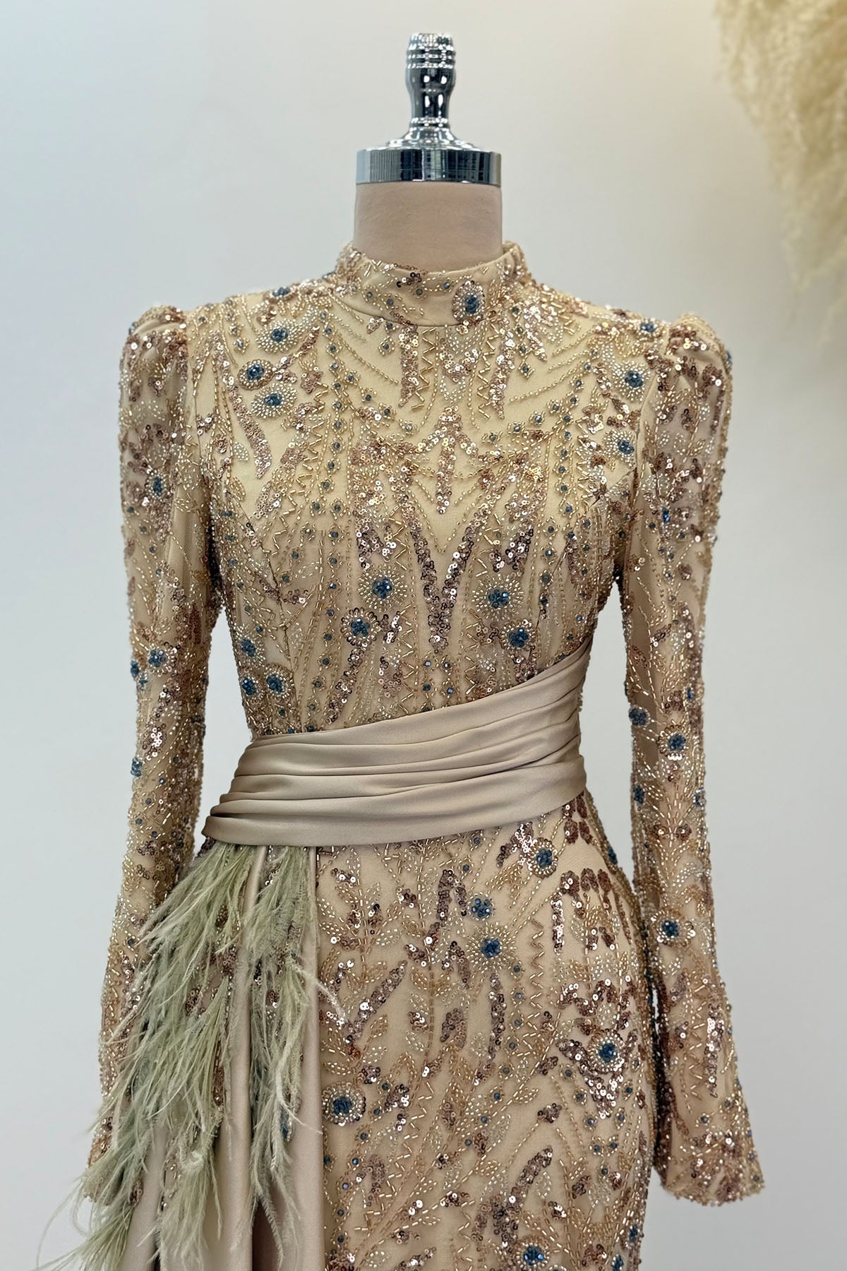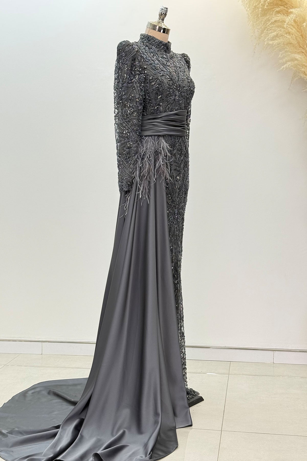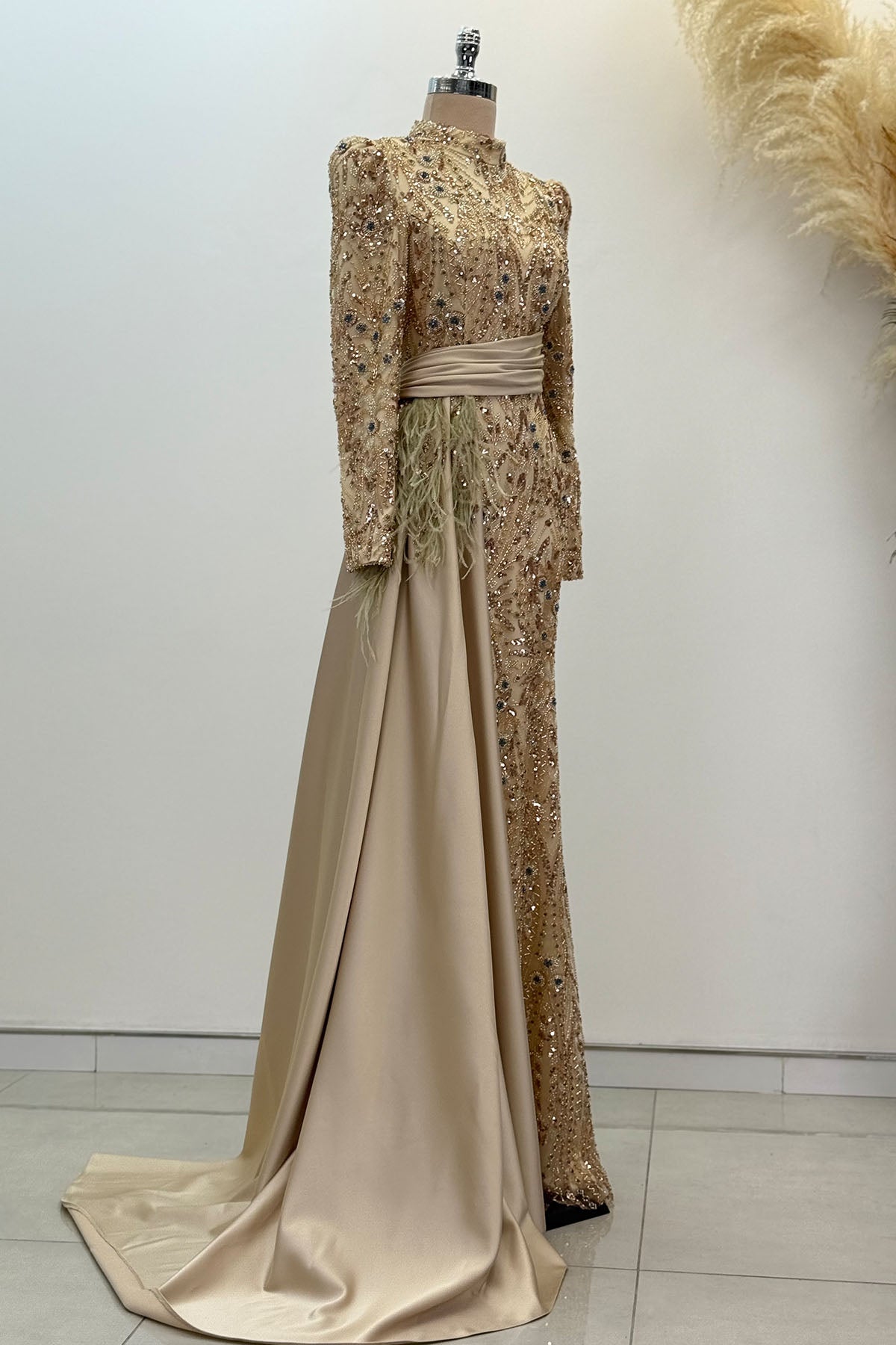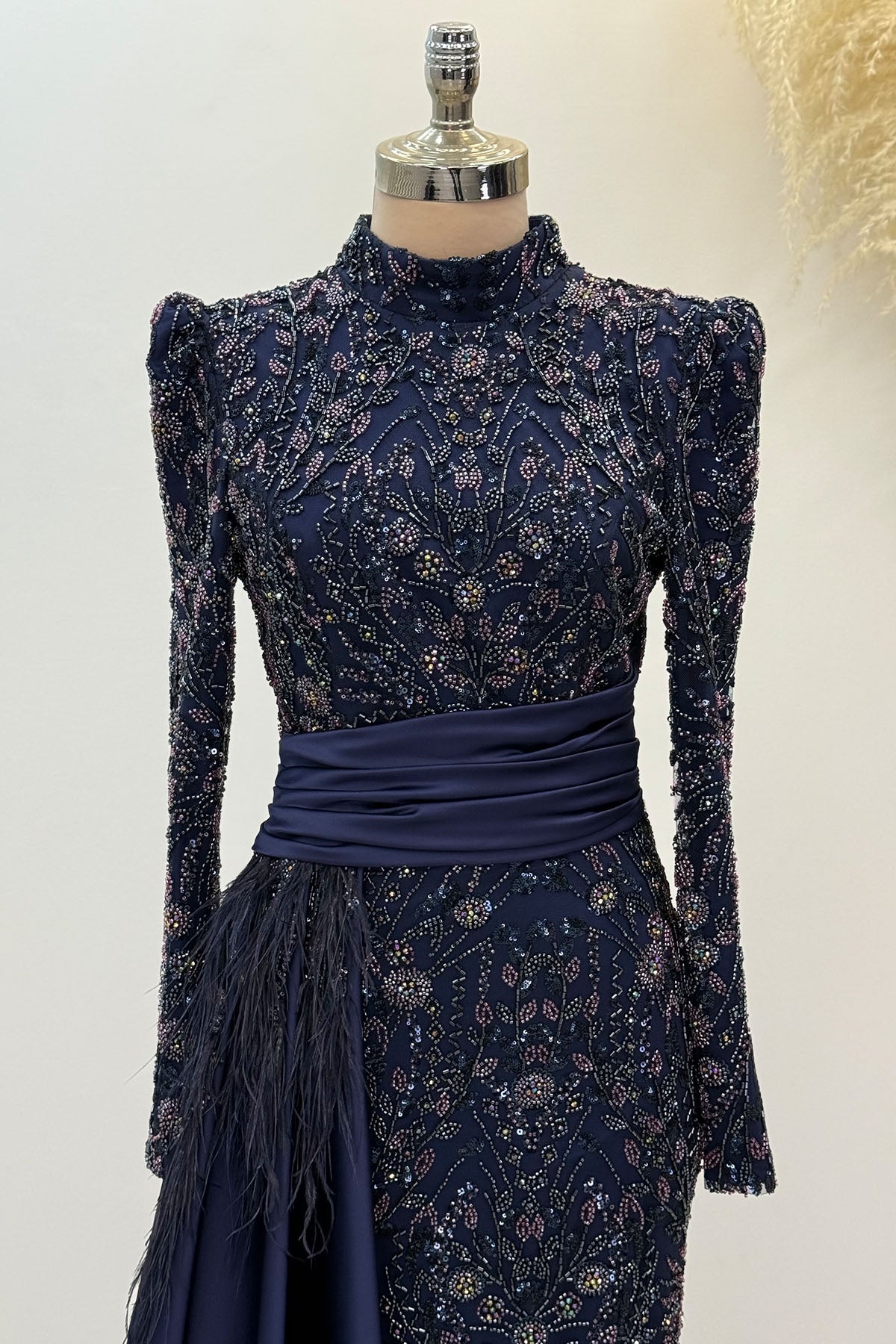 Tamamı cam boncuk işlemeli zenna abiye modelimizin belinde tüylü kuyruk detay olup astarlıdır ve arkadan gizli fermuarlıdır.