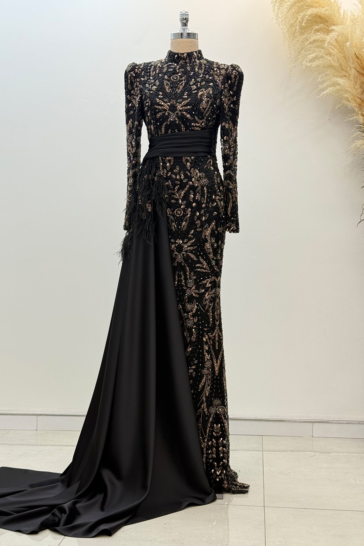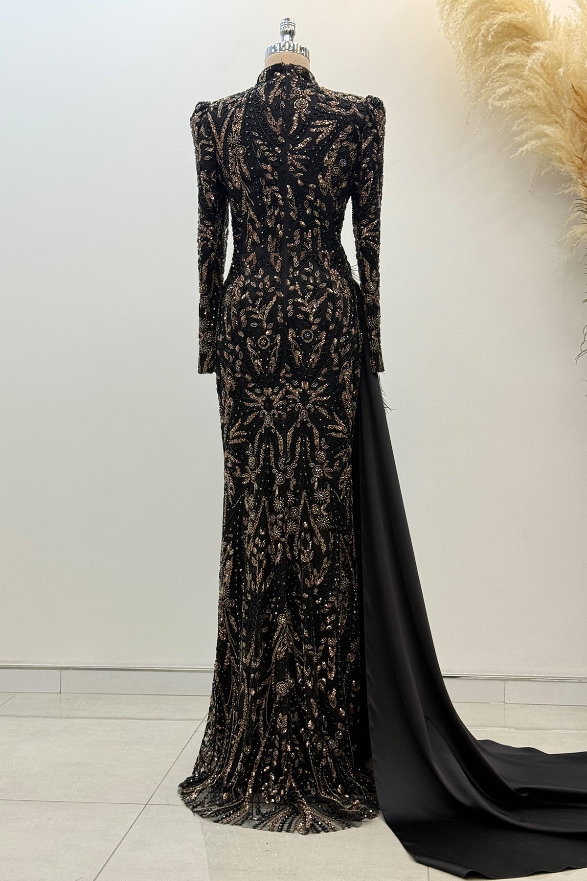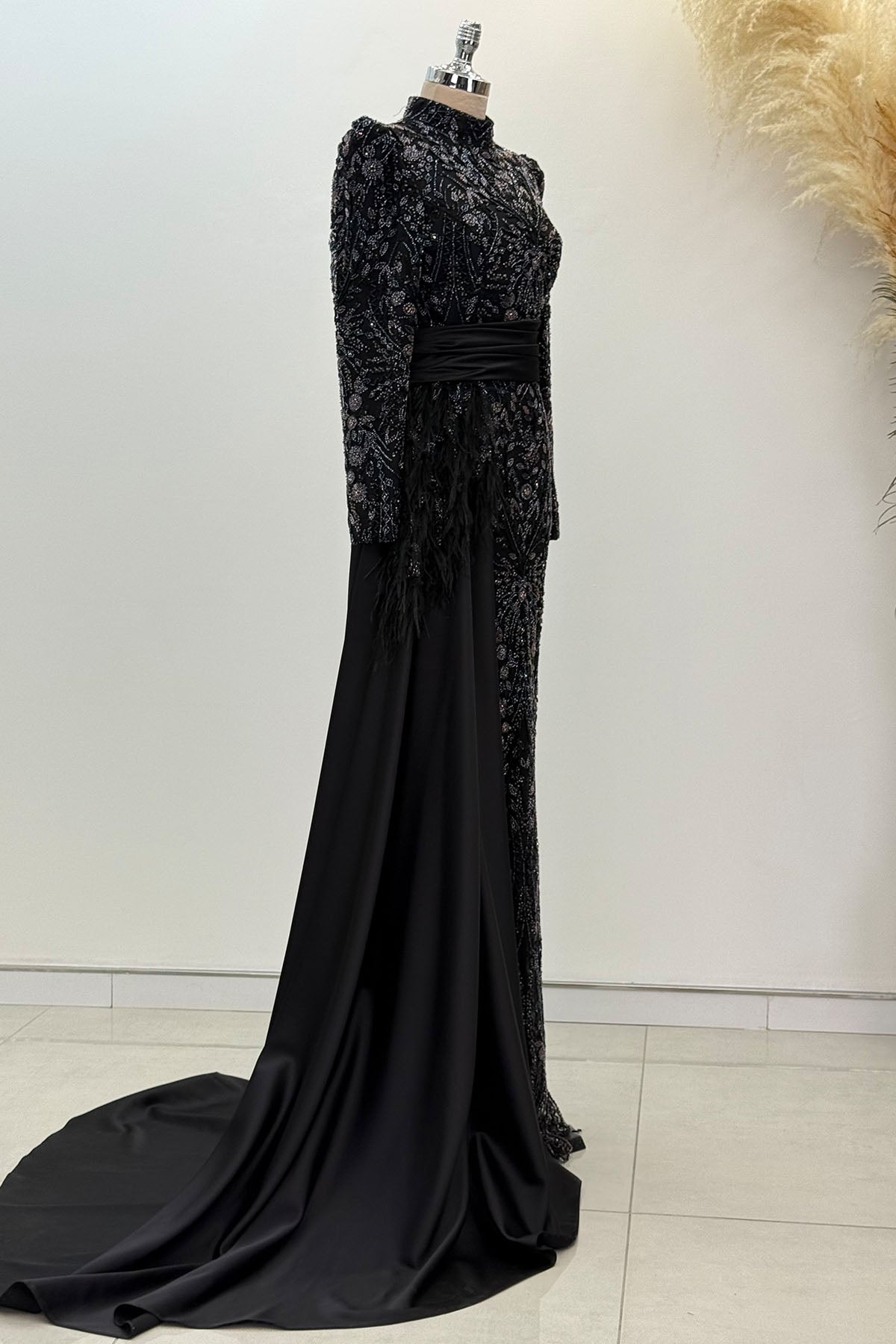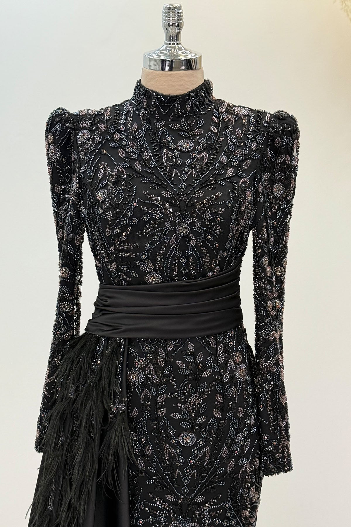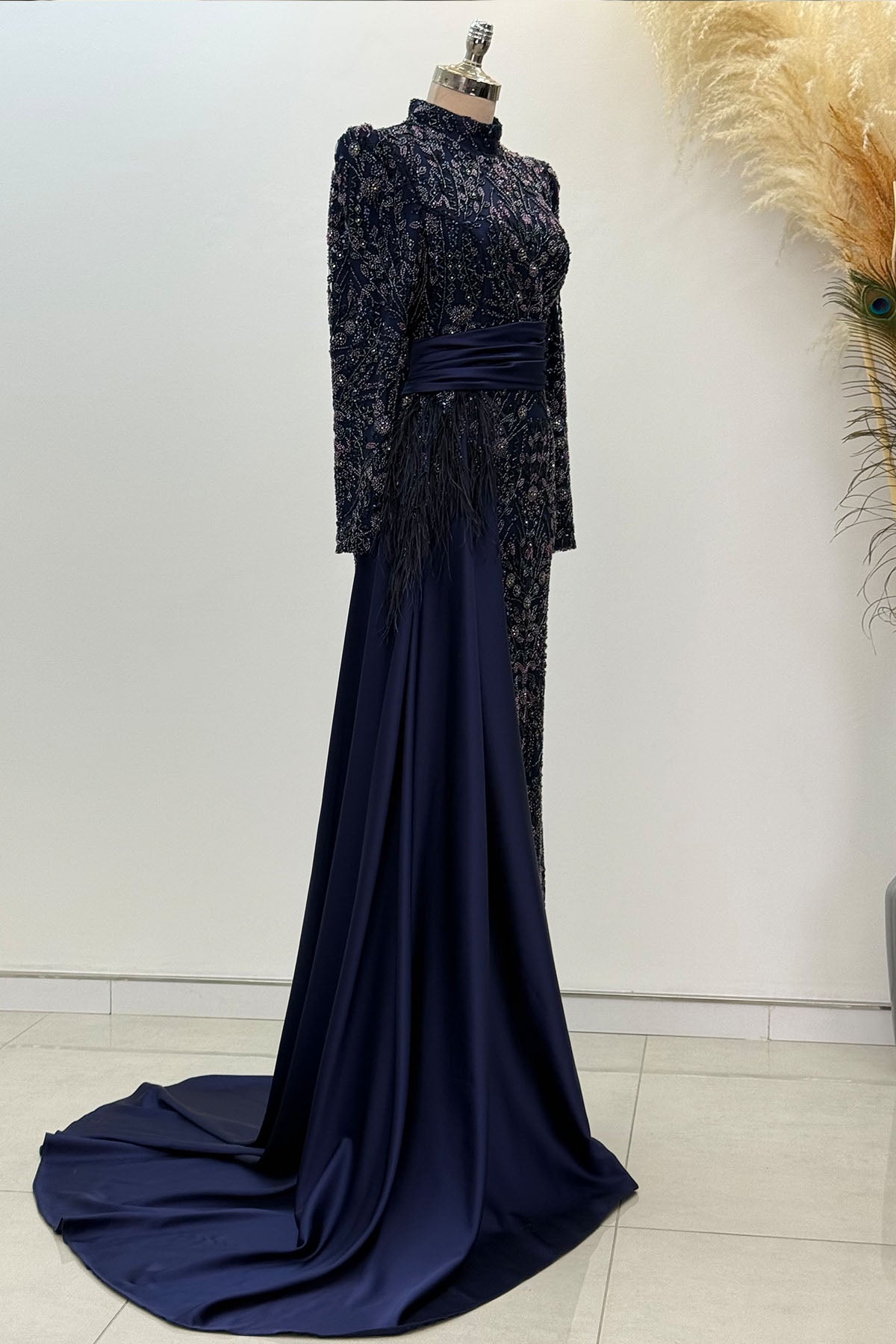 Tamamı cam boncuk işlemeli zenna abiye modelimizin belinde tüylü kuyruk detay olup astarlıdır ve arkadan gizli fermuarlıdır.