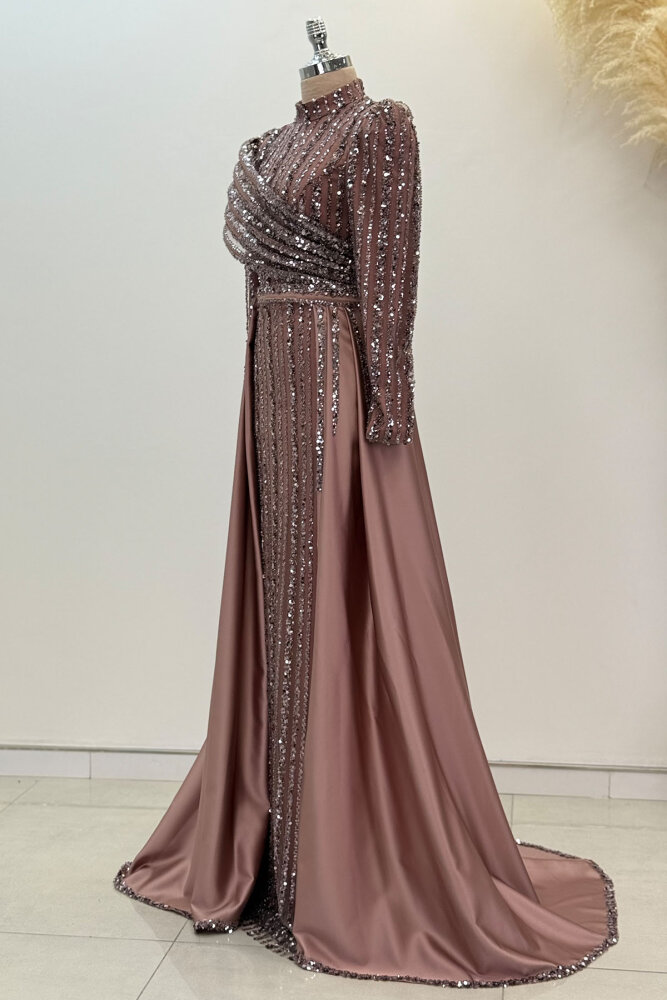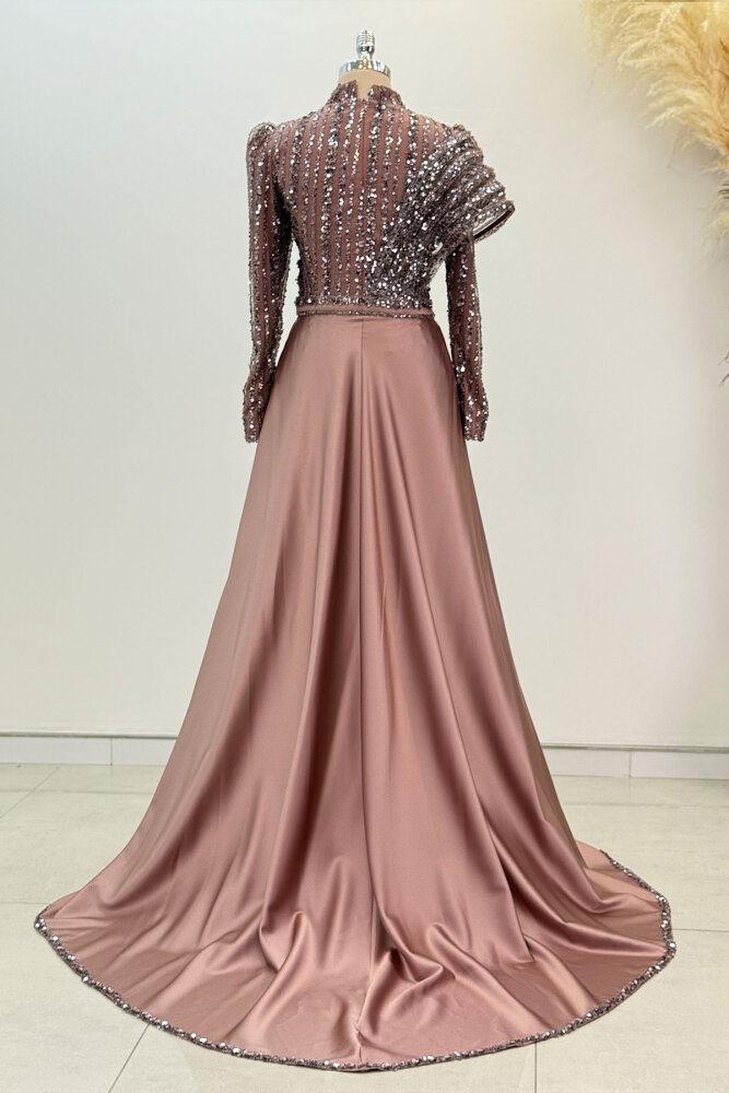 Our elegant evening gown model with shoulder detail features special embroidered bead and sequin design, has a train, and is equipped with a hidden zipper at the back.